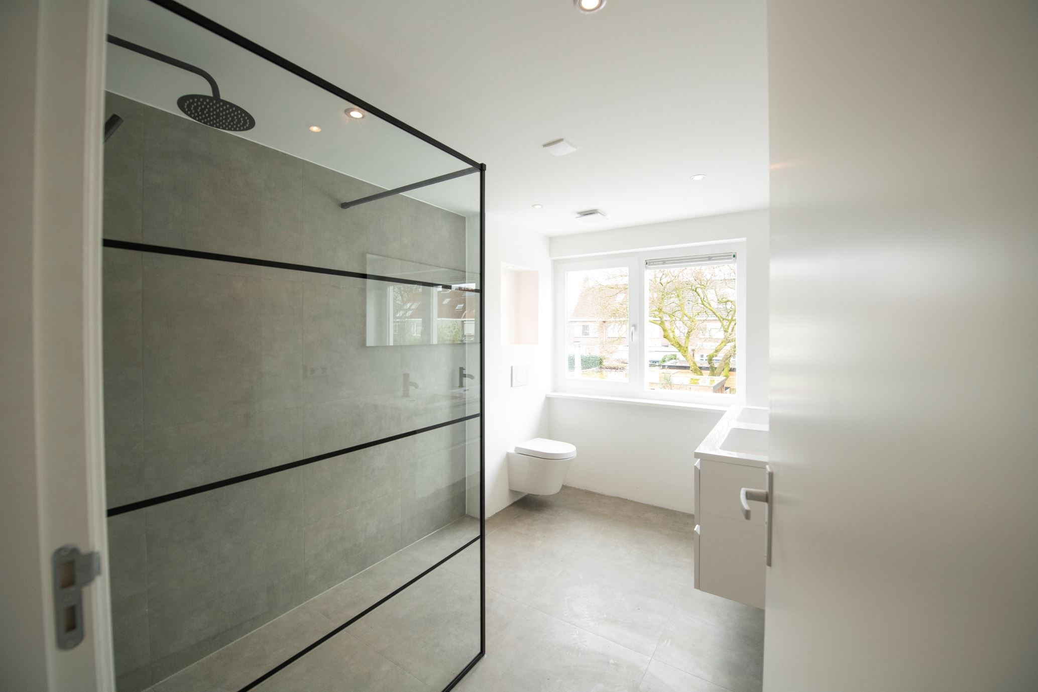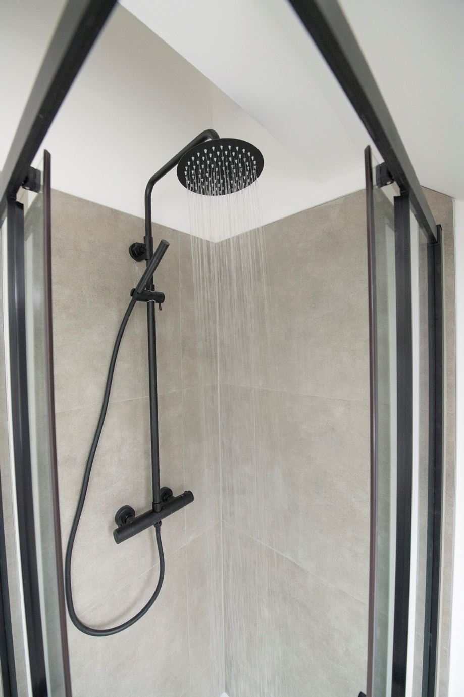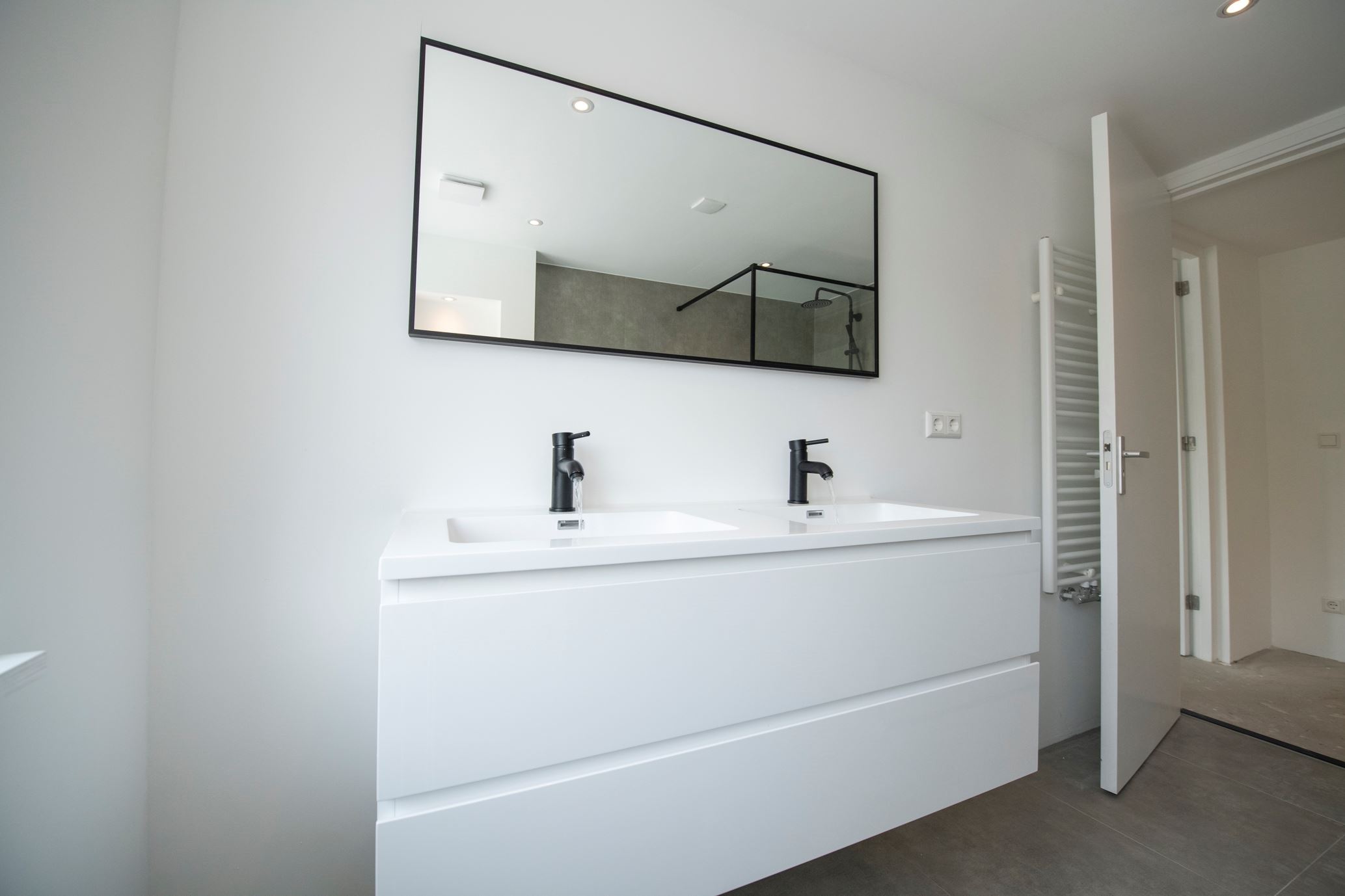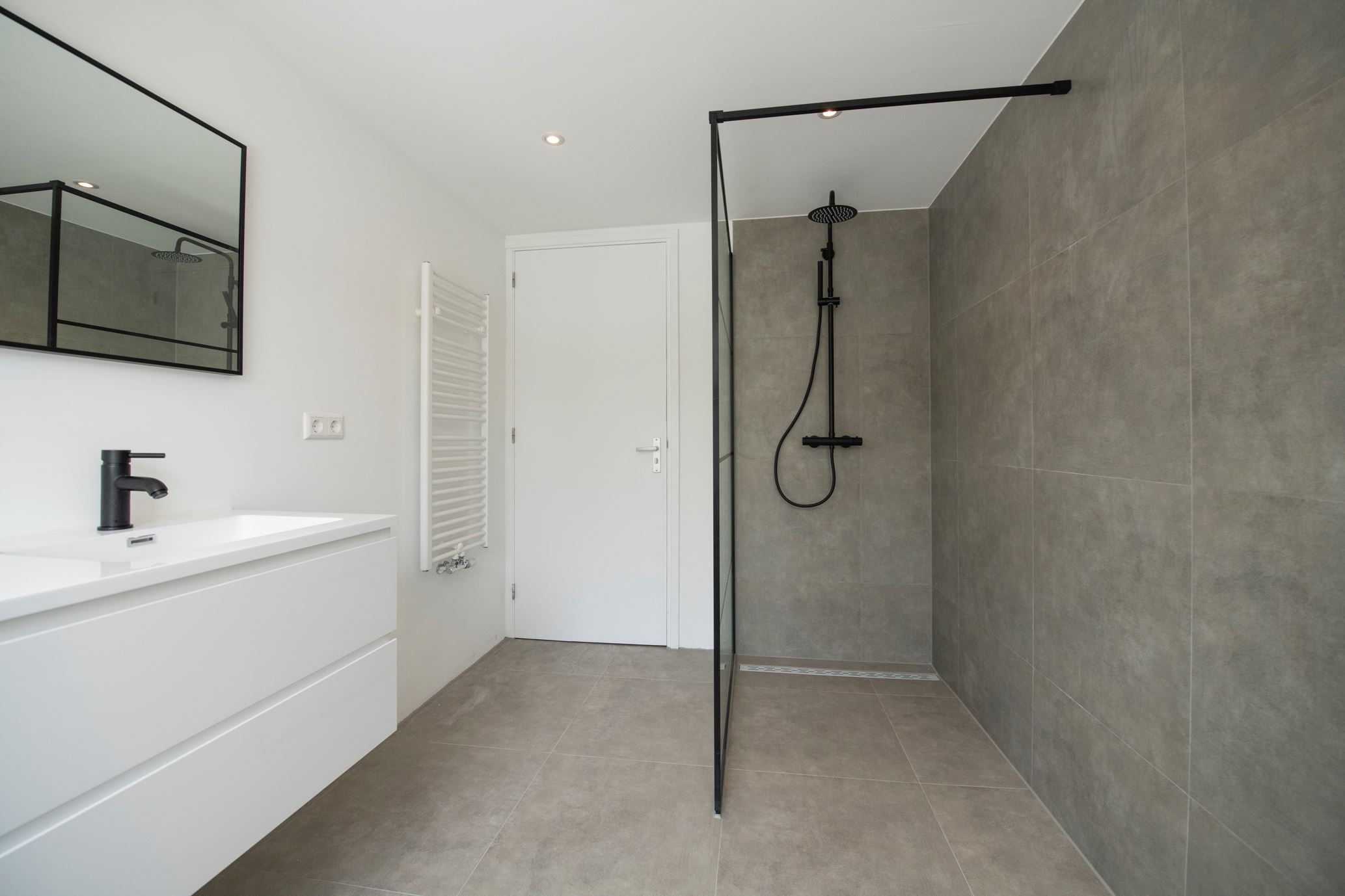 Eerste verdieping: Via de ruime overloop is er toegang tot 2 grote slaapkamers en de badkamer. De badkamer is geheel nieuw, inclusief inloopdouche, wastafel met spiegel, designradiator en toilet. De wanden zijn voorzien van stucwerk en strakke grijze tegels en op de vloer ligt een grote grijze tegel. De voorste slaapkamer heeft net als de living een erker die de kamer extra ruimte geeft.