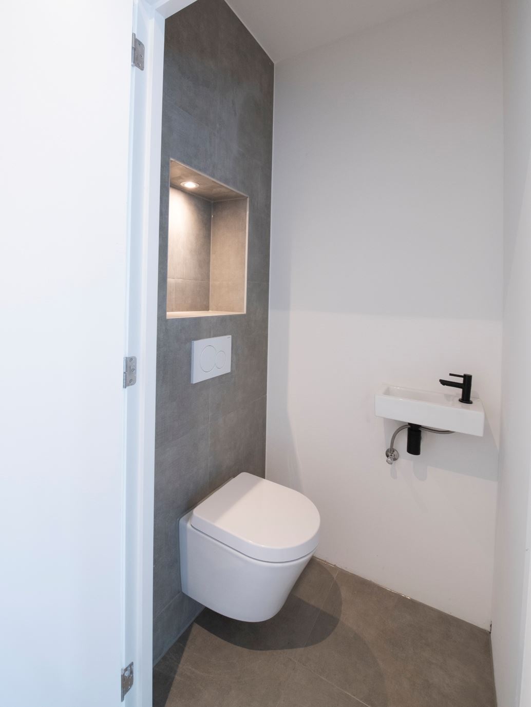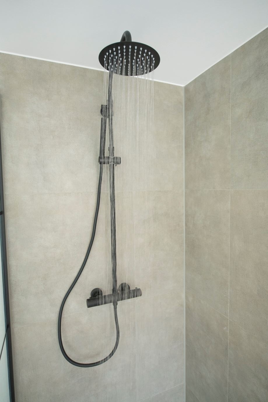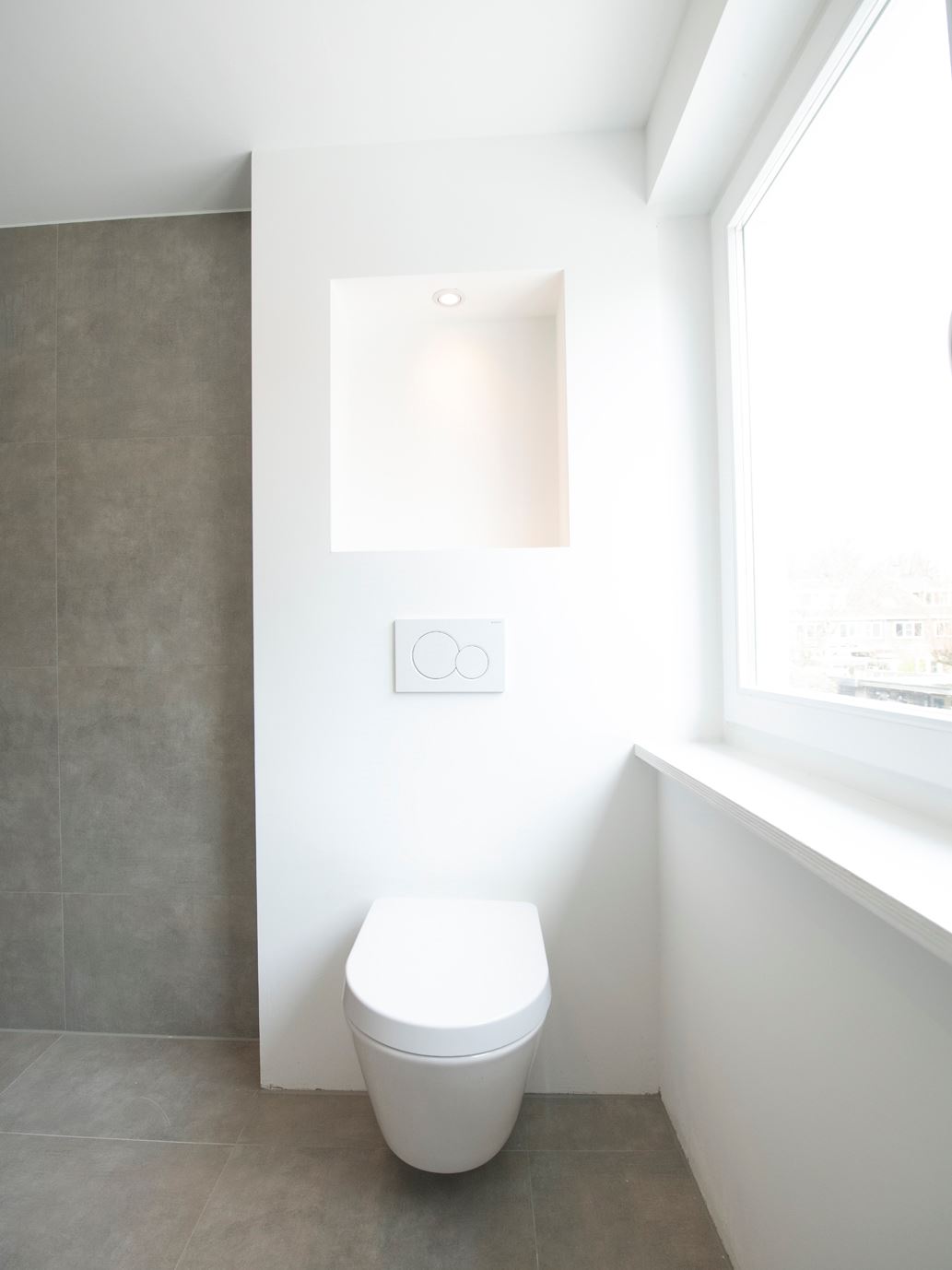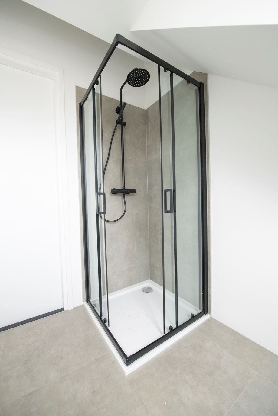 Eerste verdieping: Via de ruime overloop is er toegang tot 2 grote slaapkamers en de badkamer. De badkamer is geheel nieuw, inclusief inloopdouche, wastafel met spiegel, designradiator en toilet. De wanden zijn voorzien van stucwerk en strakke grijze tegels en op de vloer ligt een grote grijze tegel. De voorste slaapkamer heeft net als de living een erker die de kamer extra ruimte geeft.