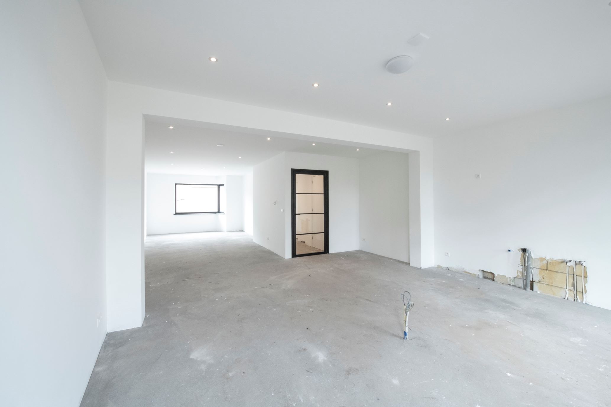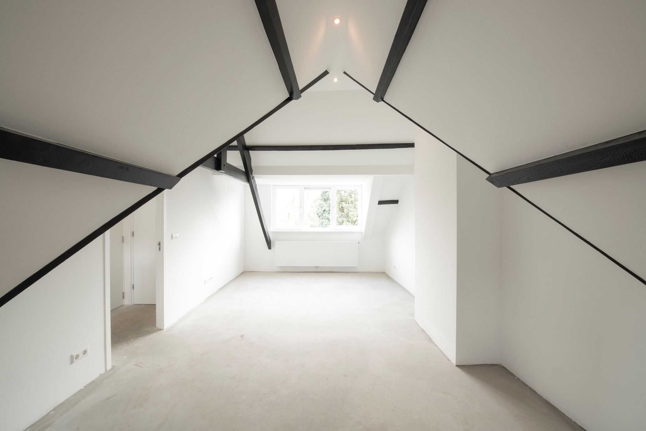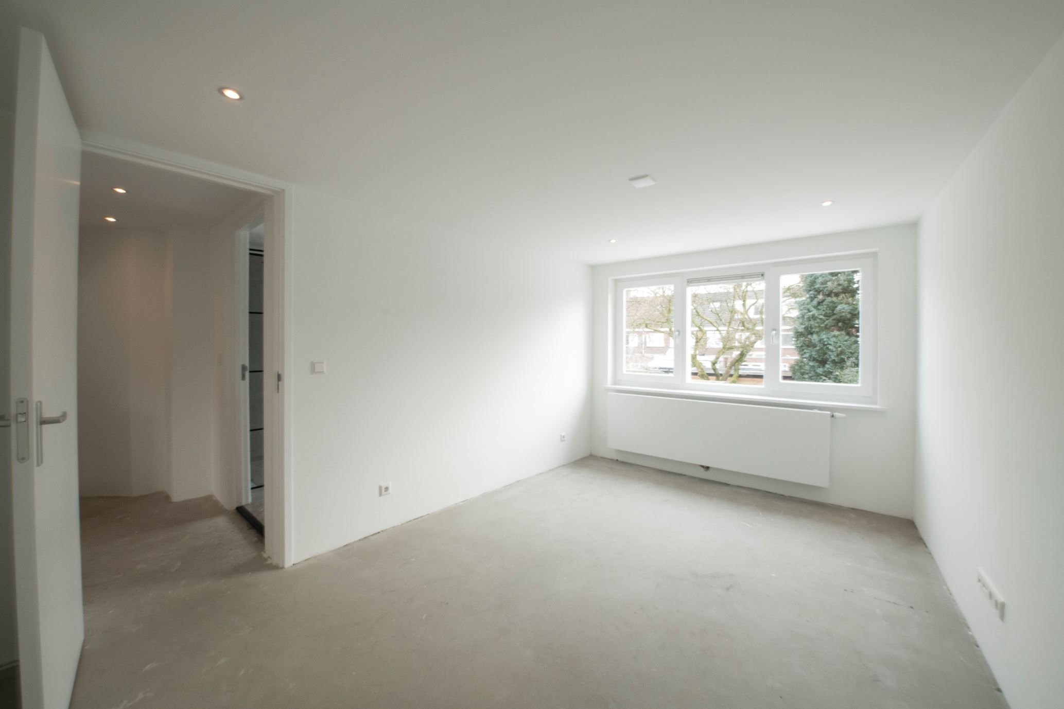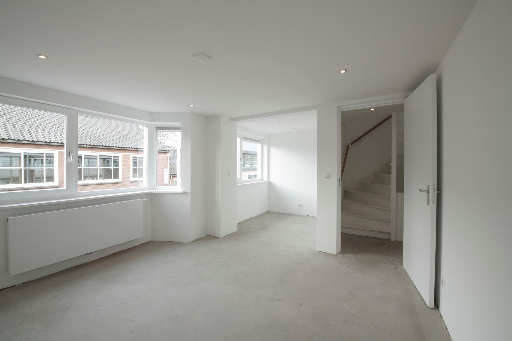 Woonkamer: Wat een ruimte! De sfeervolle erker aan de voorzijde van de woning geeft de woonkamer een extra ruimtelijke uitstraling. Passen en meten is in deze ruimte niet noodzakelijk. De lichte wanden en plafonds zijn strak afgewerkt met stucwerk. Aan de achterzijde is een stelpost opgenomen voor een keuken naar keuze inclusief alle apparatuur en eiland. Keuken wordt door ons ook gemonteerd.