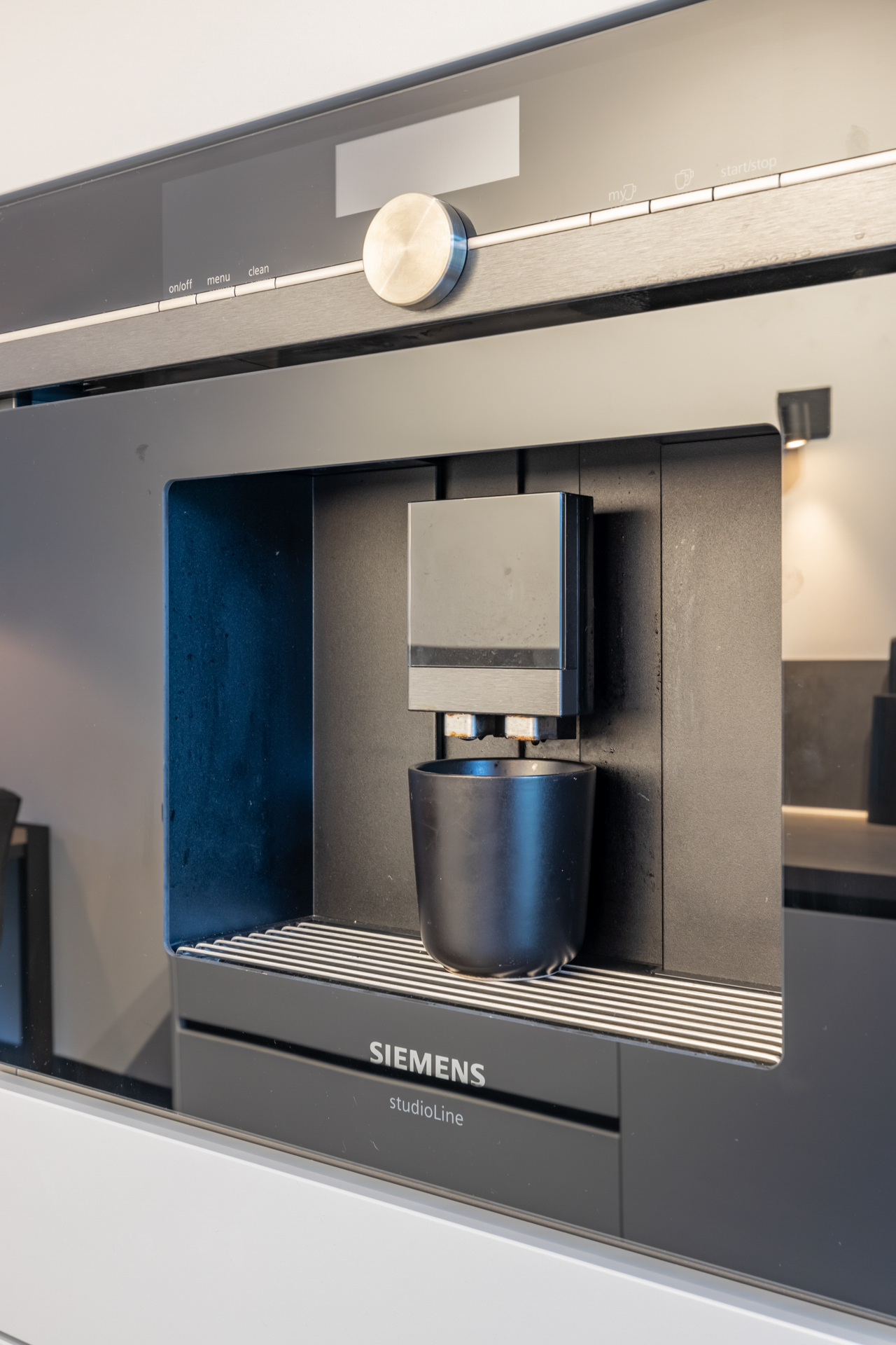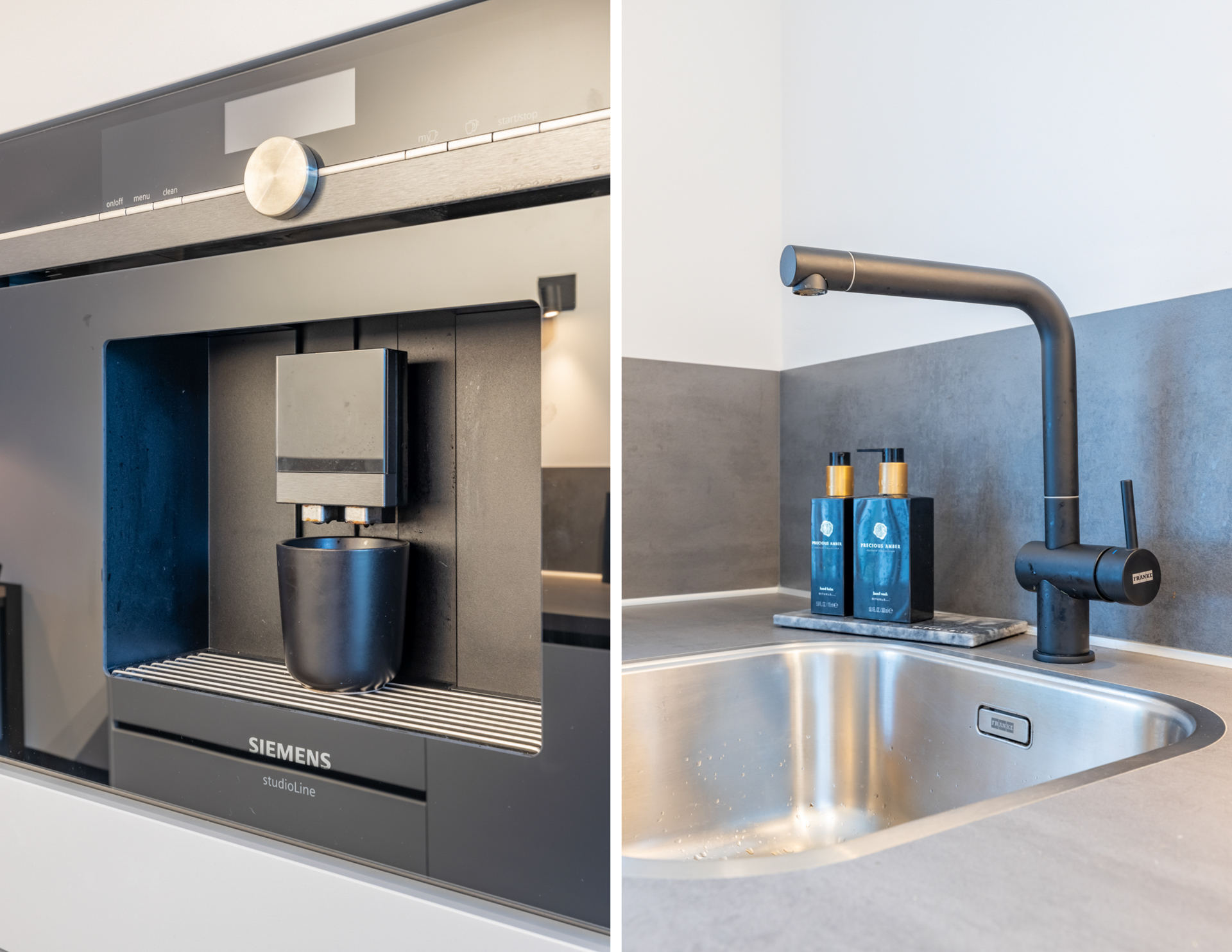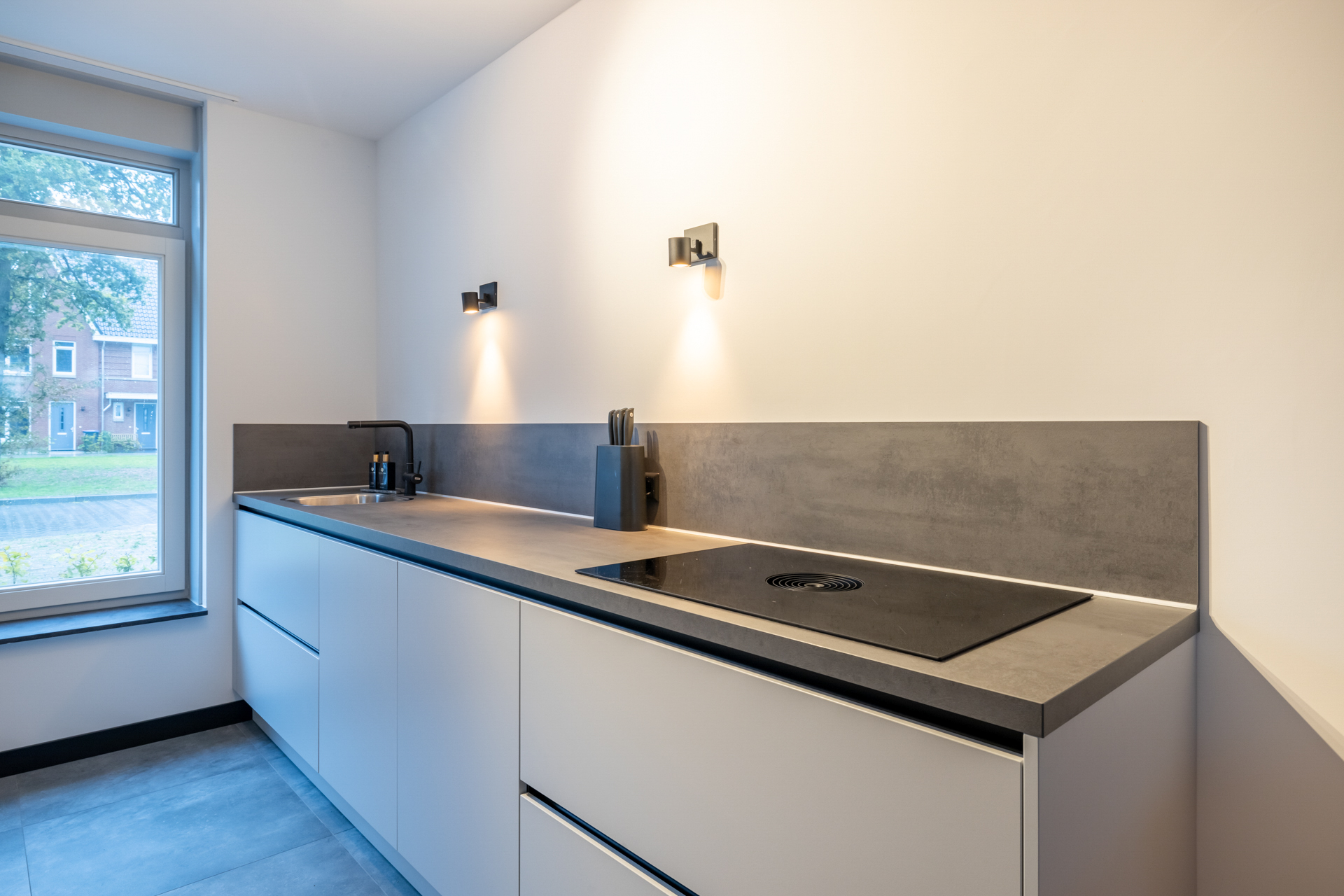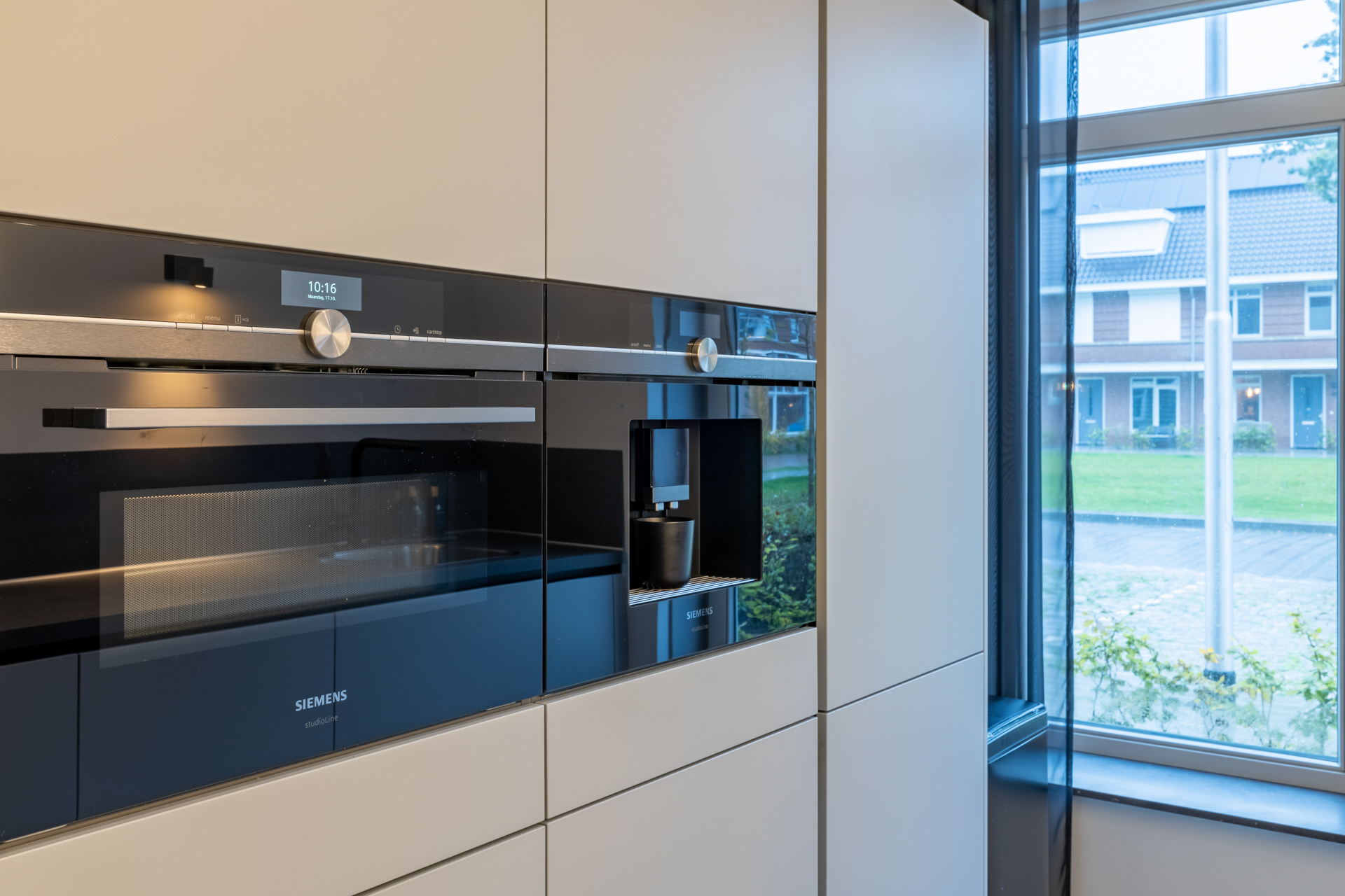 Aan de voorzijde van de woning vind je de open keuken. Deze keuken is te herkennen aan de lichtgrijze keukenkastjes en het donkergrijze werkblad. Je behandelt hier de volgende apparatuur: vaatwasser, oven, magnetron, inductie kookplaat, koelkast, vriezer en koffieautomaat. De keuken is voorzien van veel bergruimte.