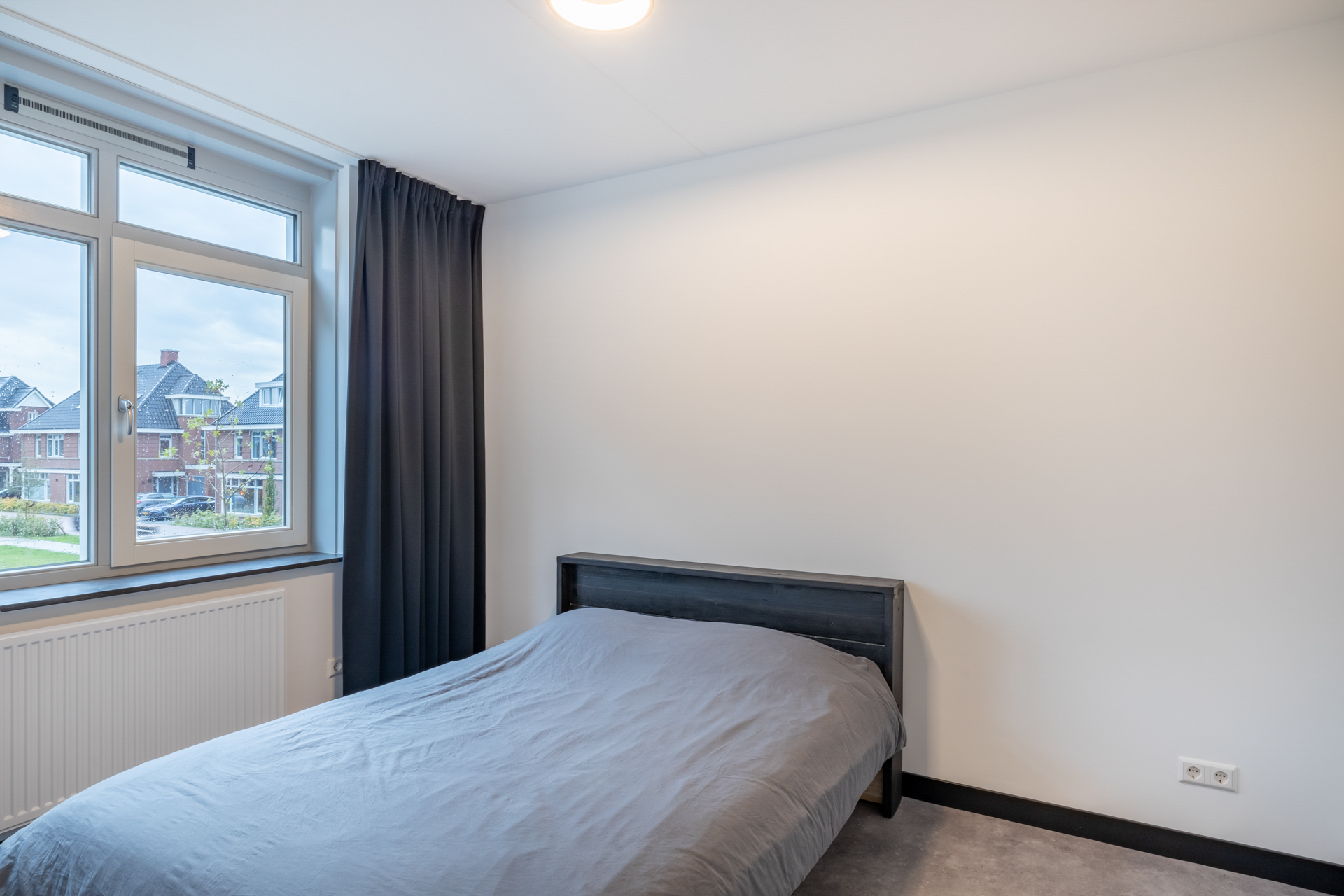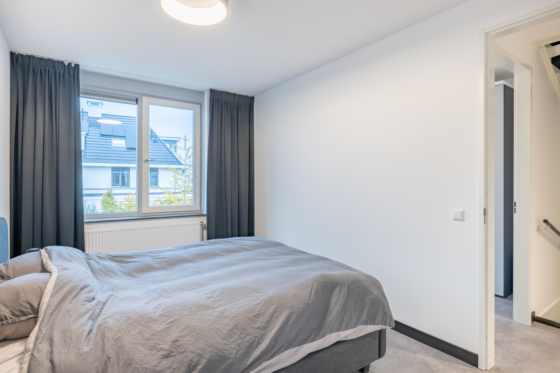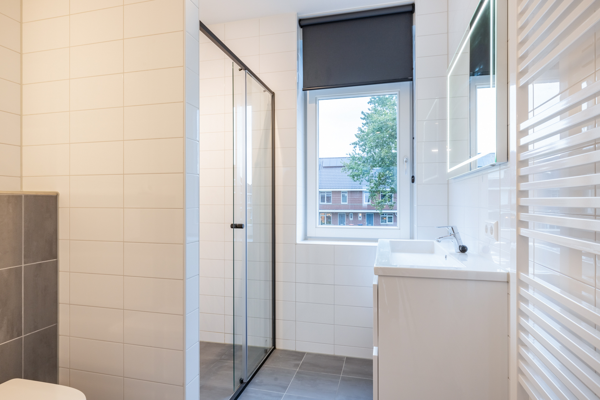 Van de drie slaapkamers op de eerste verdieping vind je twee aan de achterzijde en één aan de voorzijde. Stuk voor stuk zijn de ruimtes modern afgewerkt. De slaapkamers zijn verdeeld over een grijze PVC-laminaatvloer. Je geniet in alle slaapkamers van veel daglicht door de grote raampartij. De badkamer van deze woning grenst aan de slaapkamer aan de voorzijde. De badkamer is netjes betegeld en heeft een zwevend toilet, badmeubel met wastafel en inloopdouche.