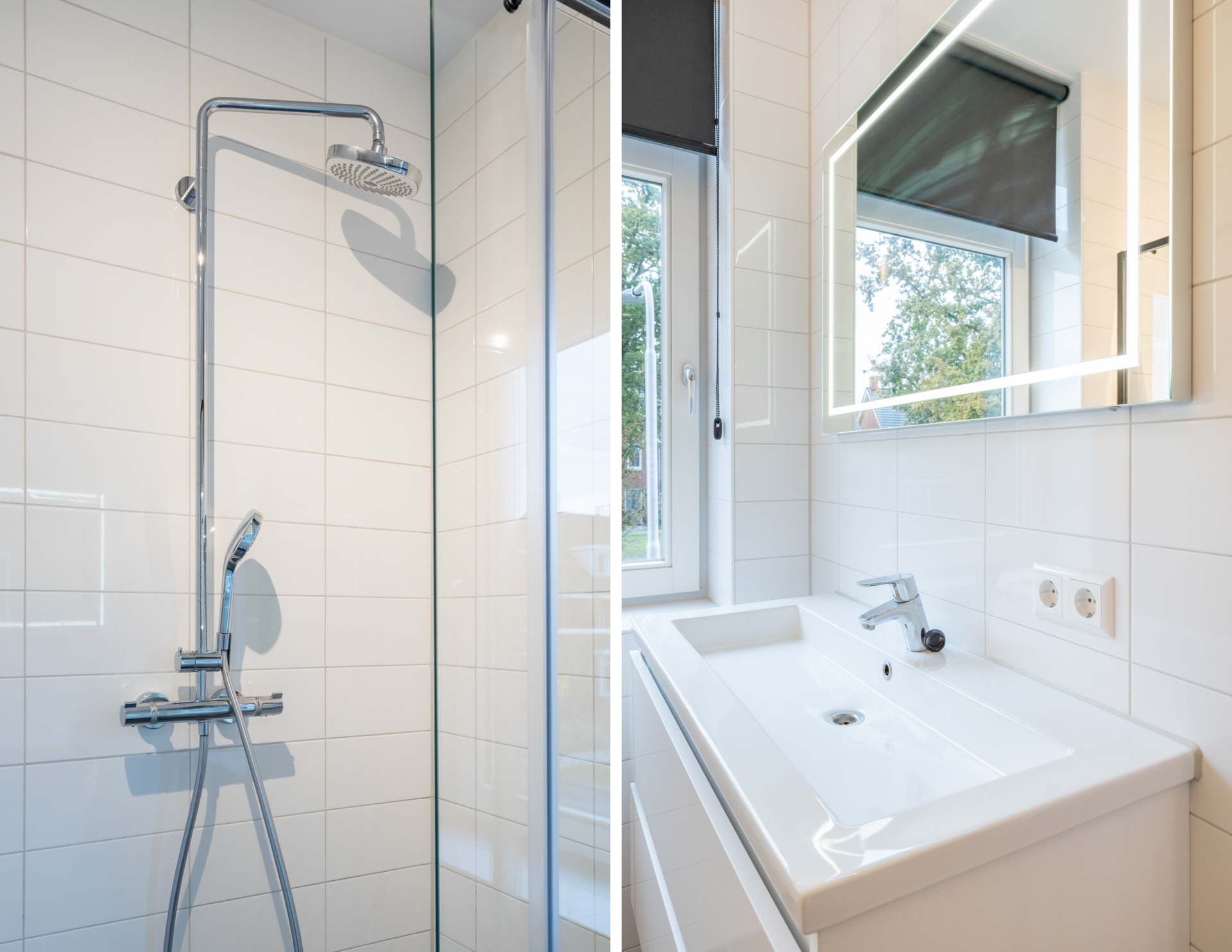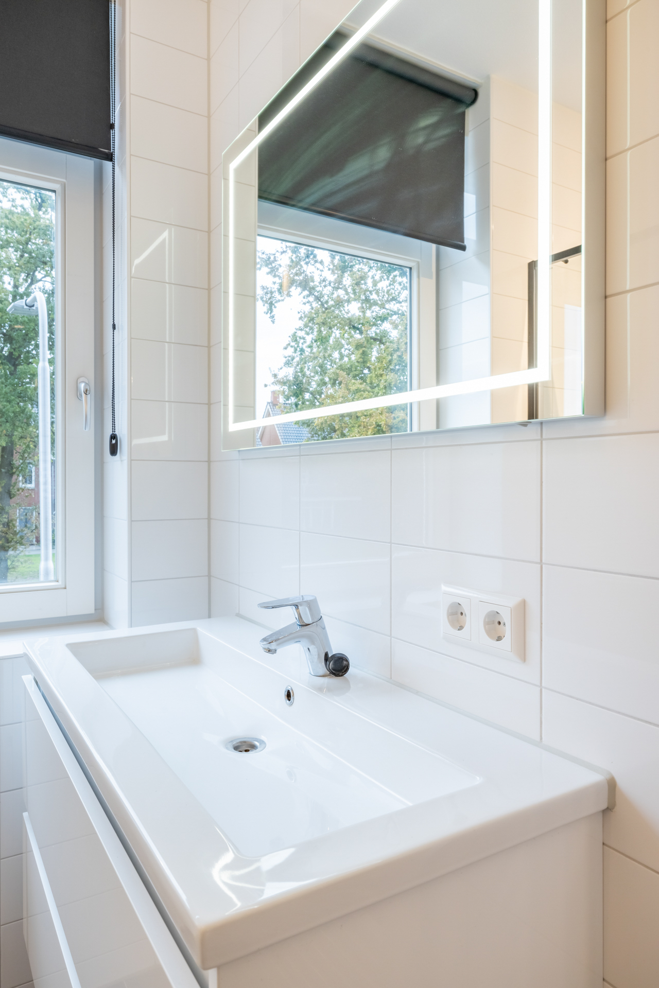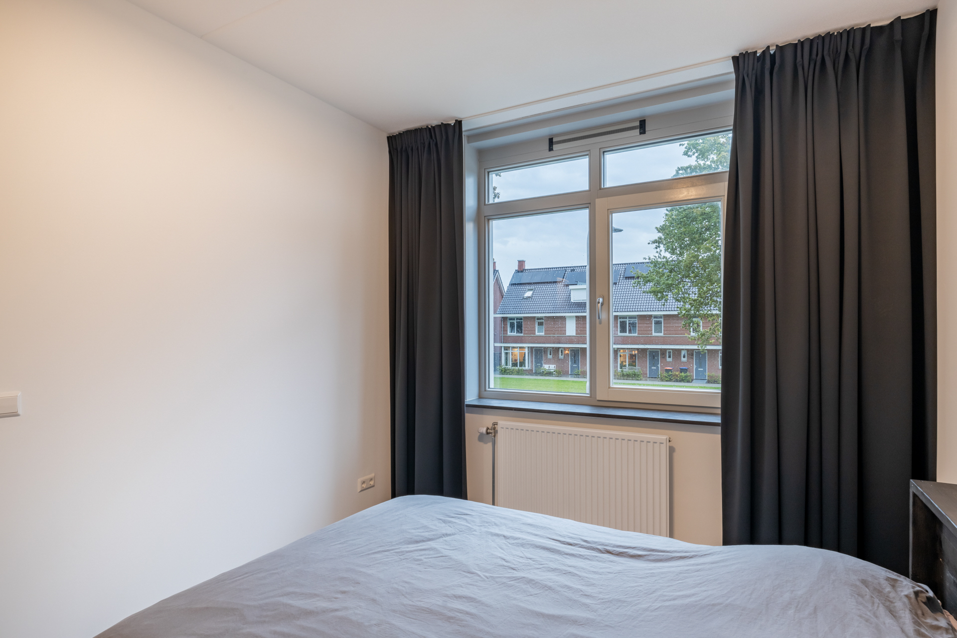 Van de drie slaapkamers op de eerste verdieping vind je twee aan de achterzijde en één aan de voorzijde. Stuk voor stuk zijn de ruimtes modern afgewerkt. De slaapkamers zijn verdeeld over een grijze PVC-laminaatvloer. Je geniet in alle slaapkamers van veel daglicht door de grote raampartij. De badkamer van deze woning grenst aan de slaapkamer aan de voorzijde. De badkamer is netjes betegeld en heeft een zwevend toilet, badmeubel met wastafel en inloopdouche.