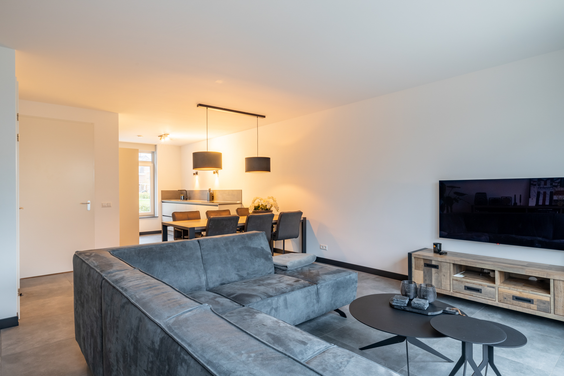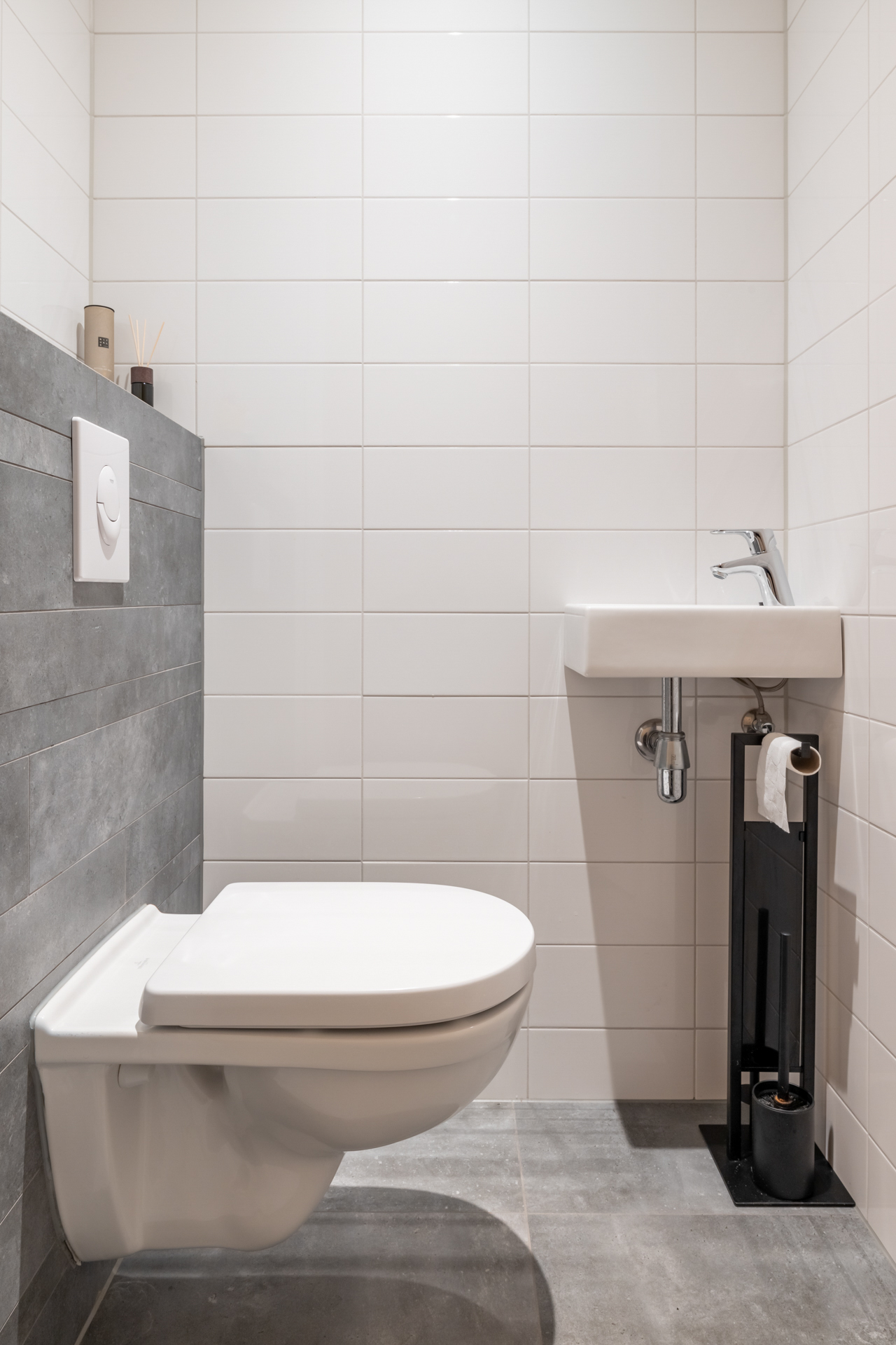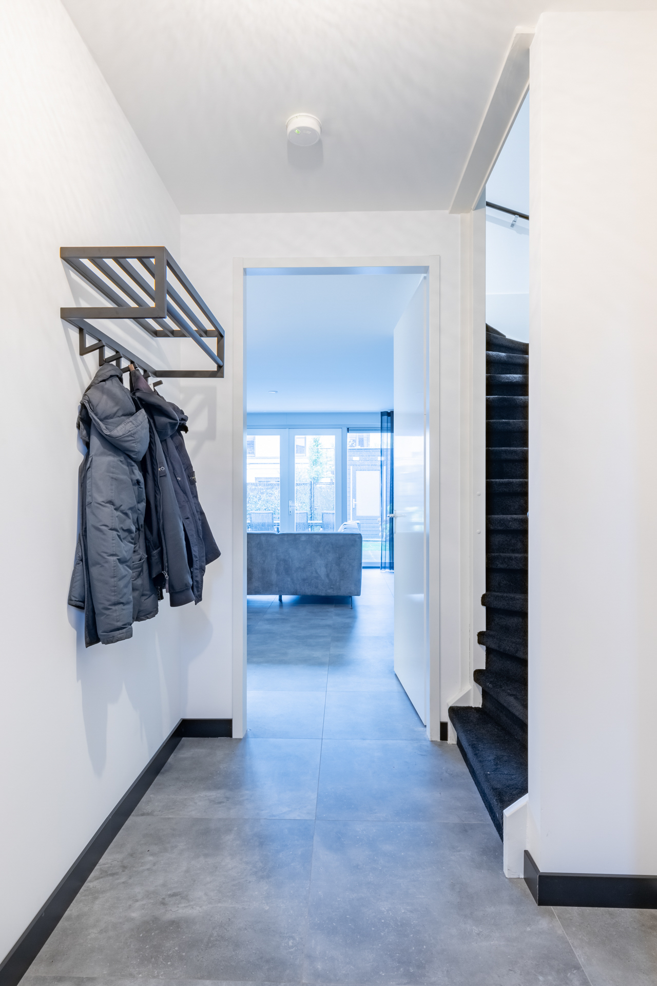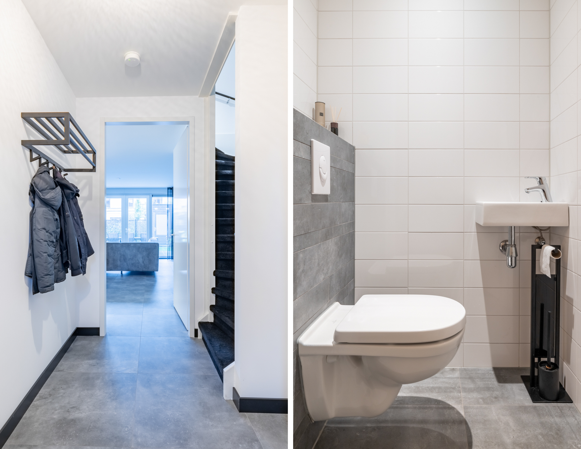 De kleine voortuin biedt toegang tot de voordeur van deze mooie nieuwbouwwoning. Achter de voordeur vind je de entreehal met schitterende toiletruimte met zwevend toilet en fonteintje, meterkast, trapopgang naar de eerste verdieping en toegang tot de grote woonkamer.