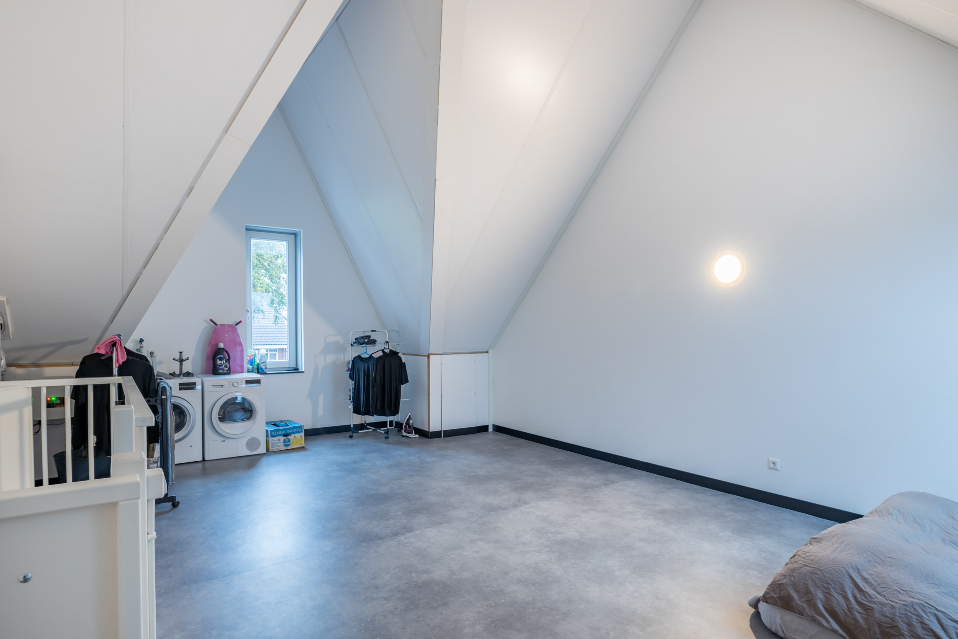 Via de trap bereik je de tweede verdieping van deze woning: de zolder. De zolder is zeer ruim en heeft daardoor volop mogelijkheden. Je kunt hier een vierde slaapkamer realiseren, maar het is ook een optie om de ruimte te gebruiken als werk- of hobbykamer. De muren en het plafond zijn hier strak afgewerkt en op de vloer ligt PVC-laminaat.