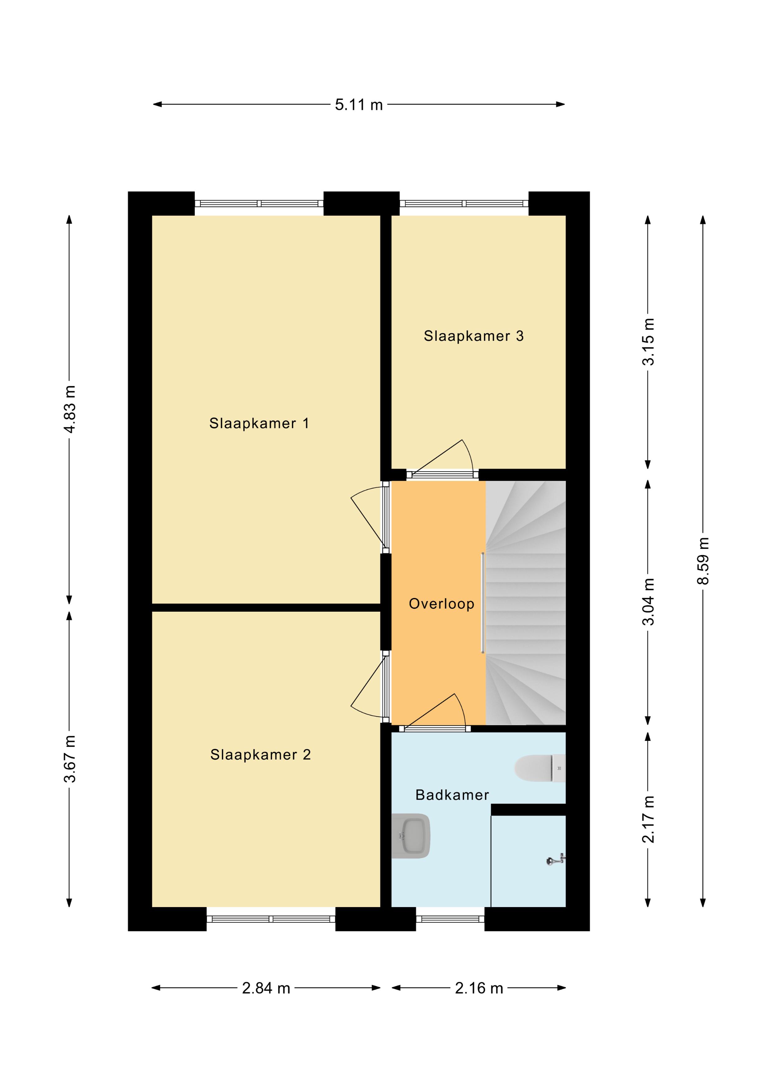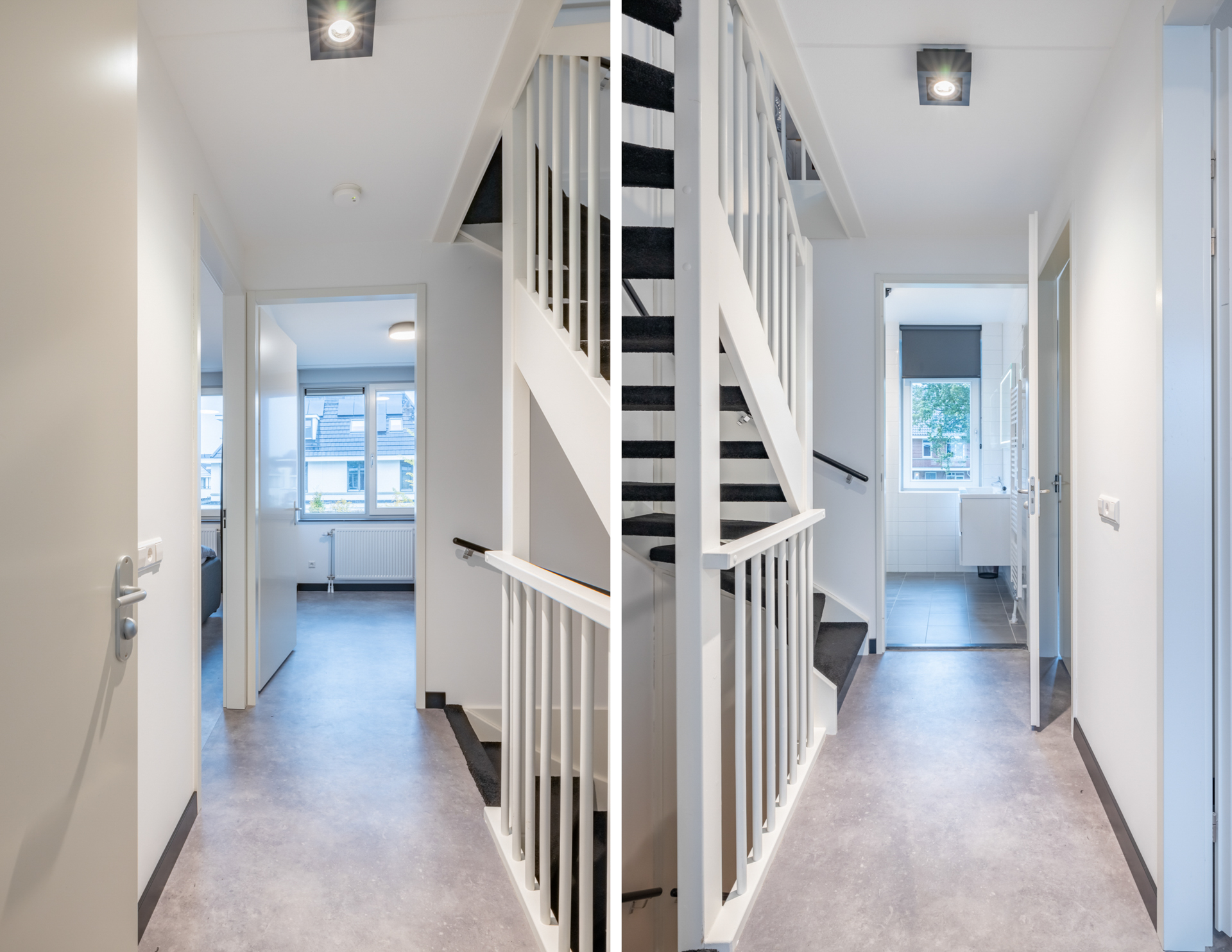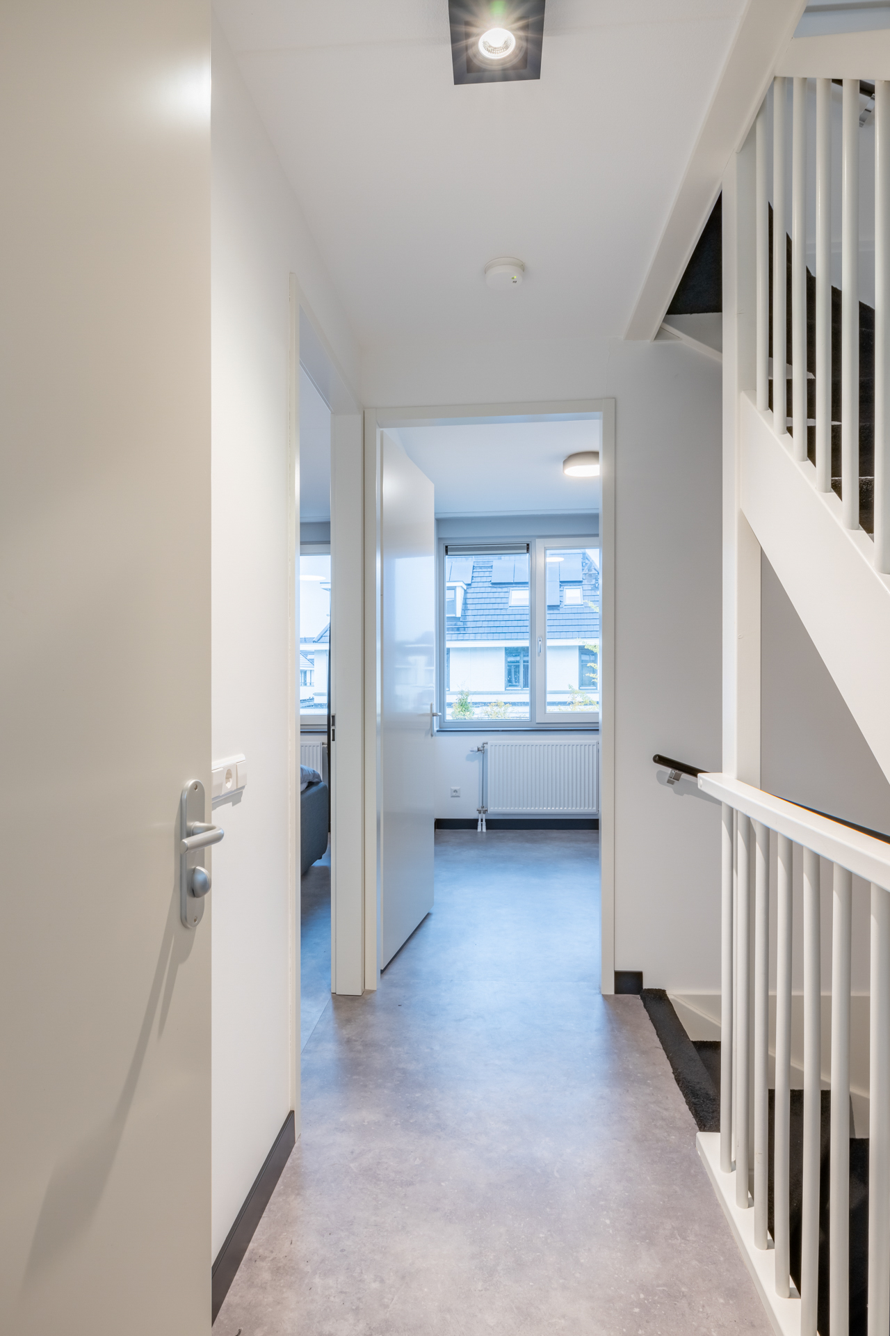 De gestoffeerde trap in de entreehal biedt toegang tot de overloop van deze verdieping. Hier tref je de trapopgang naar de tweede verdieping aan. Daarnaast zijn via de overloop de drie slaapkamers en de badkamer te bereiken.