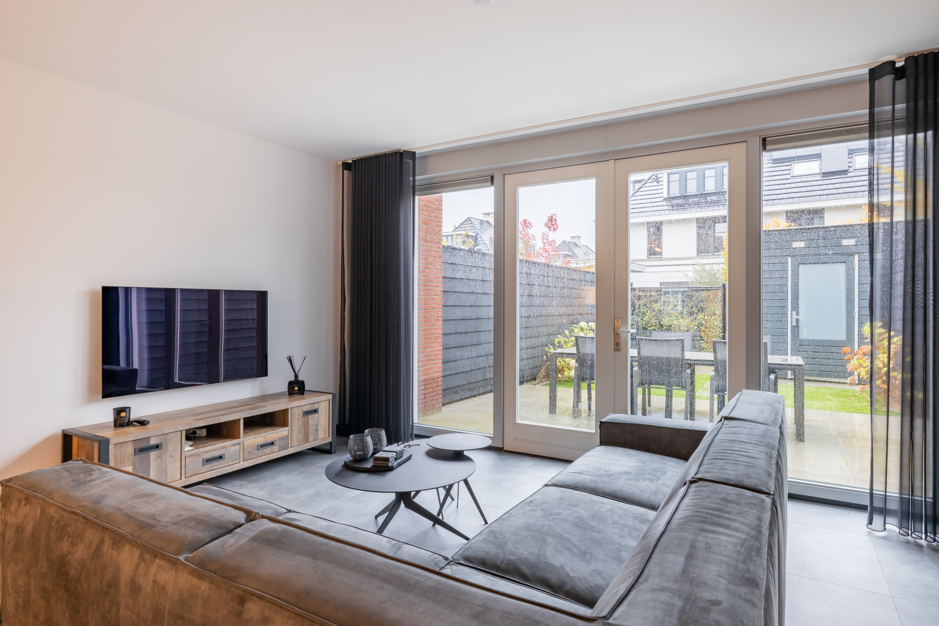 De muren en het plafond zijn in de woonkamer strak afgewerkt en de ruimte is voorzien van een mooie tegelvloer. De ruimte kenmerkt zich door de grote raampartij aan de achterzijde. Deze raampartij zorgt voor een groot lichtinval in de ruimte en heeft openslaande deuren naar de achtertuin. In de woonkamer heb je extra kastruimte om spullen op te bergen.