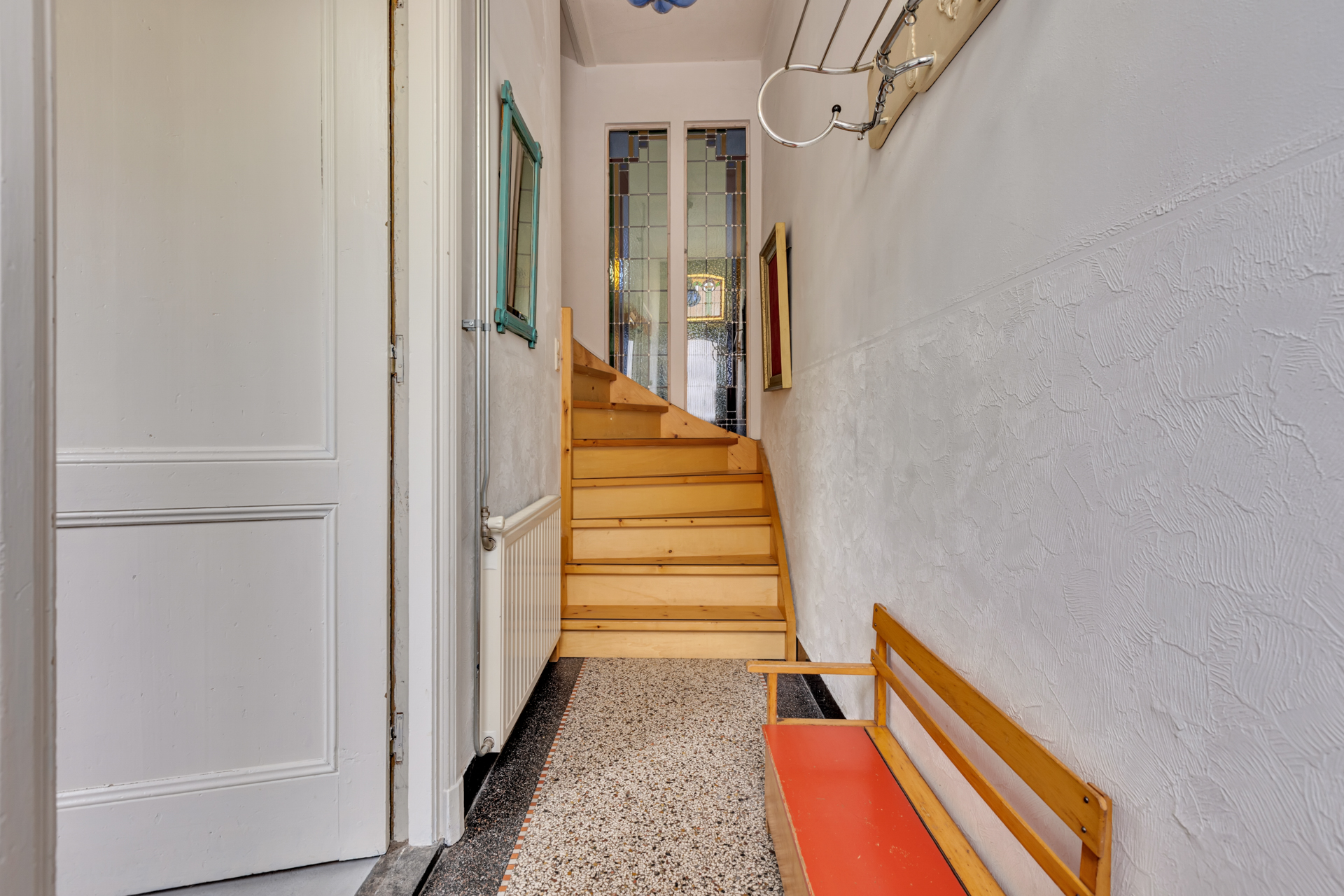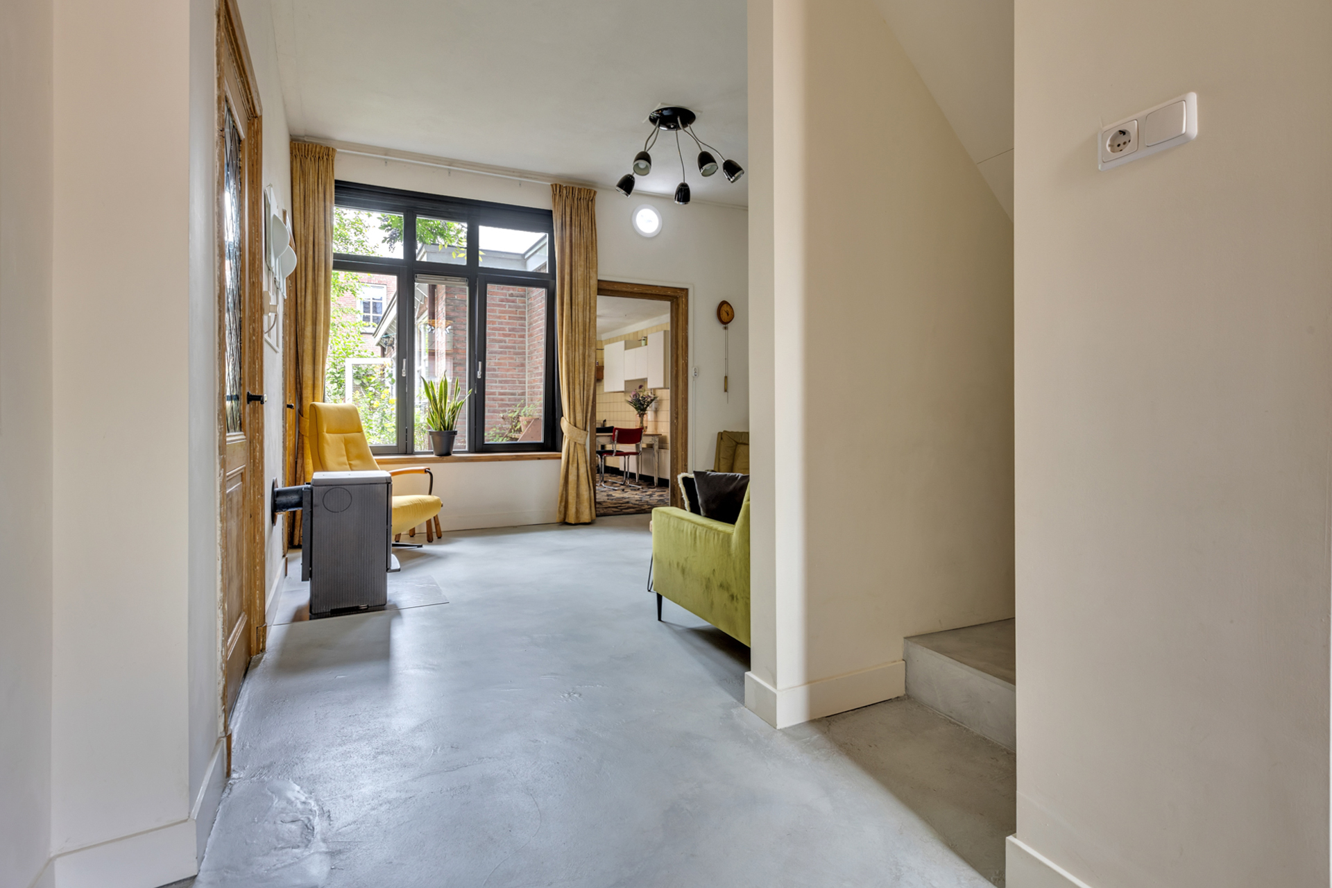 Gang/entree met prachtige oude granieten/terrazzo vloer, trapopgang en toegang tot de sfeervolle woonkamer met hoog plafond, strakke muren, betonvloer met vloerverwarming, glas in lood, authentieke deuren, houtkachel, ruime keuken, bijkeuken, toilet, gewelfde kelder en toegang tot de geweldige tuin en B&B.