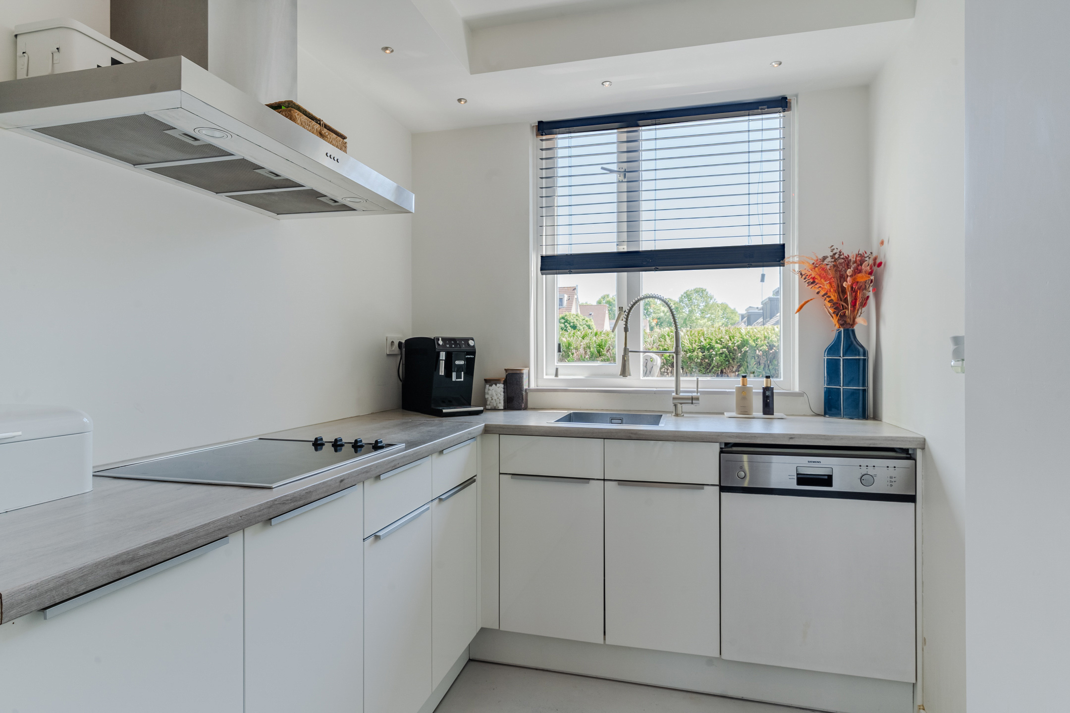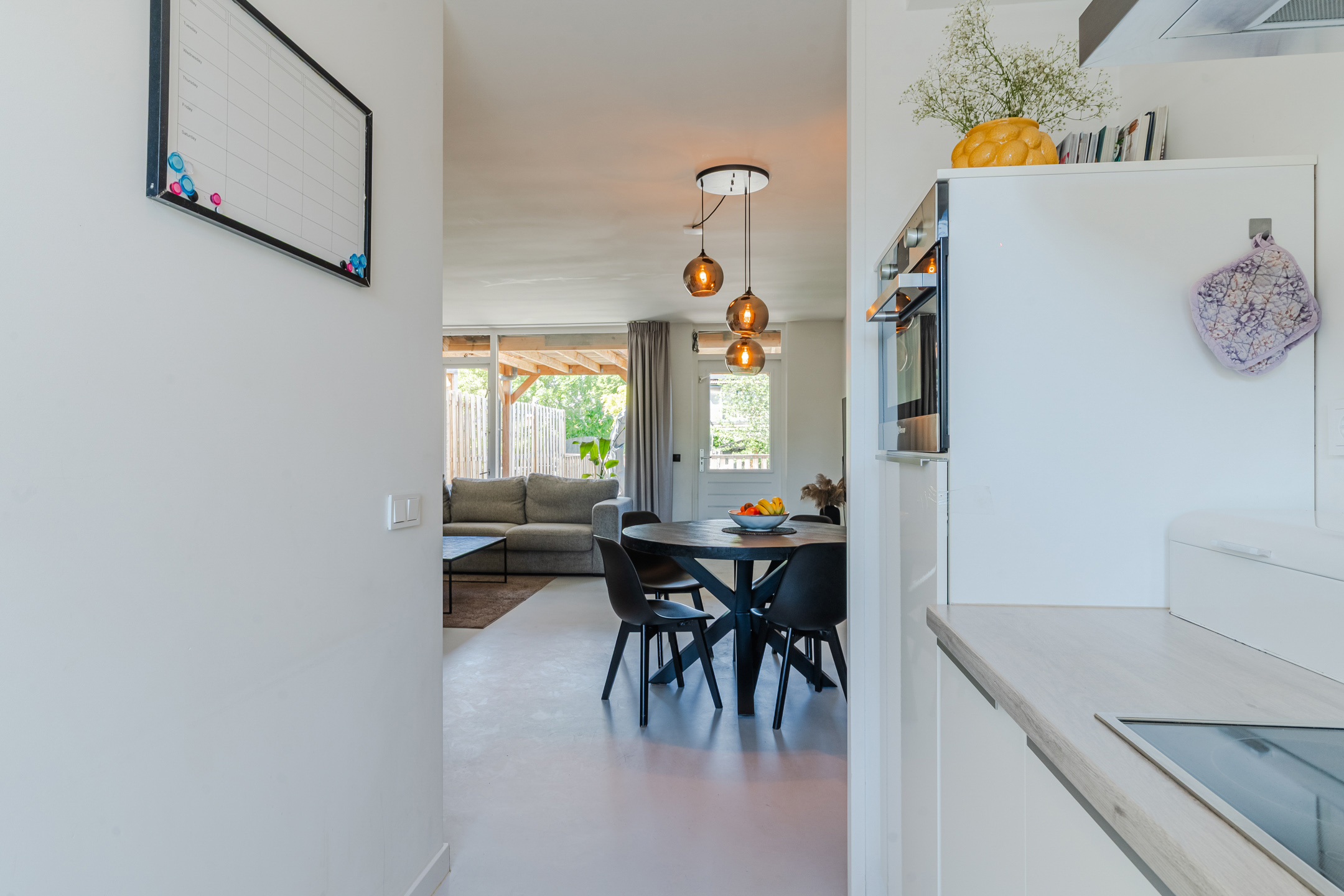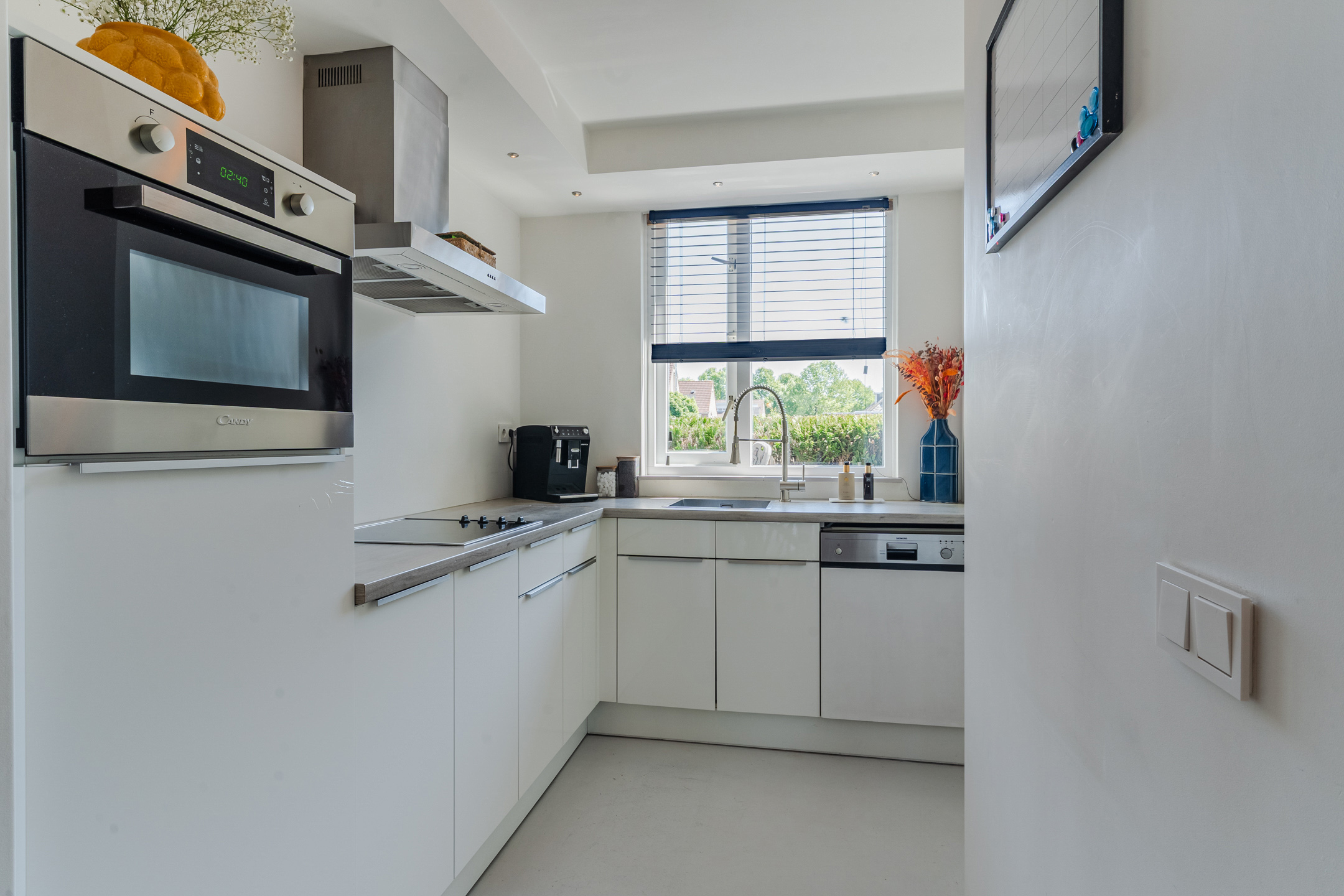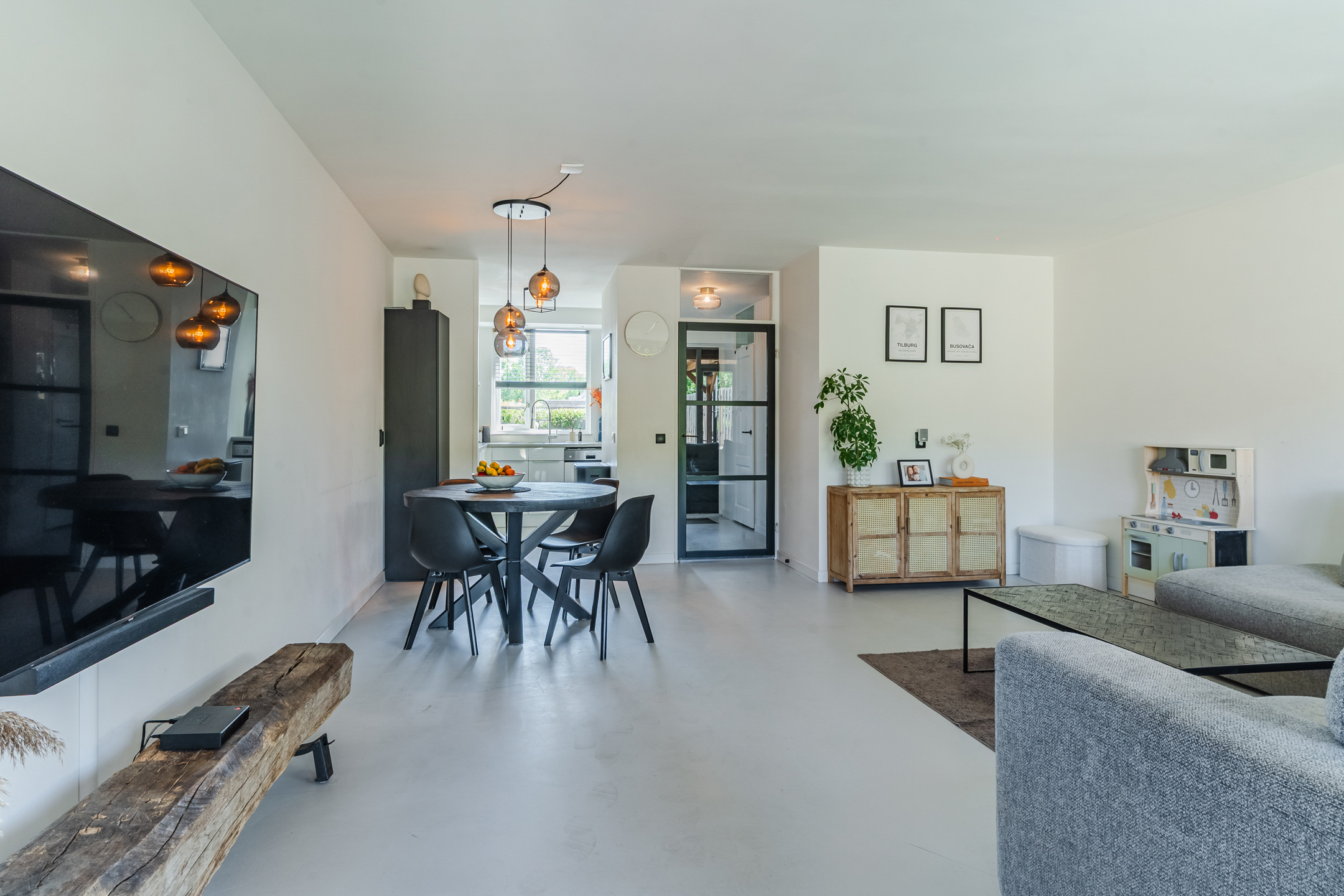 Vanuit de hal kun je naar de berging, het toilet en de woonkamer. De woonkamer is ruim en licht met aan de voorzijde de open keuken voorzien van vaatwasser, koelkast, combi-oven, kookplaat, afzuigkap en verlaagd plafond met inbouwspots. De gehele begane grond is voorzien van strak stucwerk en gietvloer. Via de achterdeur bereik je de zonnige tuin met overkapping, gelegen aan het water.
