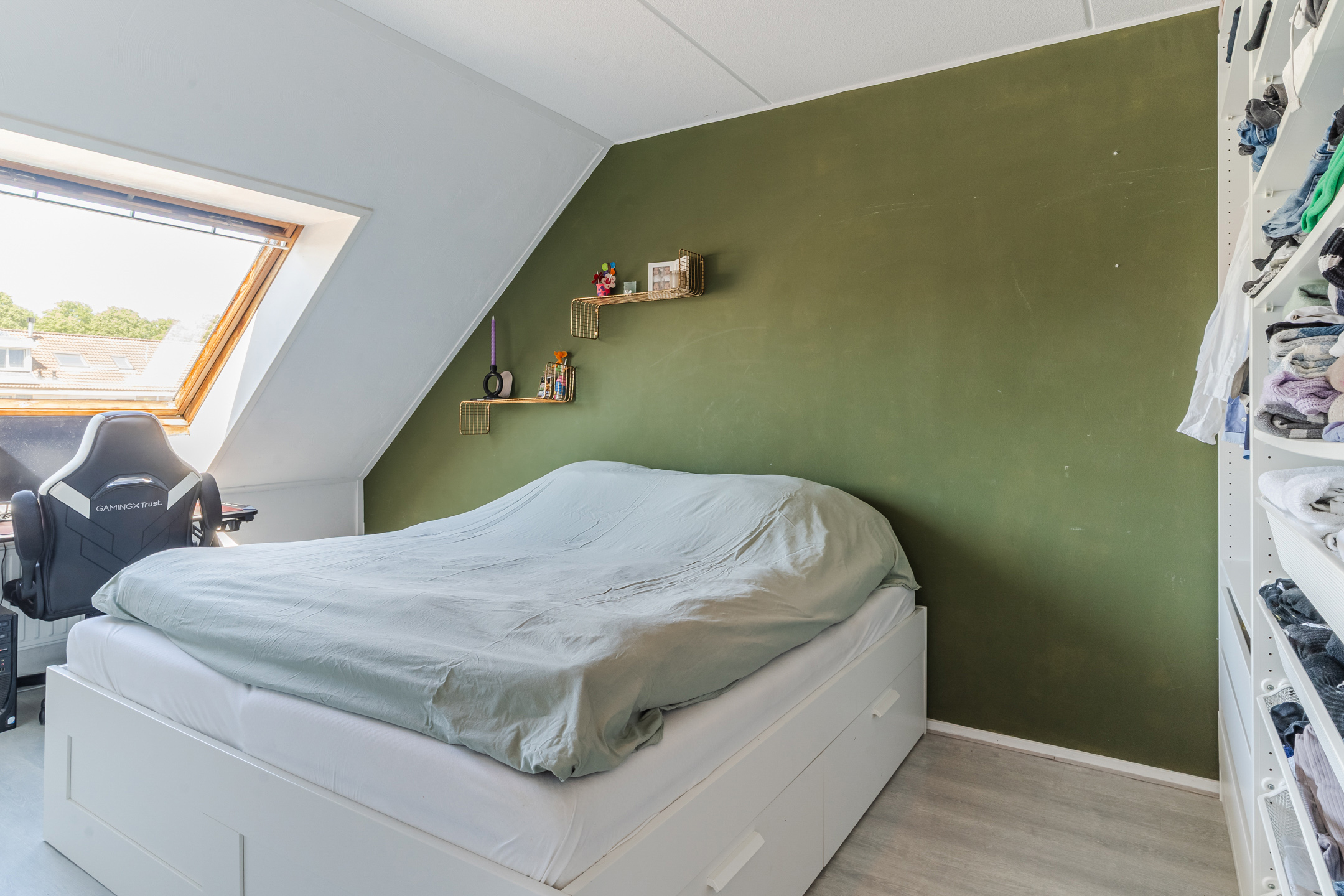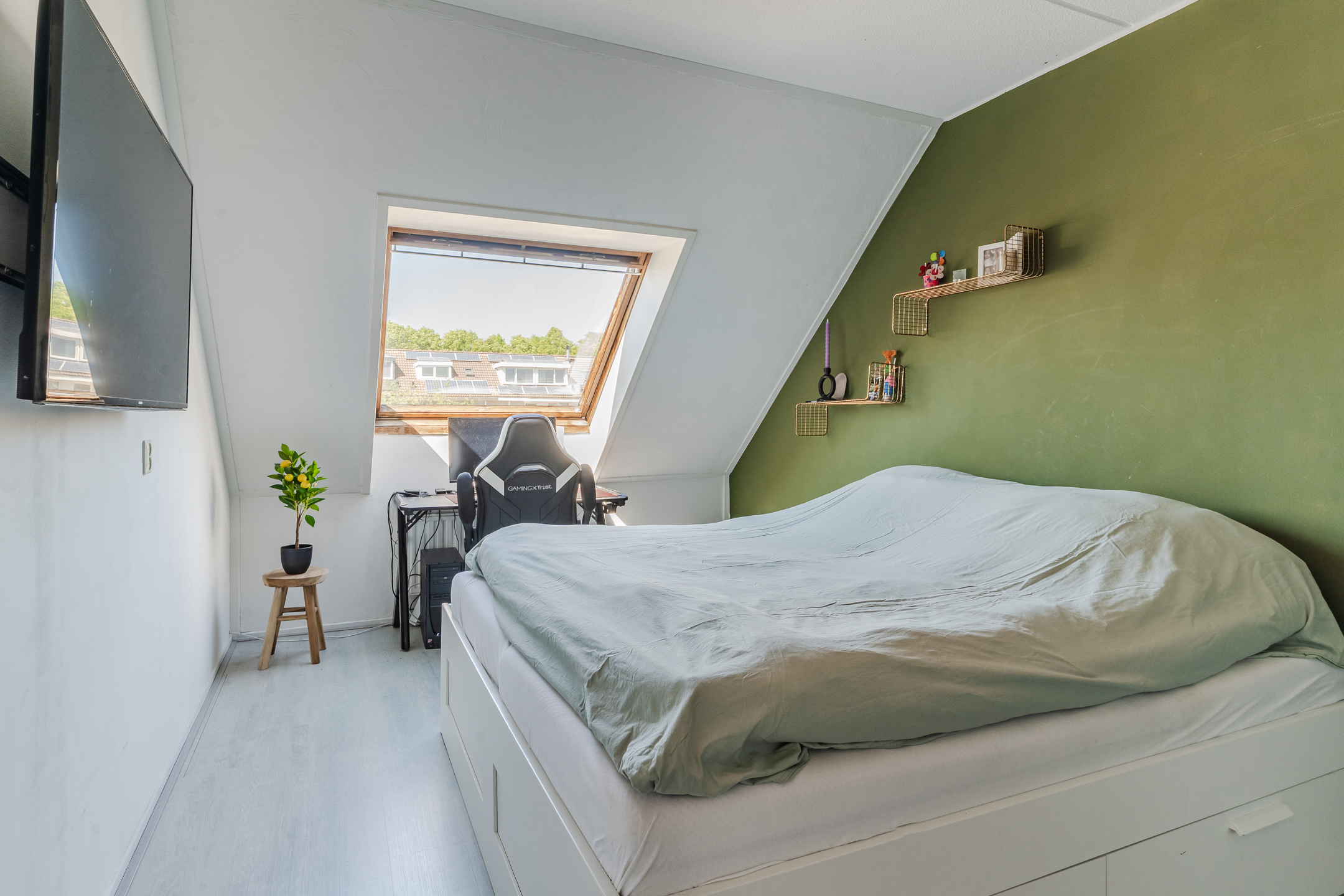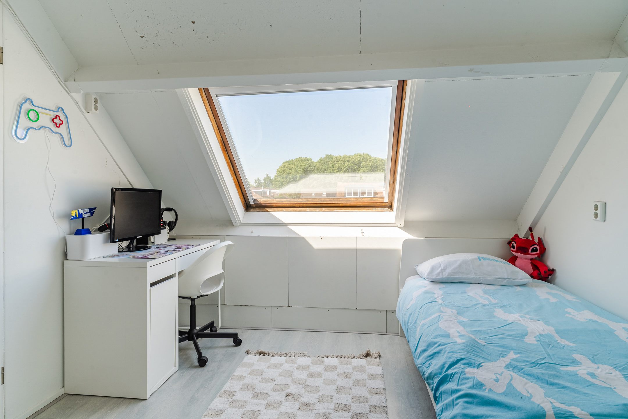 Via een vaste trap kom je op de ruime voorzolder van de tweede verdieping met de aansluiting voor de wasmachine en bergruimte achter de schotten. Daarnaast toegang tot een royale zolderkamer met velux dakraam. Ideale vierde slaapkamer voor pubers of als thuiswerkplek.