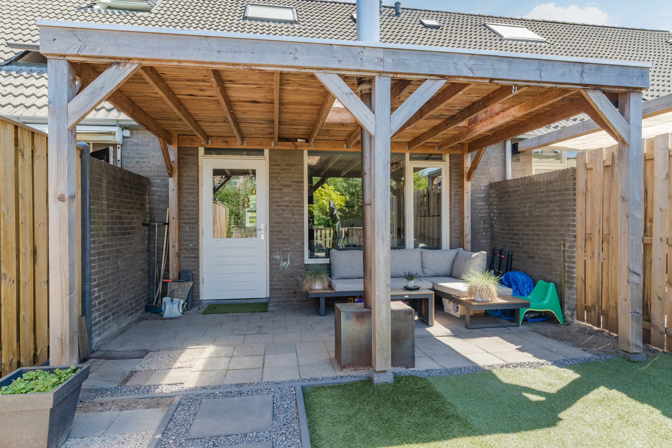 De ruime en zonnige achtertuin ligt aan het water en heeft naast een gezellige haard een houten overkapping.