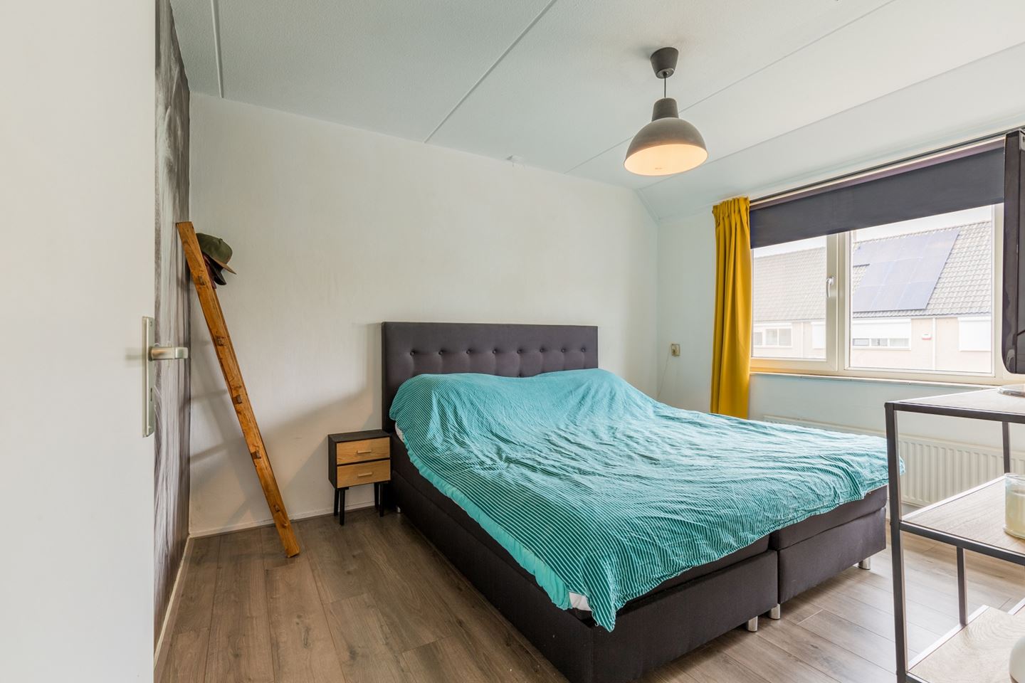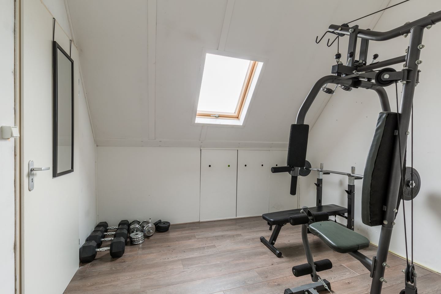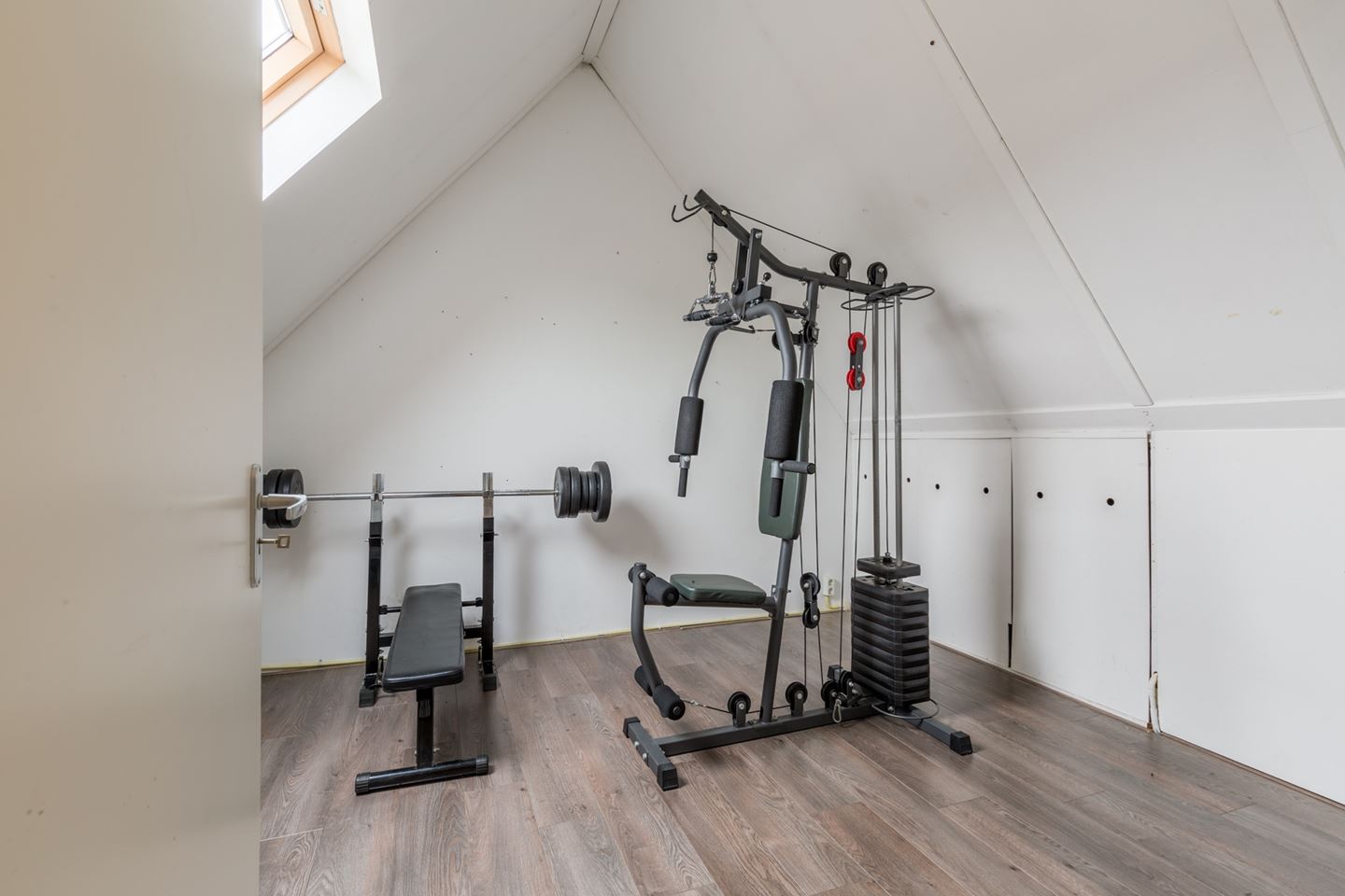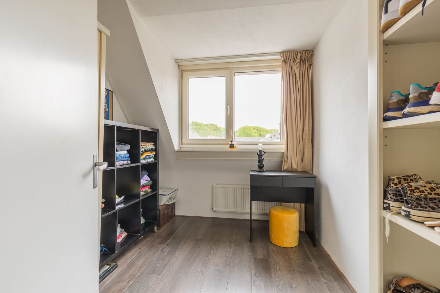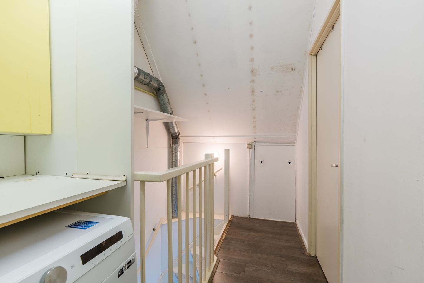 Tweede verdieping: Een vaste trap naar deze verdieping met een voorzolder met laminaatvloer en aansluiting voor wasmachine en droger. De 4e slaapkamer (12m2) heeft een Velux dakraam voor extra daglicht en er is veel bergruimte achter de knieschotten.