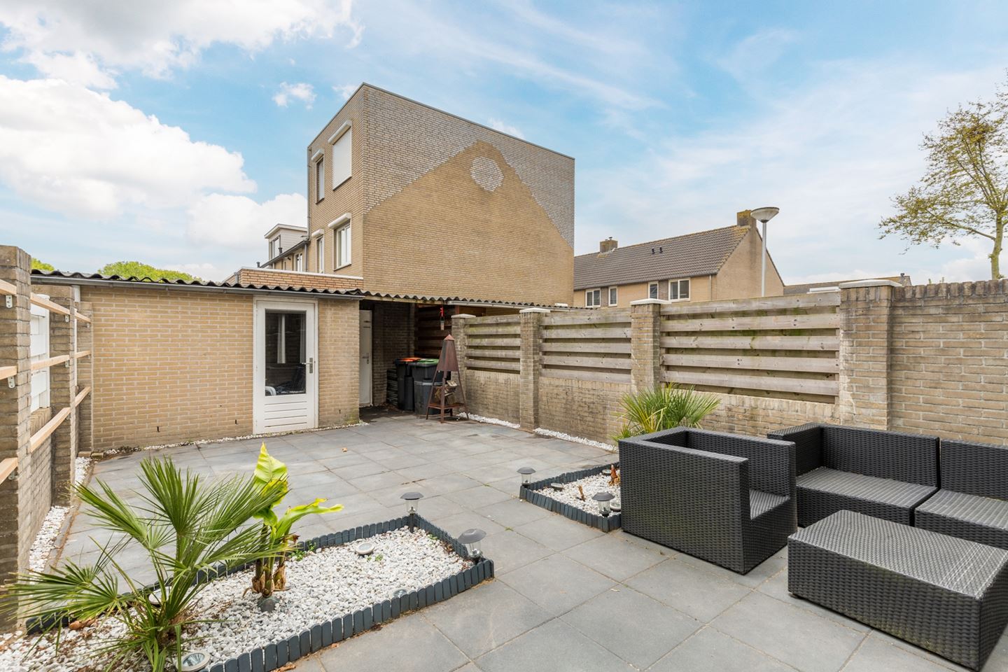 Tuin: Deze ligt op het Zuid-Oosten. Aan de achterzijde is er een groot zonnescherm over de volle breedte. De tuin is onderhoudsvriendelijk, heeft een terras en voldoende speelruimte. De berging ligt aan de achterzijde van de tuin en heeft een overkapping bij de achterom.