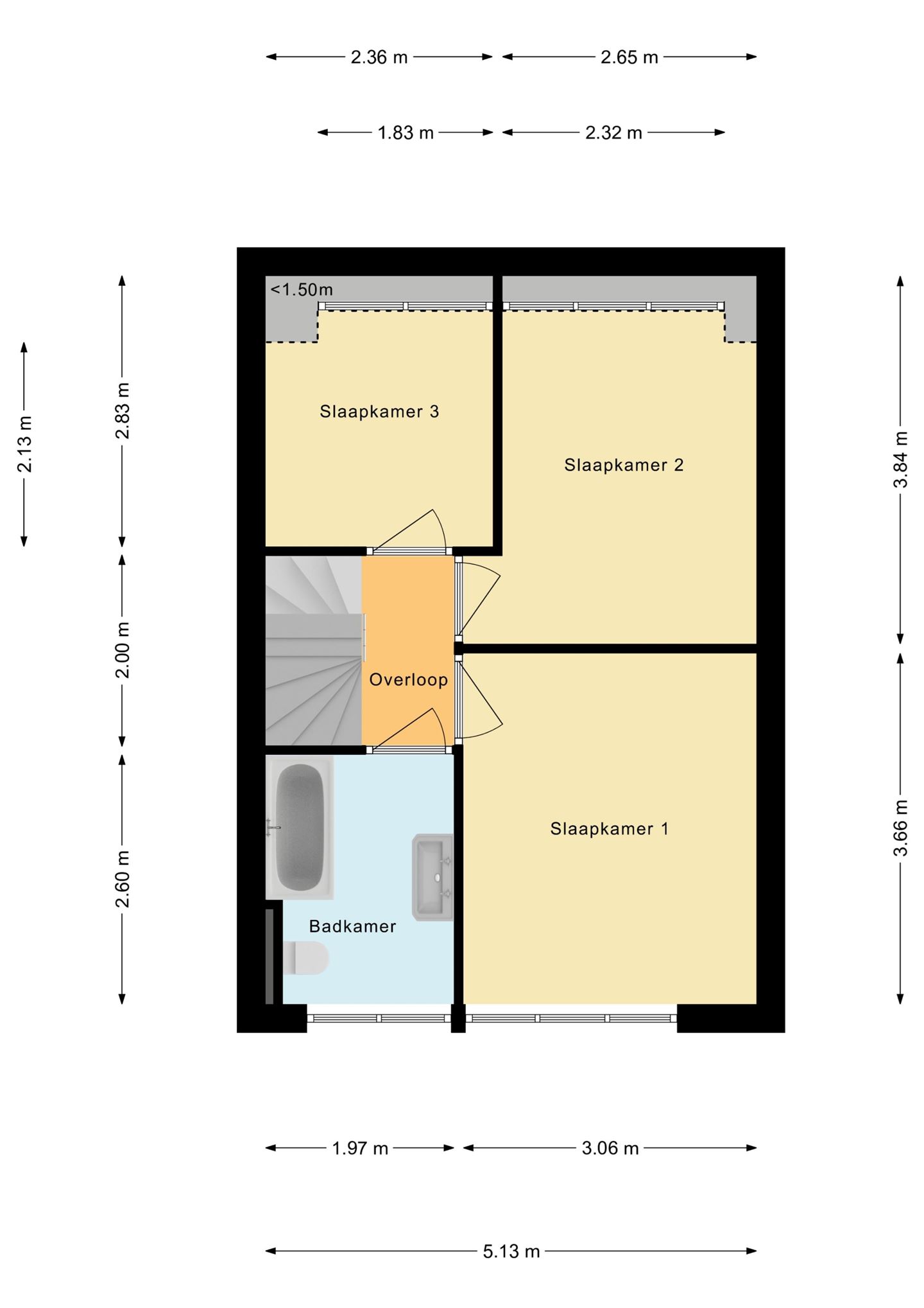 Eerste verdieping: Overloop met toegang naar drie slaapkamers en de badkamer. De grote slaapkamer (ca 11,5 m2) ligt aan de voorzijde. Ook de in 2010 vernieuwde badkamer ligt aan de voorkant van de woning. Deze is uitgevoerd in wit sanitair met een mooie grijze tegel. Er is een dubbele wastafel, 2e toilet een ligbad met glazen douche wand. Aan de achterzijde liggen nog twee slaapkamers van 10m2 en 7 m2. Aan de achterkant is een grote dakkapel geplaatst zodat deze kamers ook een fijne ruimte hebben. Op deze verdieping ligt laminaat en zijn alle kozijnen van kunststof en voorzien van isolerende beglazing.