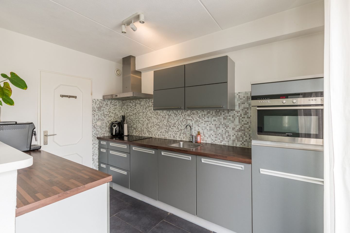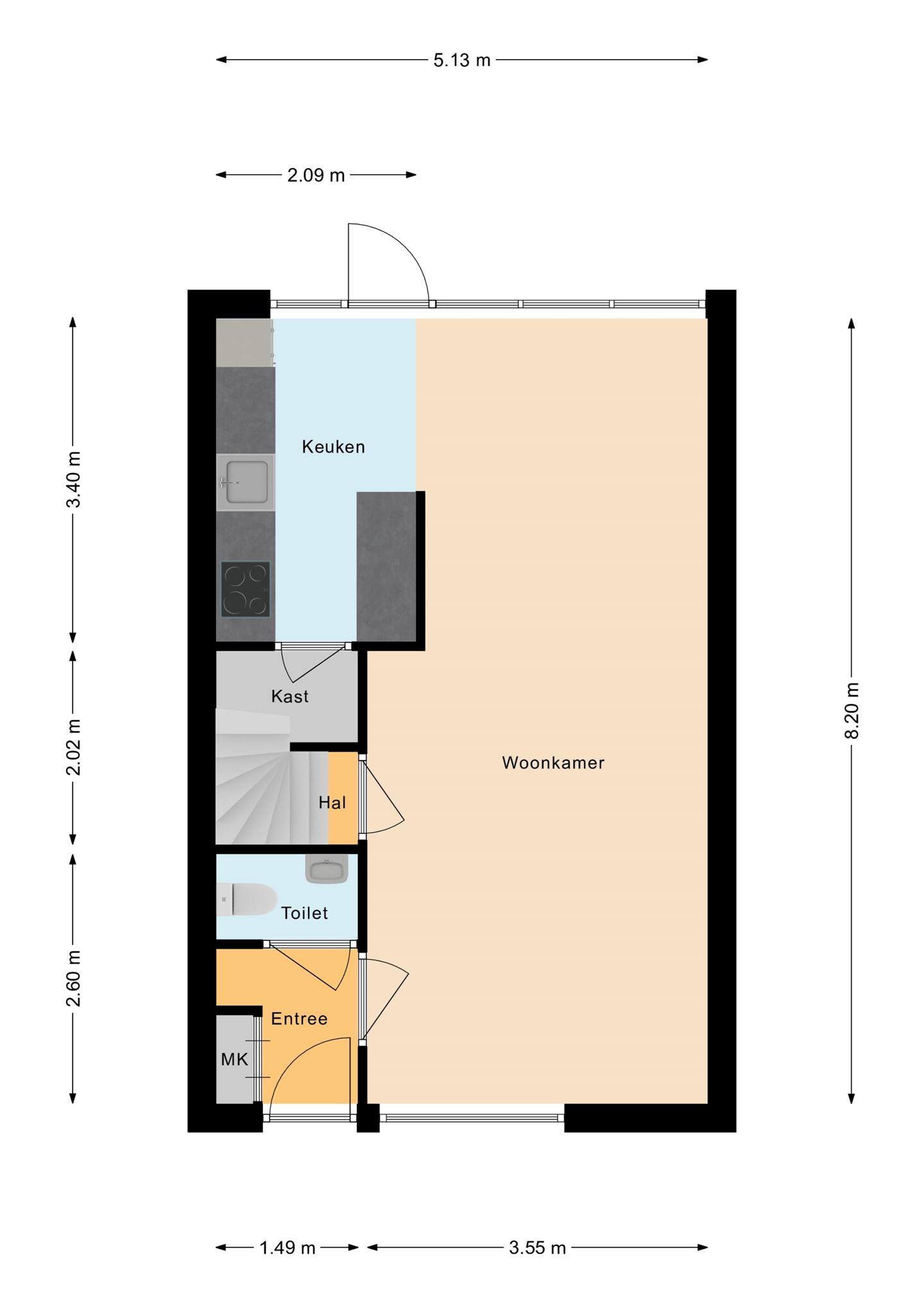 Voortuin, entree, hal met toiletruimte, toegang naar woonkamer. Lichte doorzon kamer met tegelvloer. Het zitgedeelte ligt aan de voorzijde van woning en heeft voldoende privacy omdat de woning een voortuin heeft. De keuken en het eetgedeelte liggen aan de tuinzijde. De keuken heeft een parallel opstelling en is voorzien van een inductie kookplaat, afzuigkap, vaatwasser, koelkast en combimagnetron. Tevens is er vanuit de keuken toegang tot een ruime bergkast. In de keuken is de loopdeur naar de achtertuin.