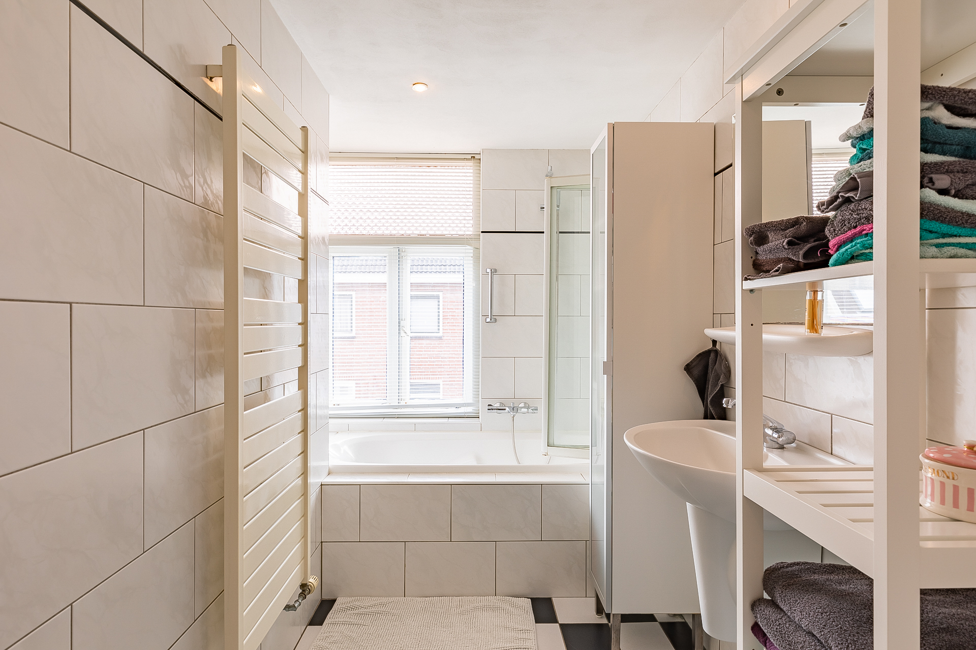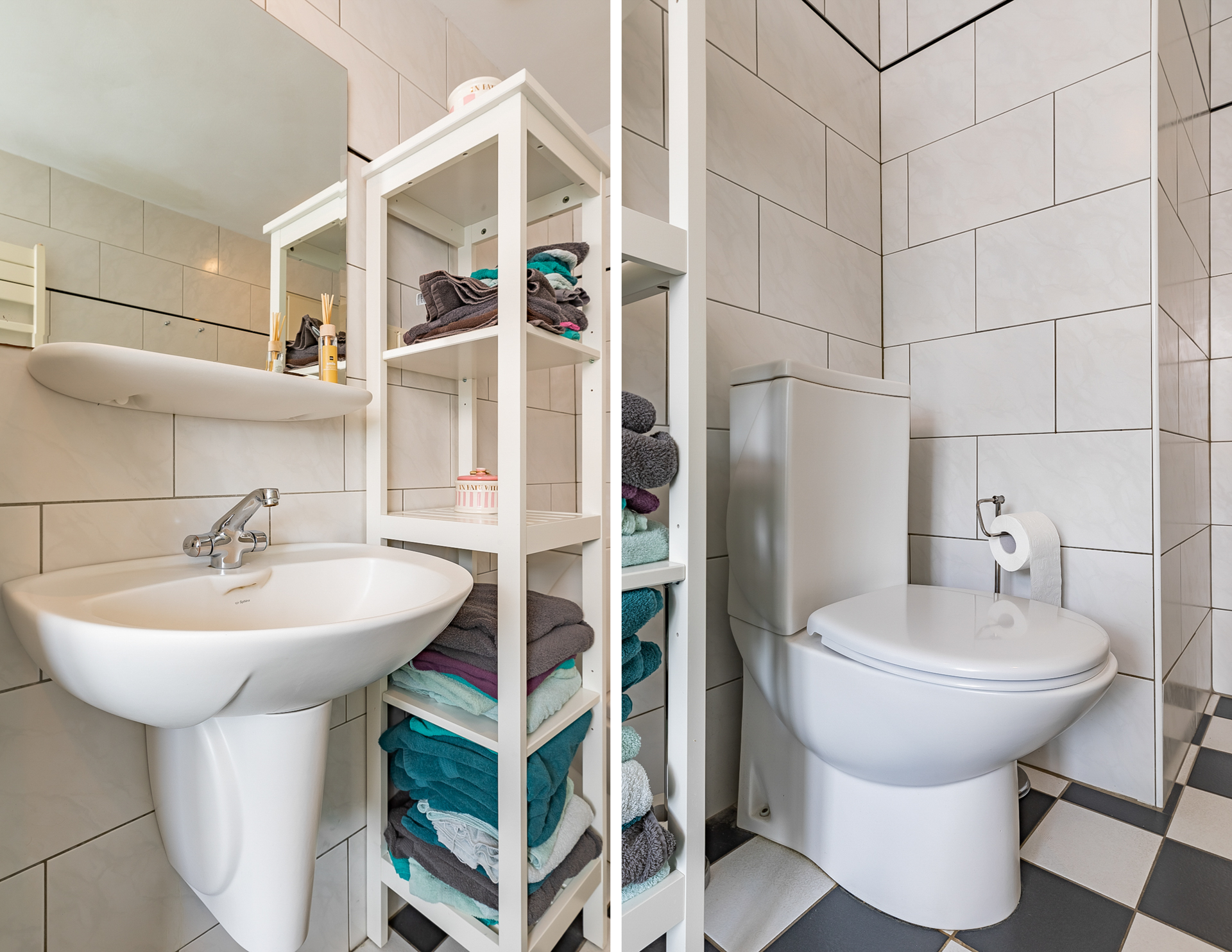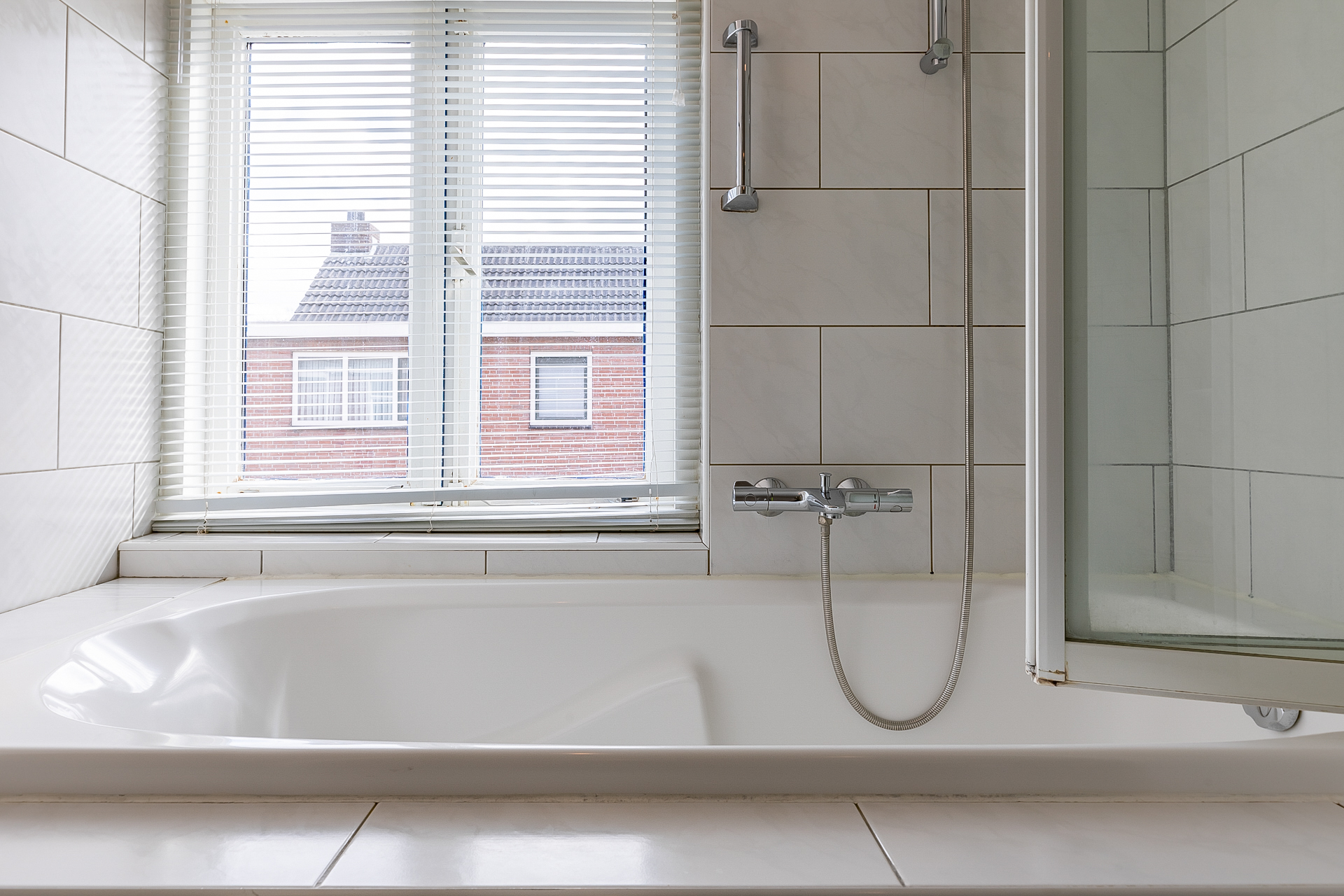 Op de eerste verdieping heb je ook nog de beschikking over een mooie badkamer. Hier kun je gebruikmaken van een heerlijk ligbad, die ook is voorzien van een doucheaansluiting en glazen douchewanden. Daarnaast zijn een wastafel en een toilet voorhanden.
