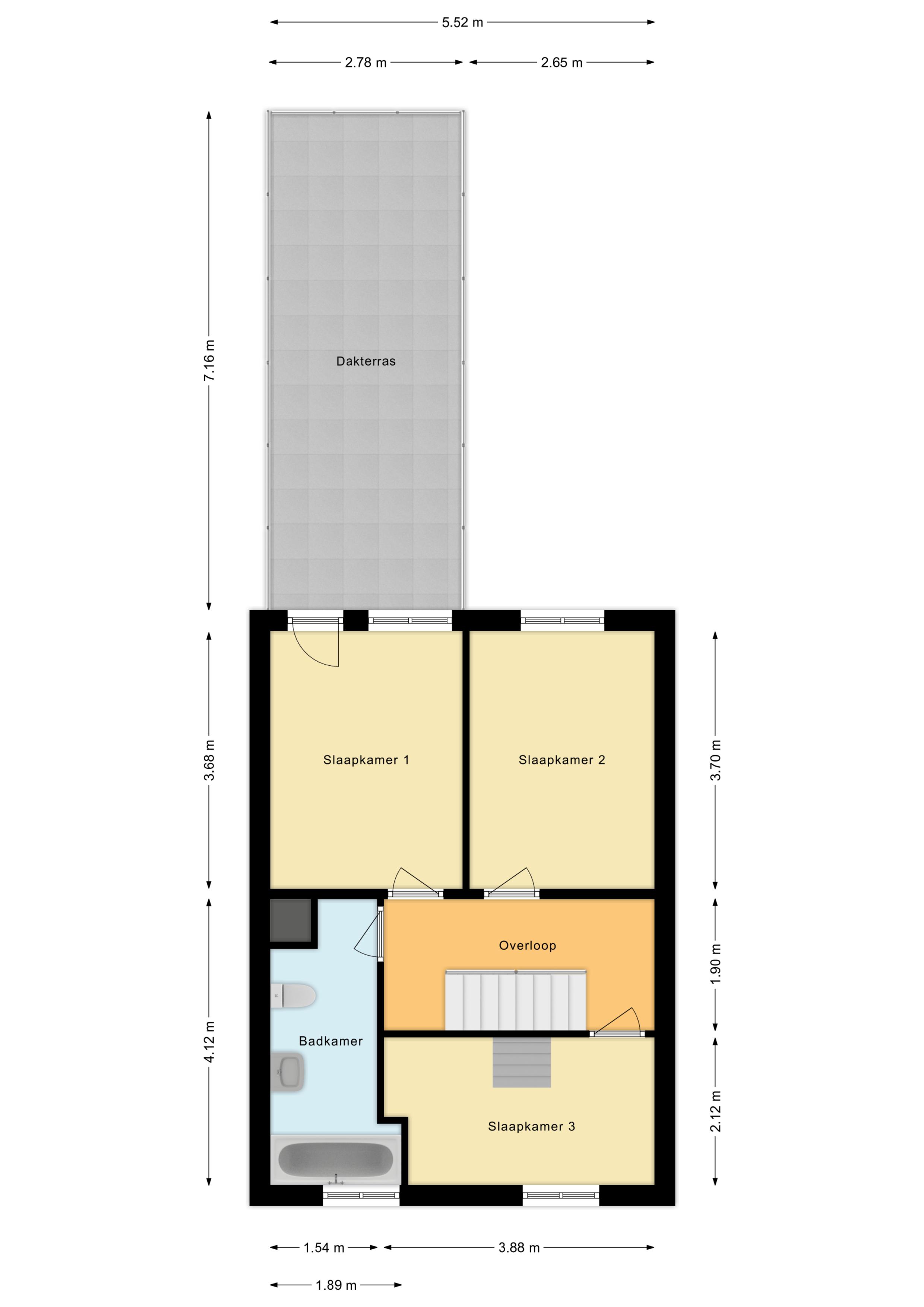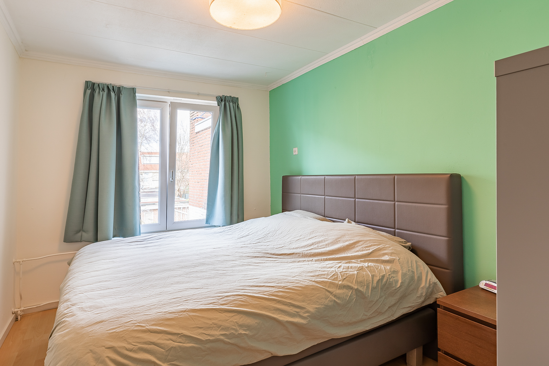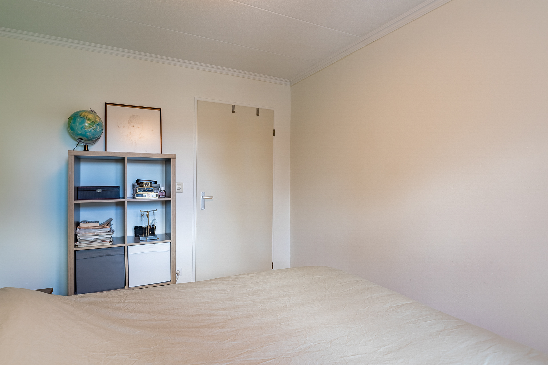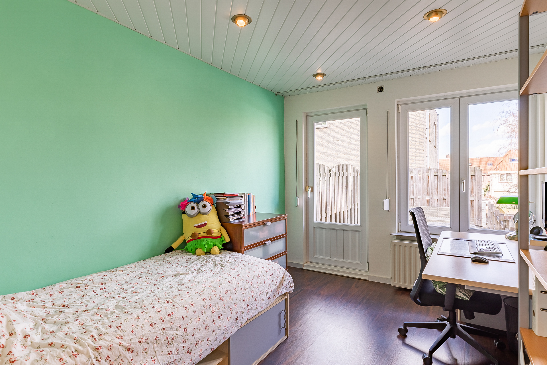 In de entree begint de vaste trap die uitkomt op de overloop van de eerste verdieping. Van daaruit zijn vervolgens drie ruime slaapkamers te bereiken. Deze zijn stuk voor stuk uitgerust met een keurige laminaatvloer. Voor de muren is gekozen voor een afwisseling van neutrale en kleurrijke afwerkingen. Verder heb je vanuit één van slaapkamers aan de achterkant toegang tot een dakterras van bijna twintig vierkante meter groot. De kozijnen aan de achterzijde zijn ook voorzien val rolluiken.