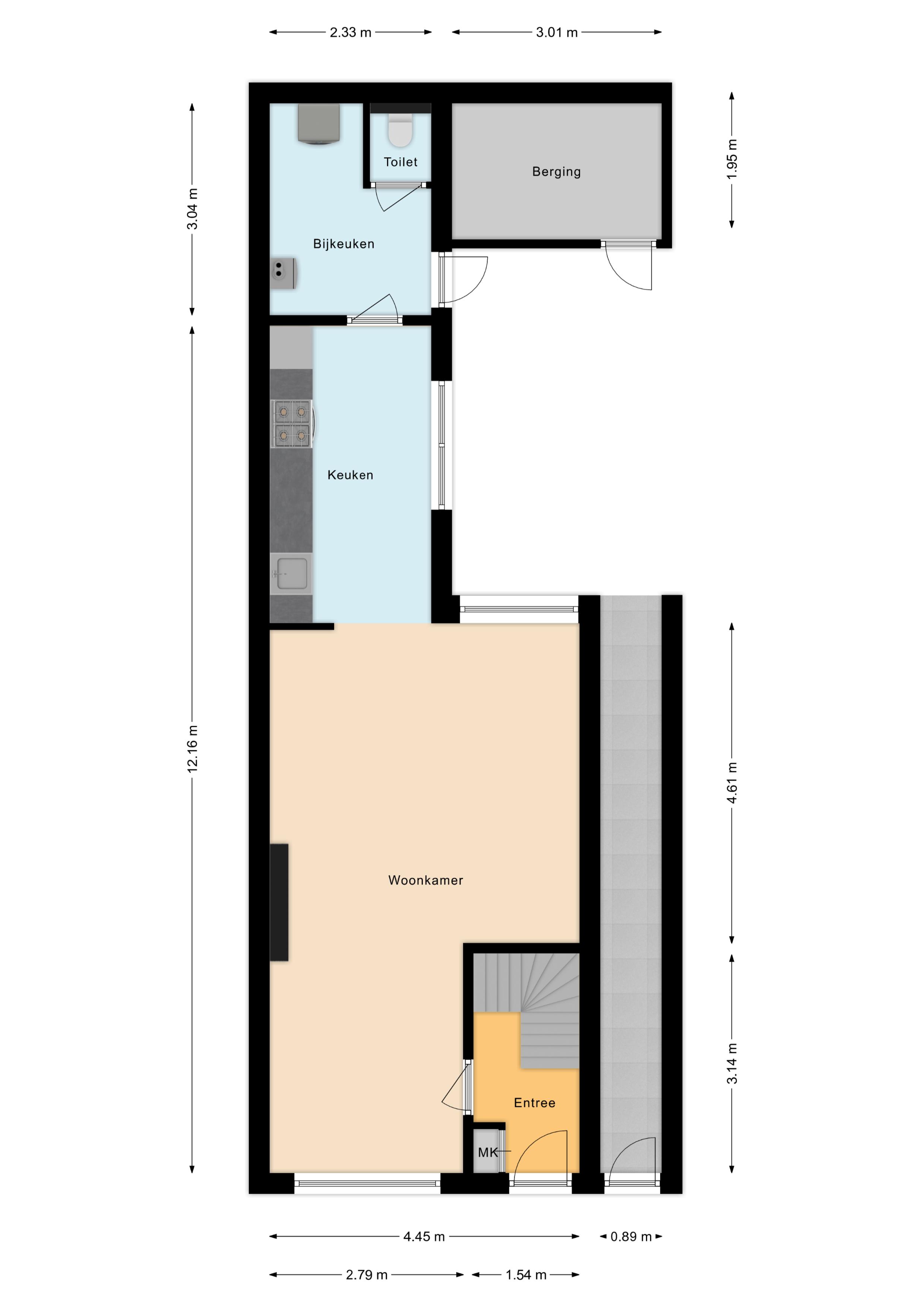 Na binnenkomst via de voordeur kom je eerst terecht in een ruime entree. Hier vind je de meterkast en vooral onder de trapopgang, genoeg ruimte om een kleine garderobe te creëren.