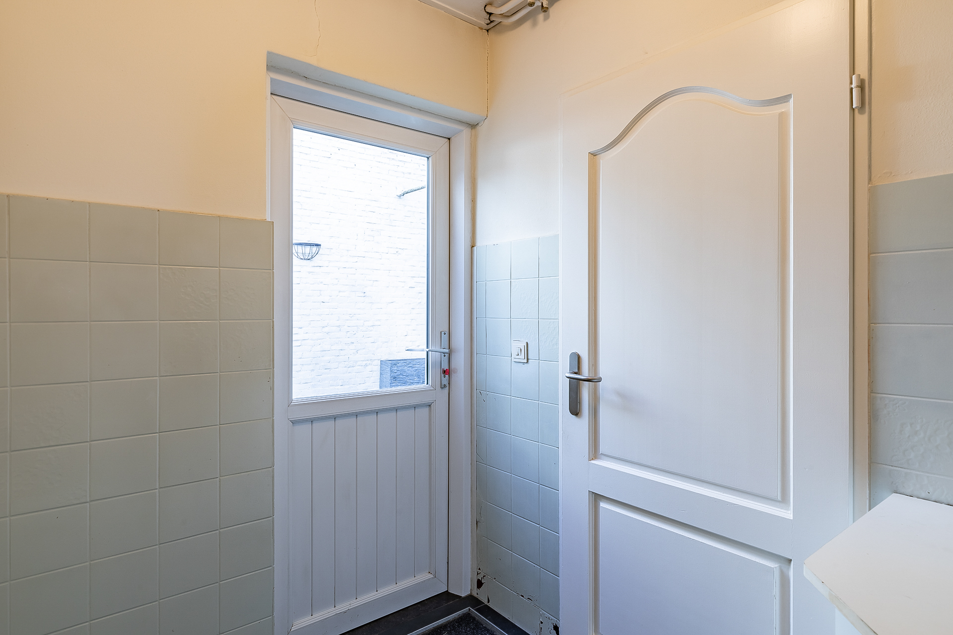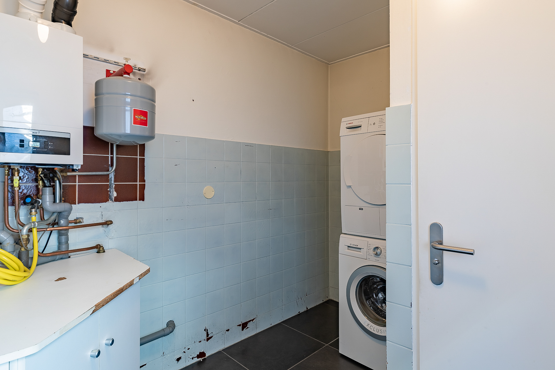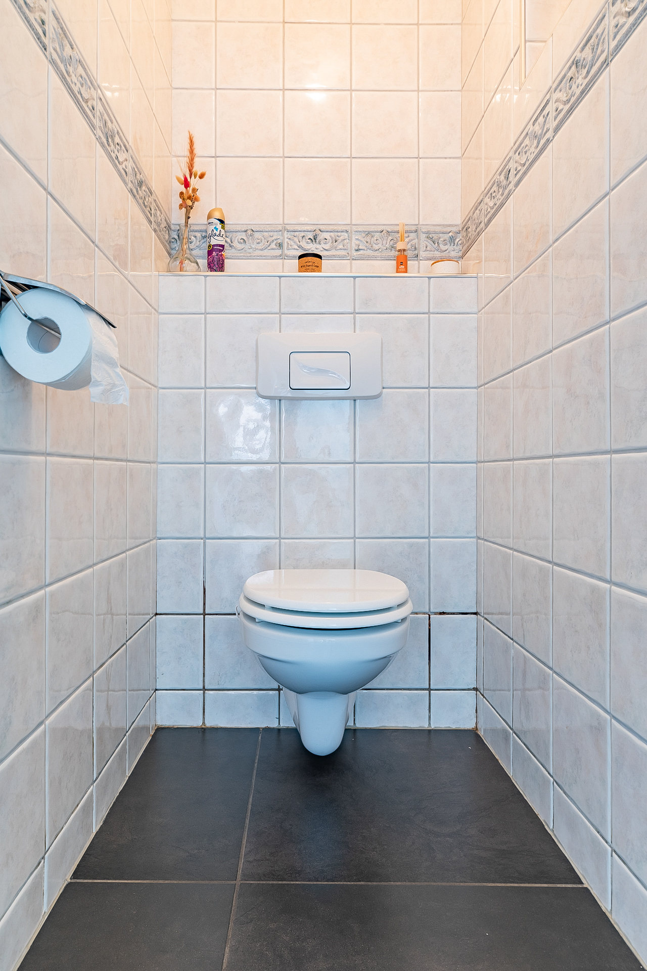 Achterin de keuken vind je de toegangsdeur tot een ruime bijkeuken, die garant staat voor veel extra opbergruimte. Daarnaast vind je in de bijkeuken de cv-ketel (uit 2019) en aansluitpunten voor een wasmachine en een wasdroger. Ook zit in de bijkeuken de toegangsdeur tot een separate toiletruimte. Deze is compleet betegeld en voorzien van een zwevend toilet.