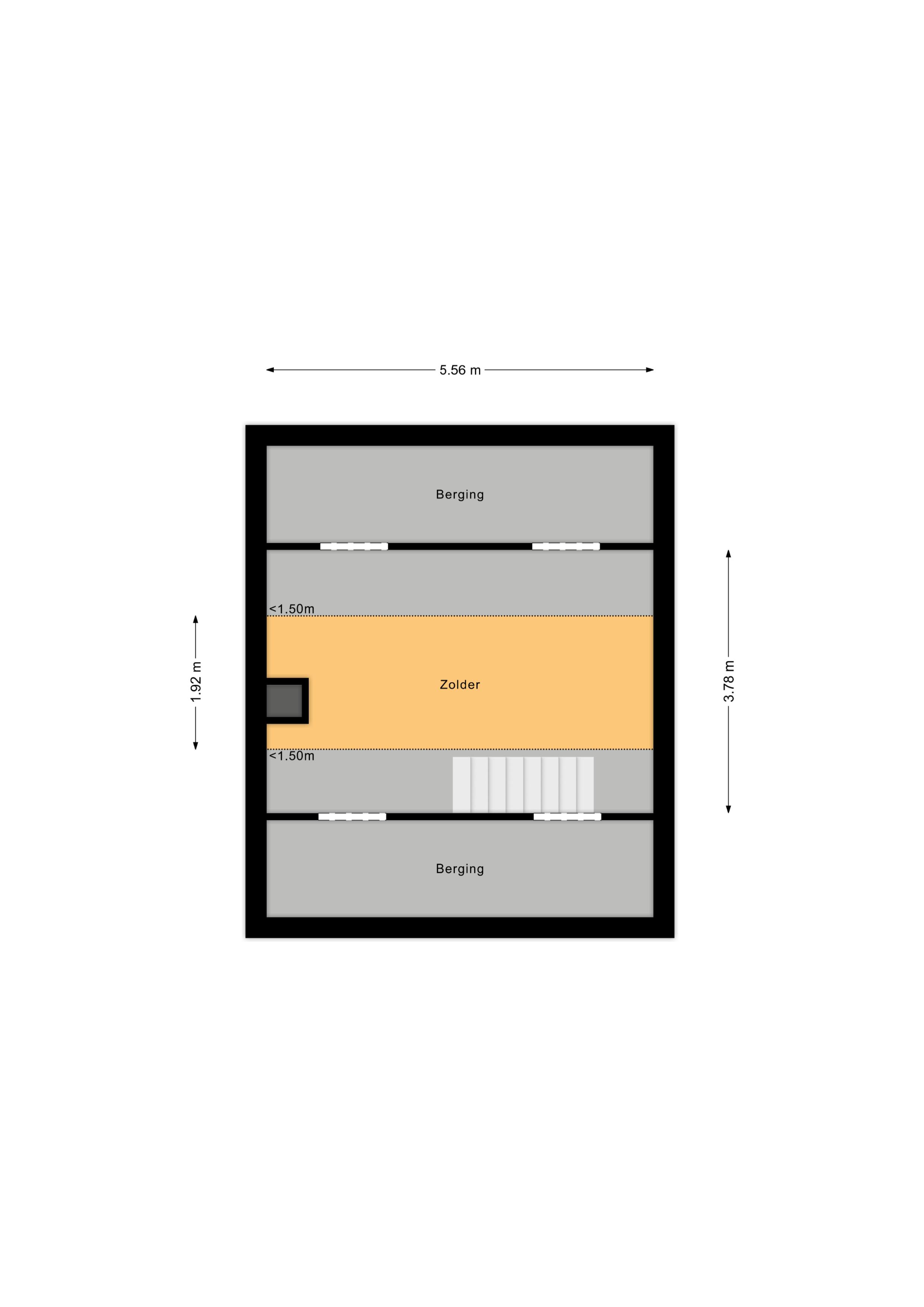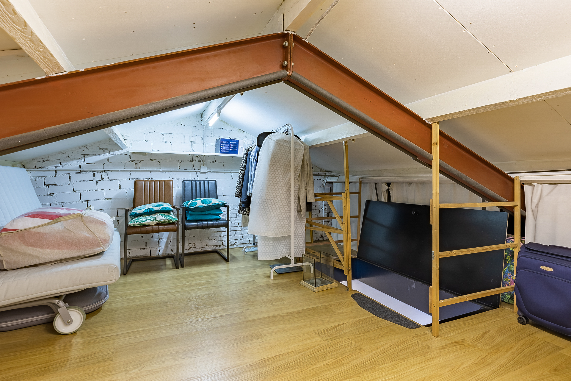 Ook de bovenste woonlaag van dit huis is via een vaste trap te bereiken. Deze zolderverdieping bestaat in feite uit één grote ruimte, die bij uitstek geschikt is om als opslagplaats te benutten.