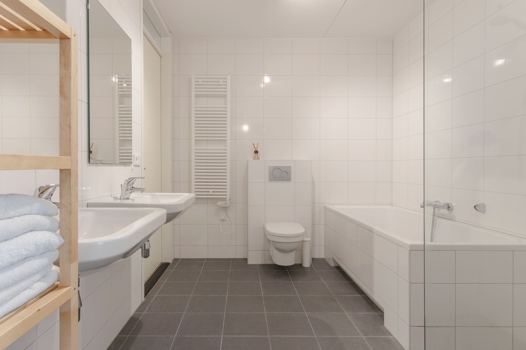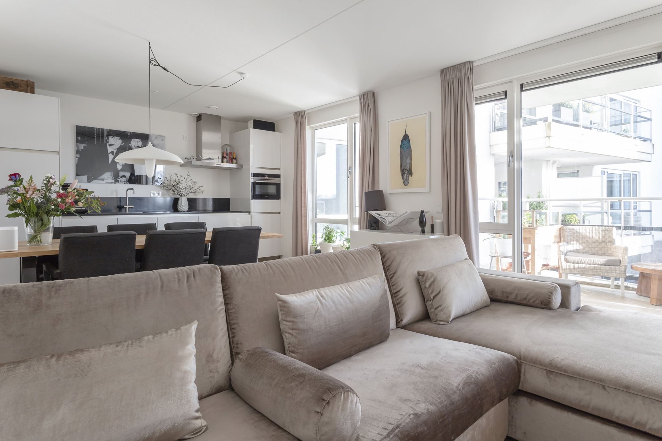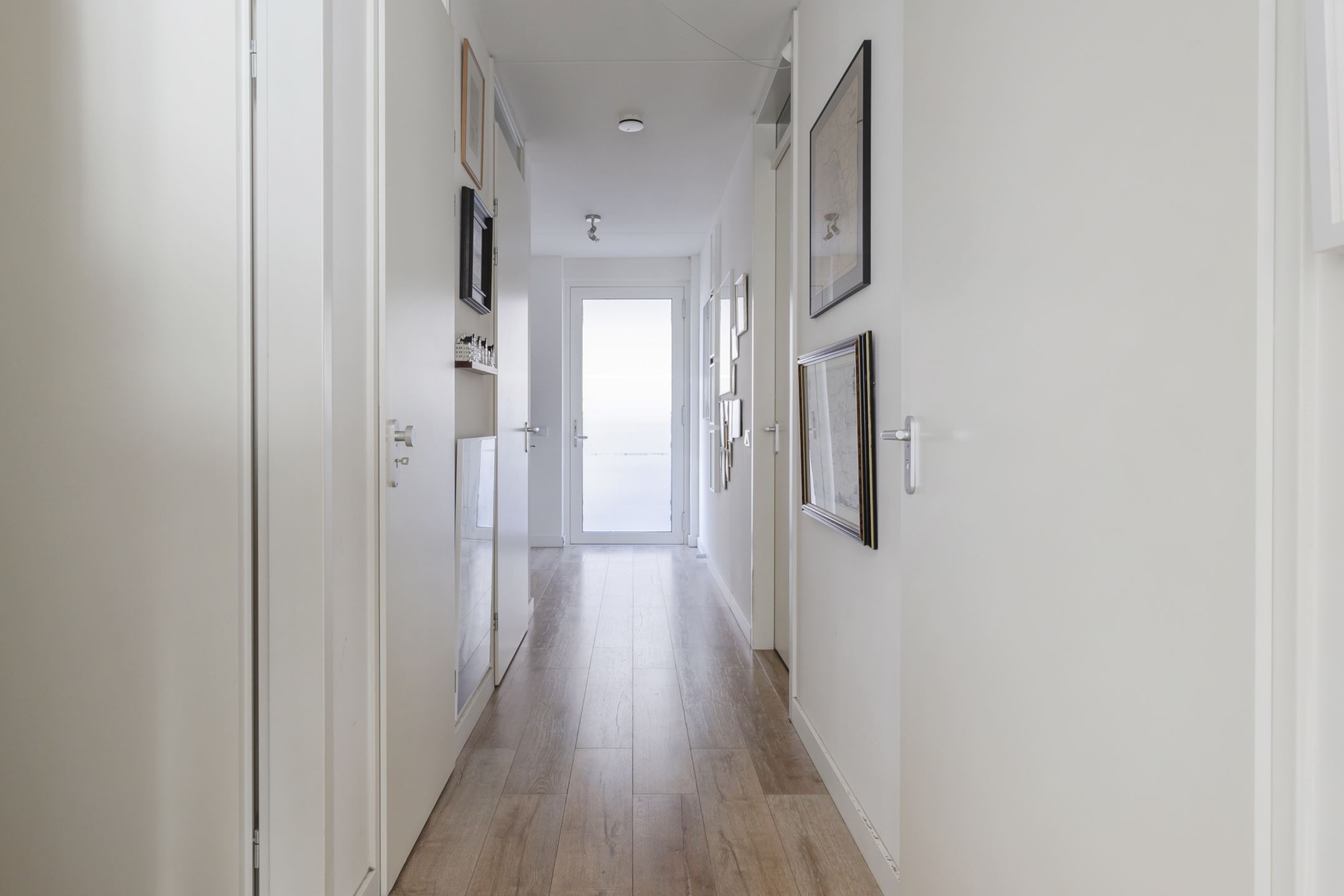 Op de begane grond bevindt zich de centrale entree hal met videofoon, bellentableau, brievenbussen en toegang tot de lift en het trappenhuis. 2e verdieping: Bovengekomen in de gezamenlijke hal die toegang geeft tot enkele appartementswoningen verkrijg je via een korte overdekte galerij voorzien van doorzichtige balustrade toegang tot de appartementswoning. De royale sfeervolle entree is afgewerkt met een pvc vloer, licht gestucte wanden en plafond. De hal met garderobe en meterkast geeft toegang tot twee net afgewerkte slaapvertrekken, toilet, badkamer, bergruimte en de woonkamer met open keuken en balkon. De luxe keuken is van Siematic, voorzien van een inductie kookplaat, combi oven, koelkast, vaatwasser, afzuigkap en granieten blad. Het appartement heeft twee slaapkamers, waarvan de hoofdslaapkamer toegang geeft tot de badkamer. Deze geheel betegelde badkamer is voorzien van een ligbad, inloopdouche, zwevend verhoogd toilet, 2 wastafels met spiegelwand en een designradiator. De toiletruimte is voorzien van zwevend toilet, urinoir en fonteintje. De bergruimte annex technische ruimte is voorzien van pvc vloer, opstelling combiketel (Intergas hre; 2015), unit mechanische ventilatie, stofzuigersysteem (Electrolux Beam, central vacuum system) en aansluiting voor de wasmachine.
