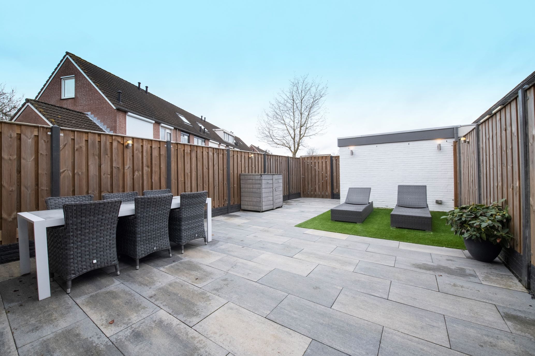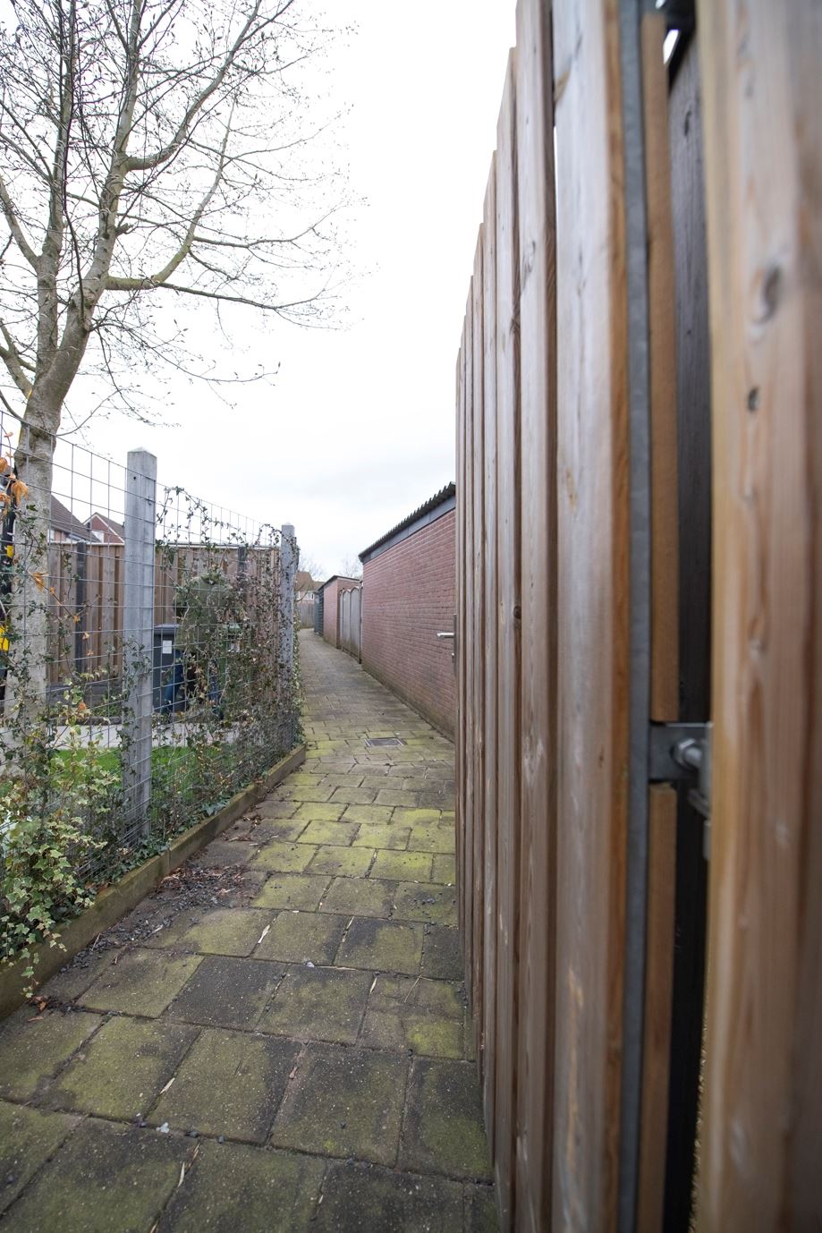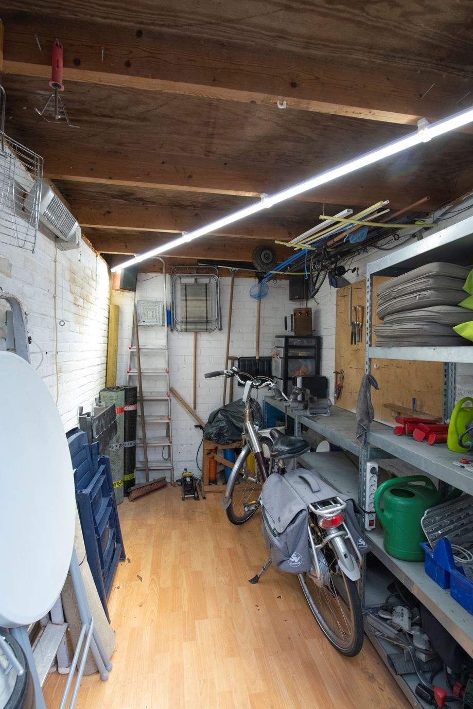 Fraaie en keurig verzorgde onderhoudsvrije achtertuin (ca. 10,30 meter diep x 5.51 meter breed) welke op het noorden is gelegen, met achterom en voorzien van sierbestrating, kunstgras, verlichting en elektra. Achter op het perceel staat de vrijstaande stenen berging (ca. 6m²) v.v. elektra. De poort is 140 cm breed, wat zeer handig is met een motor of scooter.