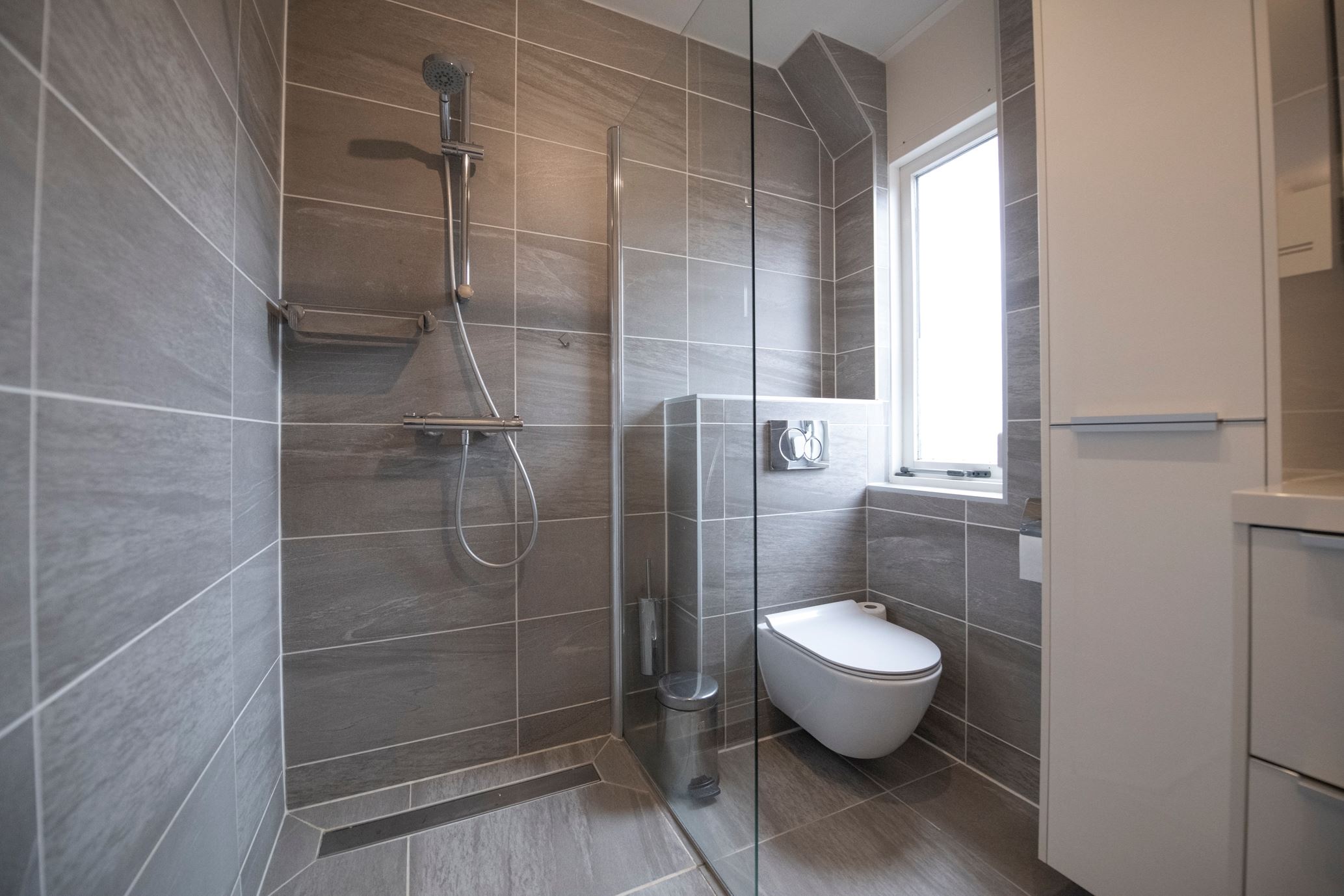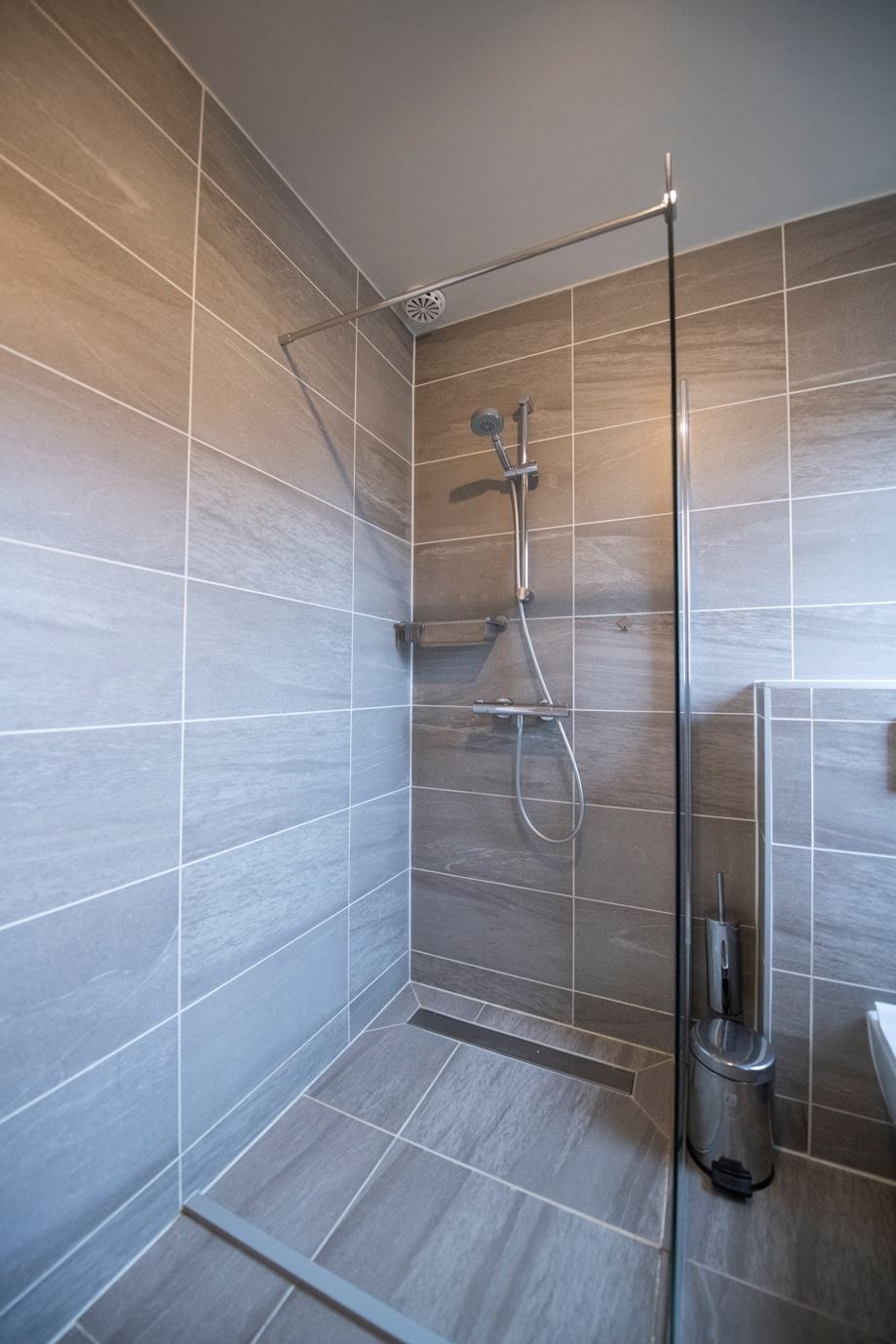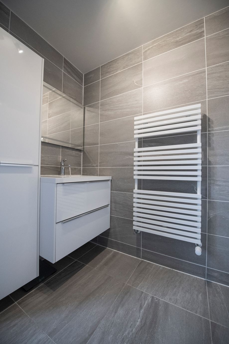 De zeer nette en moderne badkamer is volledig betegeld en ingericht met wastafelmeubel, wandcloset met inbouwreservoir, inloopdouche en designradiator.