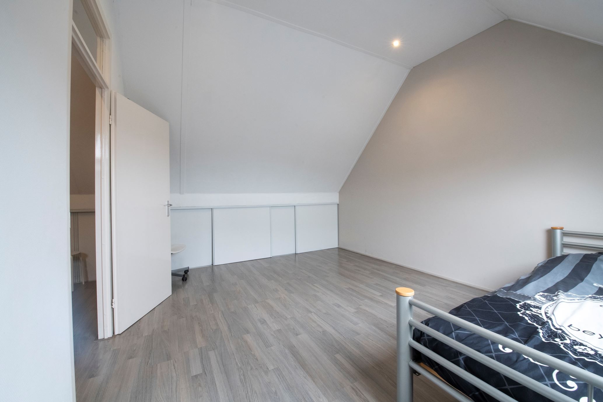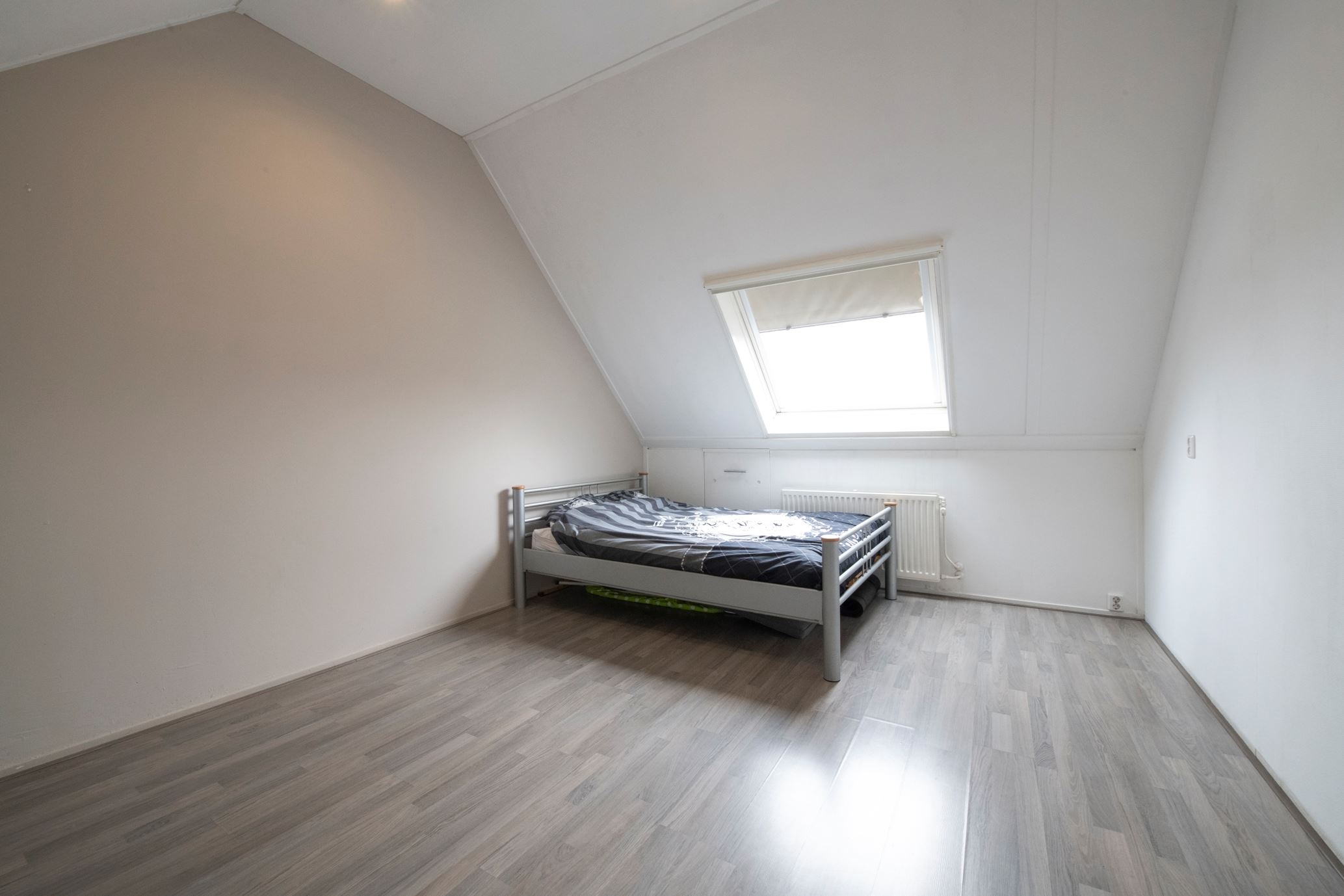 Grote zolder/slaapkamer (afm. ca. 4.22 x 3.66m) met groot velux dakraam, laminaatvloer en veel bergruimte over de gehele breedte aan beide kanten achter de knieschotten.
