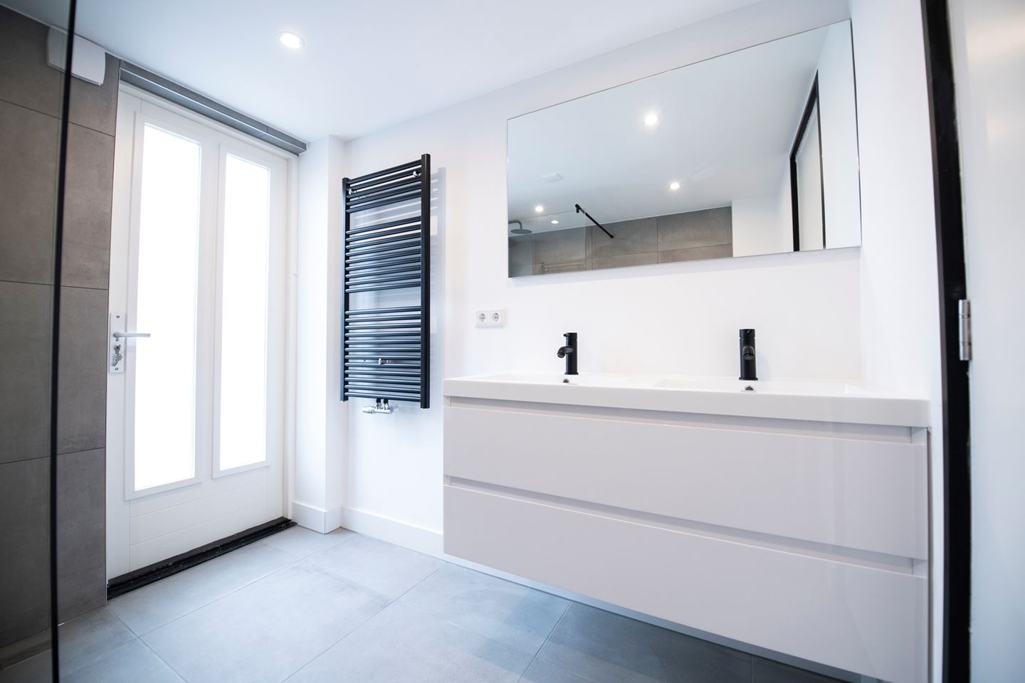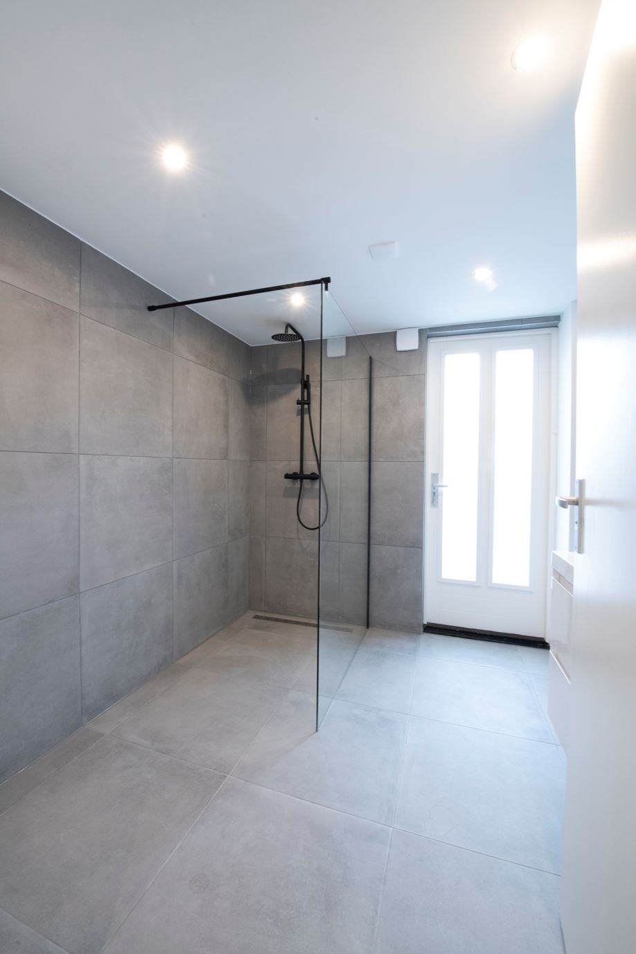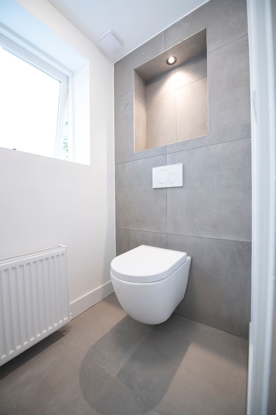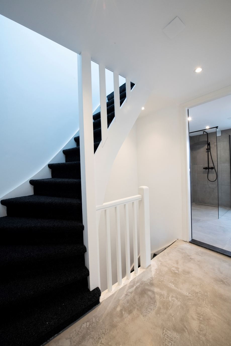 Middels de trap in de hal komt u op de overloop van de eerste verdieping. Er zijn twee hele ruime slaapkamers. Beiden hebben een ingebouwde kast en de gehele verdieping is voorzien van inbouwspots in het plafond. De nieuwe badkamer aan de achterzijde is voorzien van een grote inloop douche met glazen wanden, radiator en dubbele vaste wastafel met meubel. Aan de voorzijde is een geheel nieuw zwevend toilet met radiator, fontein en mengkraan.