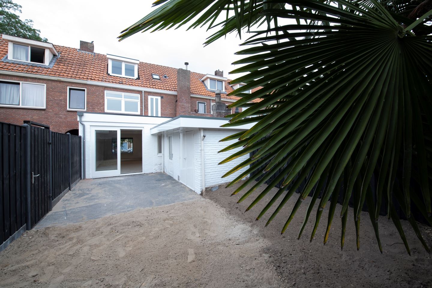 De tuin is ook helemaal vernieuwd met een nieuwe houten schutting en poort.. Tegen de woning aan is ook een berging. Het terras is helemaal betegeld en de palmbomen zorgen voor een unieke sfeer.