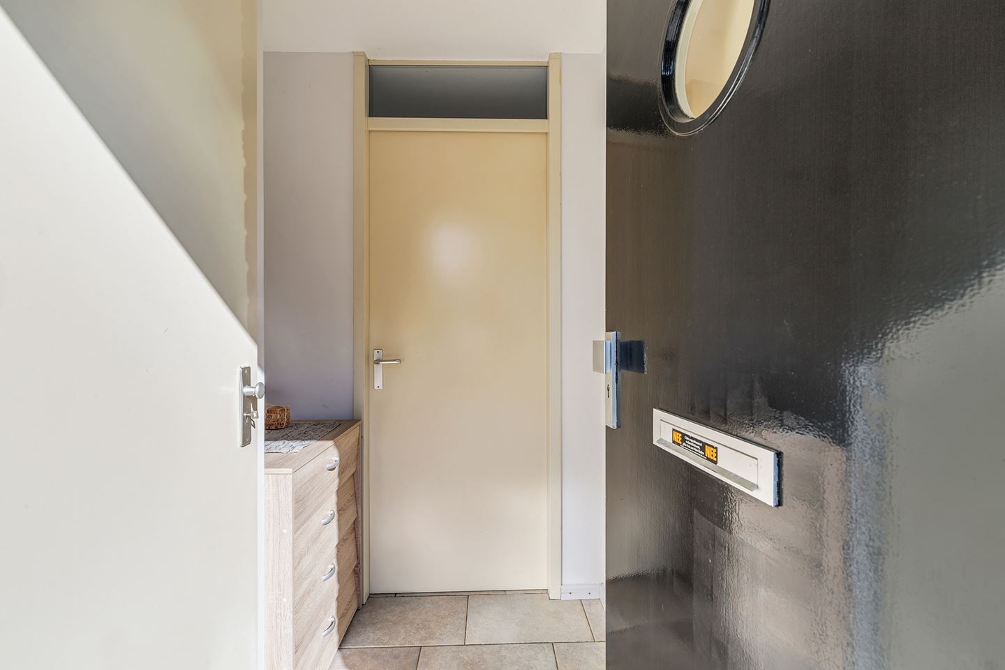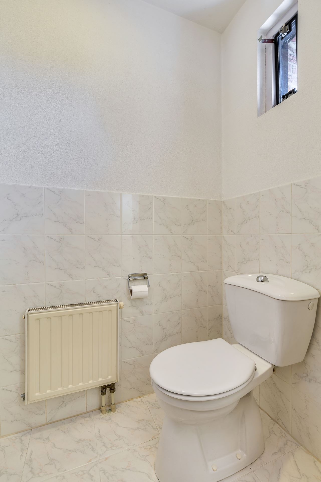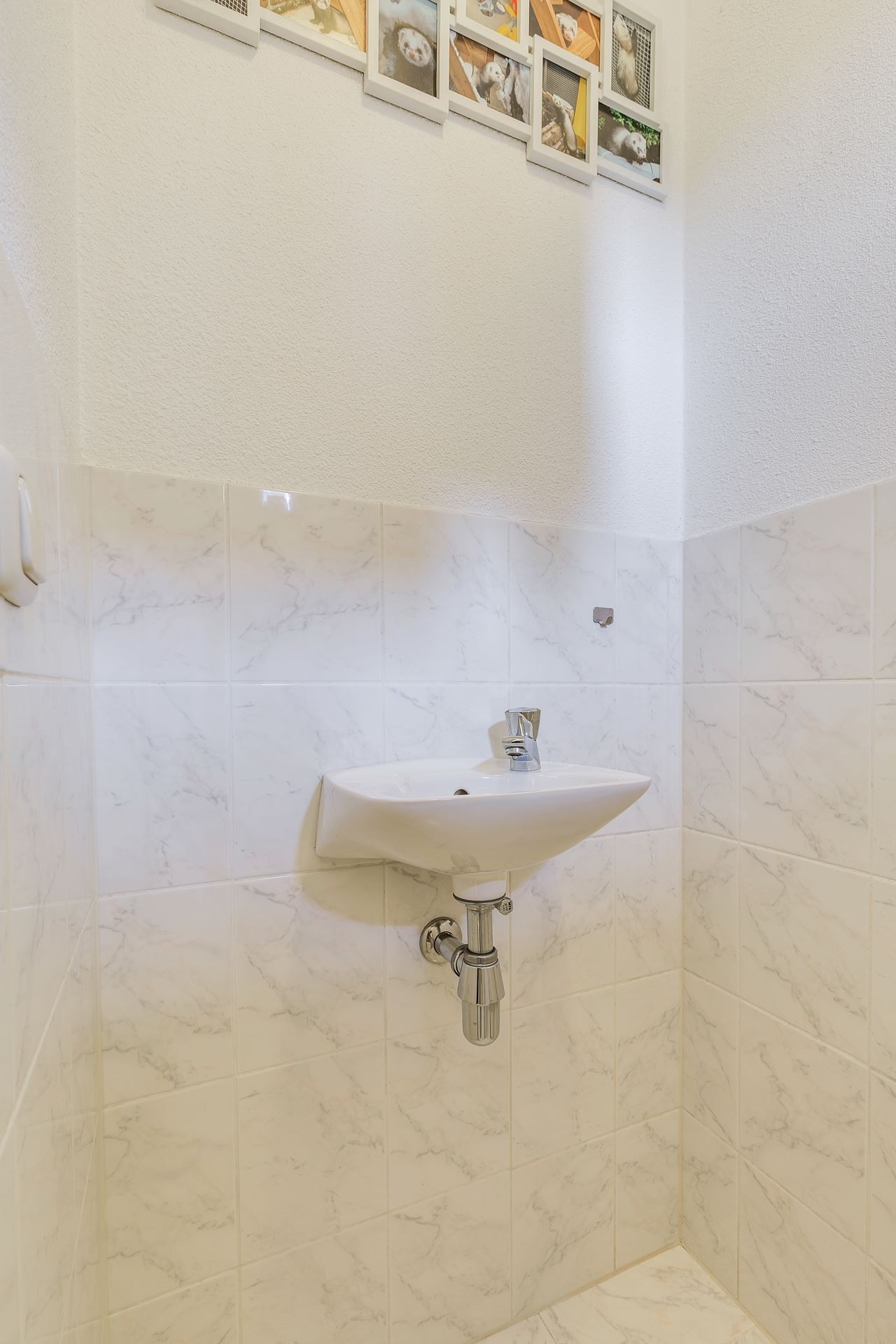 Hal met tegelvloer, meterkast, gedeeltelijk betegeld toilet met fonteintje. Ruime lichte woonkamer met tegelvloer en bergkast onder de trap.