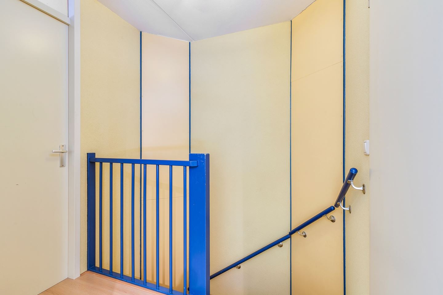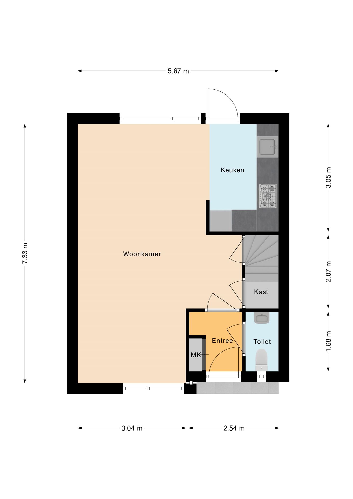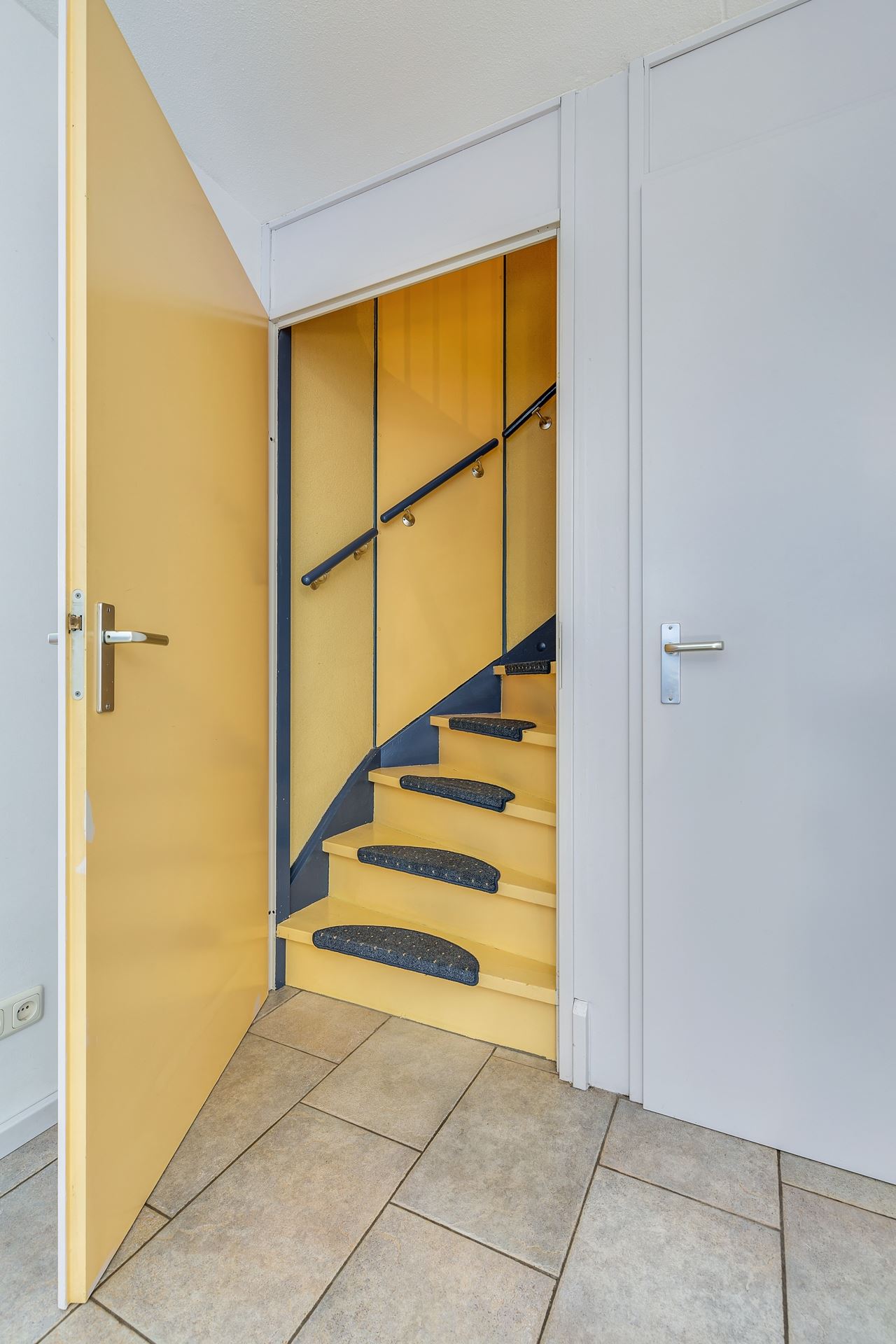 Hal met tegelvloer, meterkast, gedeeltelijk betegeld toilet met fonteintje. Ruime lichte woonkamer met tegelvloer en bergkast onder de trap.