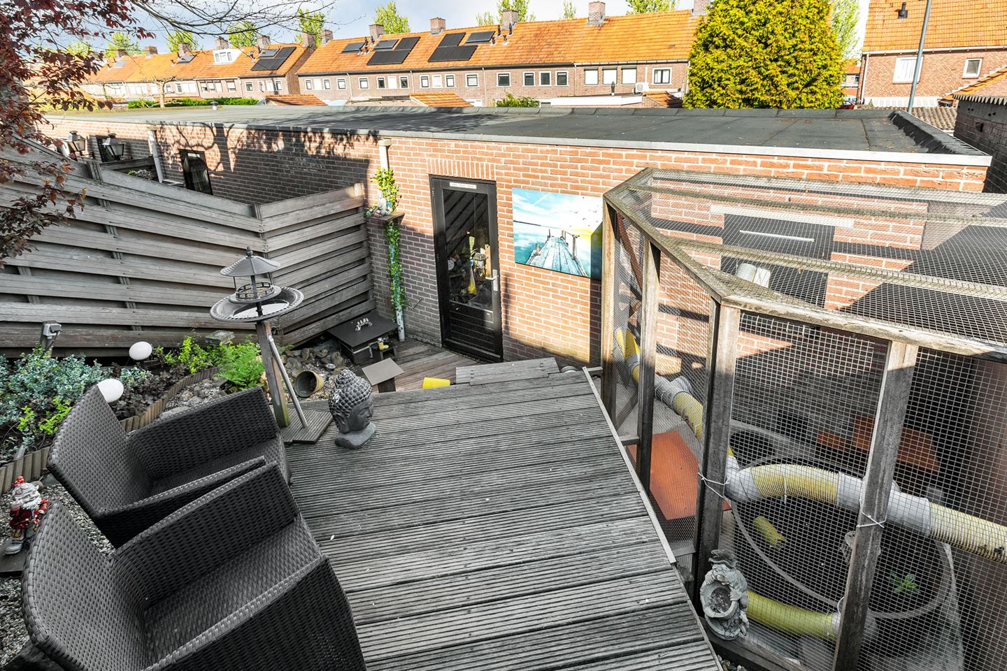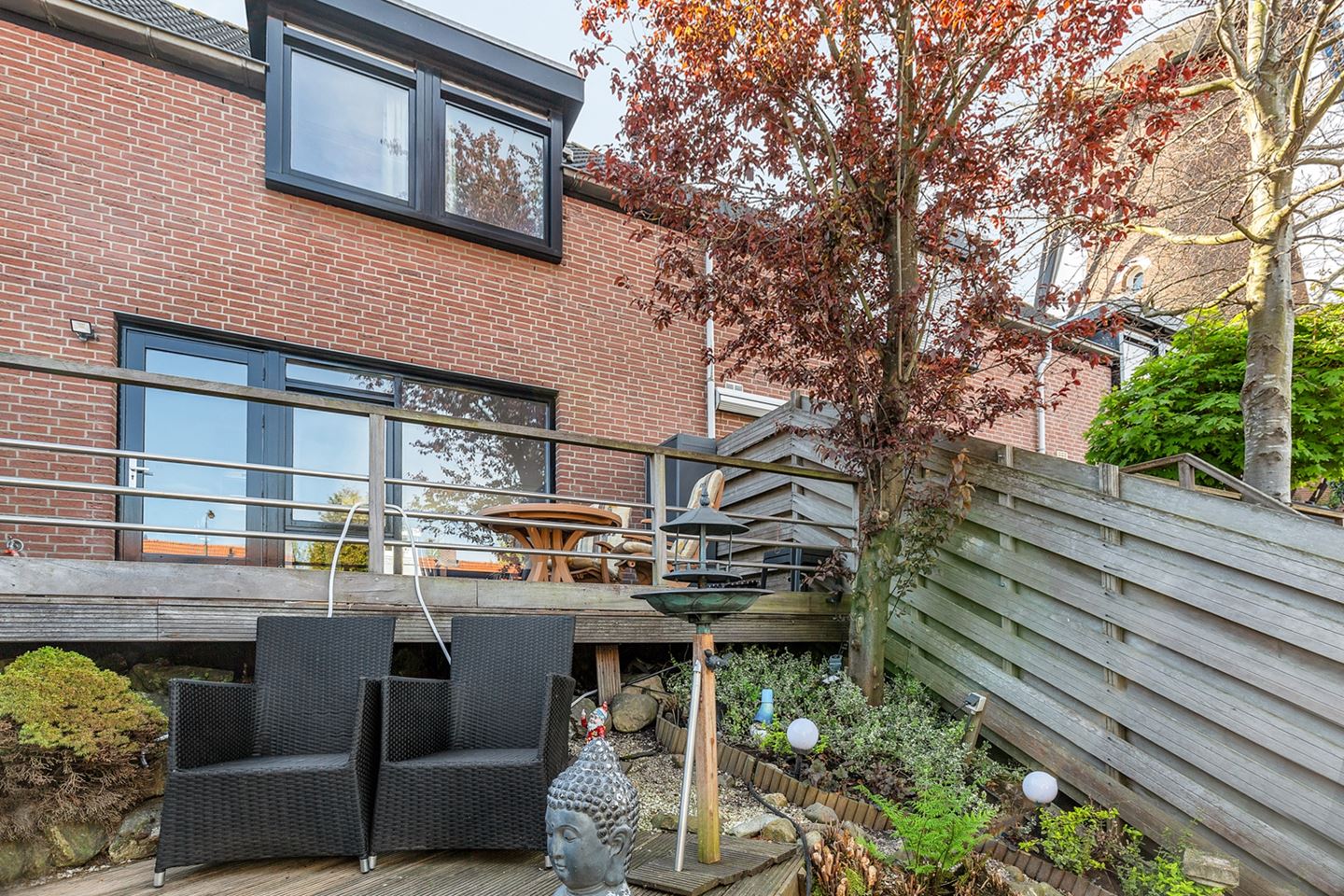 De achtertuin is mooi speels aangelegd met een niveauverschil. Direct tegen het huis ligt een mooi groot terras voorzien van nieuwe vlonders om later op de dag te genieten van de heerlijke zon. Via het verlaagde tweede deel van de tuin bereik je de 2 garages berging welke voorzien zijn van elektra. Hoe ideaal is dit in het centrum van Zevenbergen. De tuin is voorzien van elektra, buitenkraan, buitendouche en bewateringsysteem.