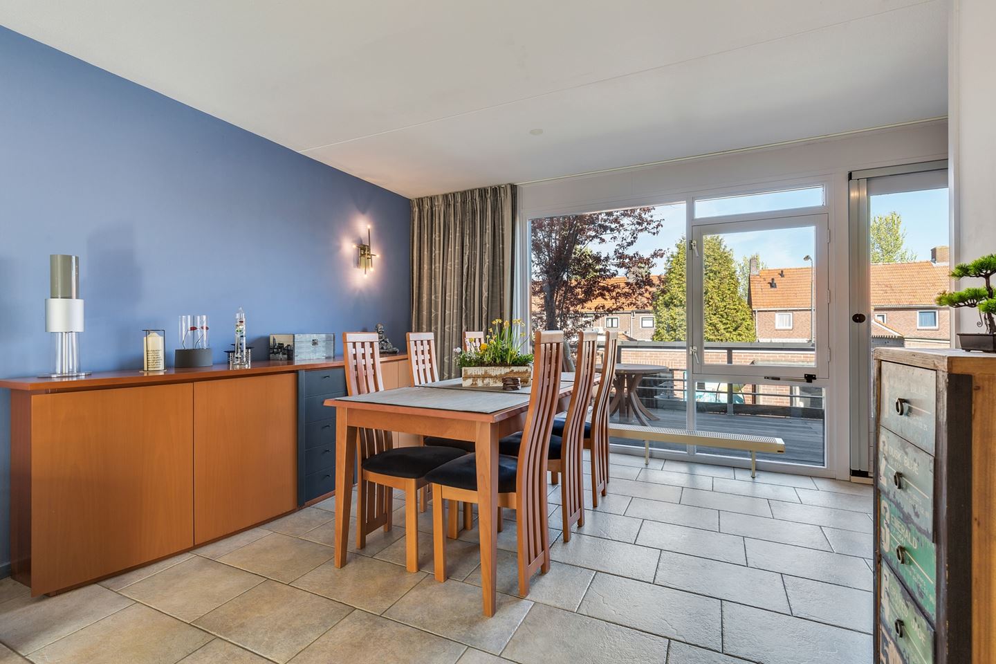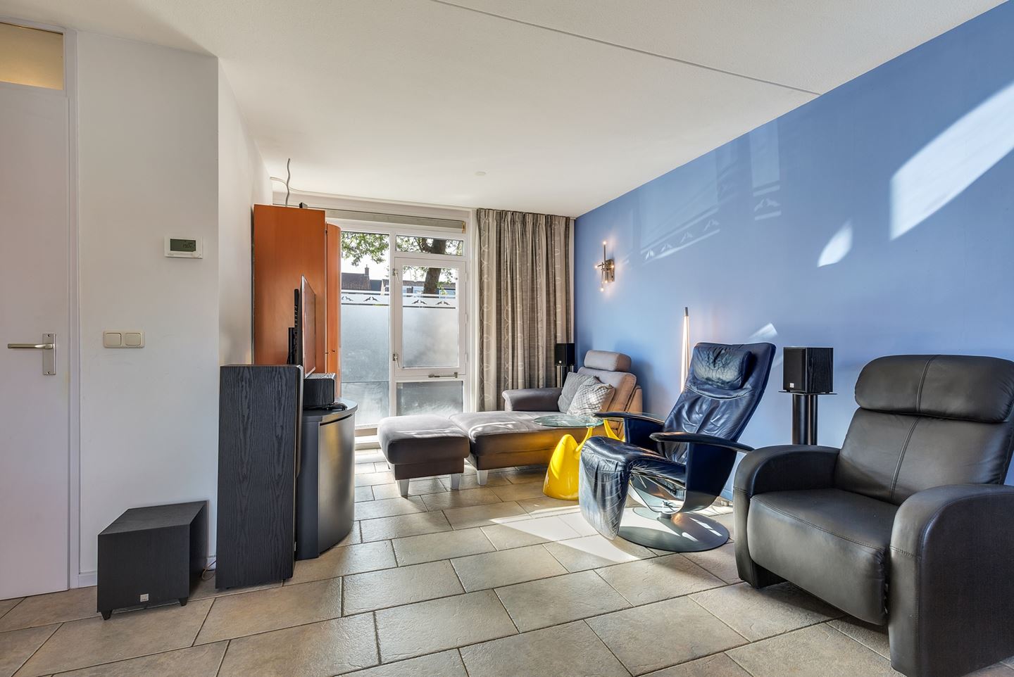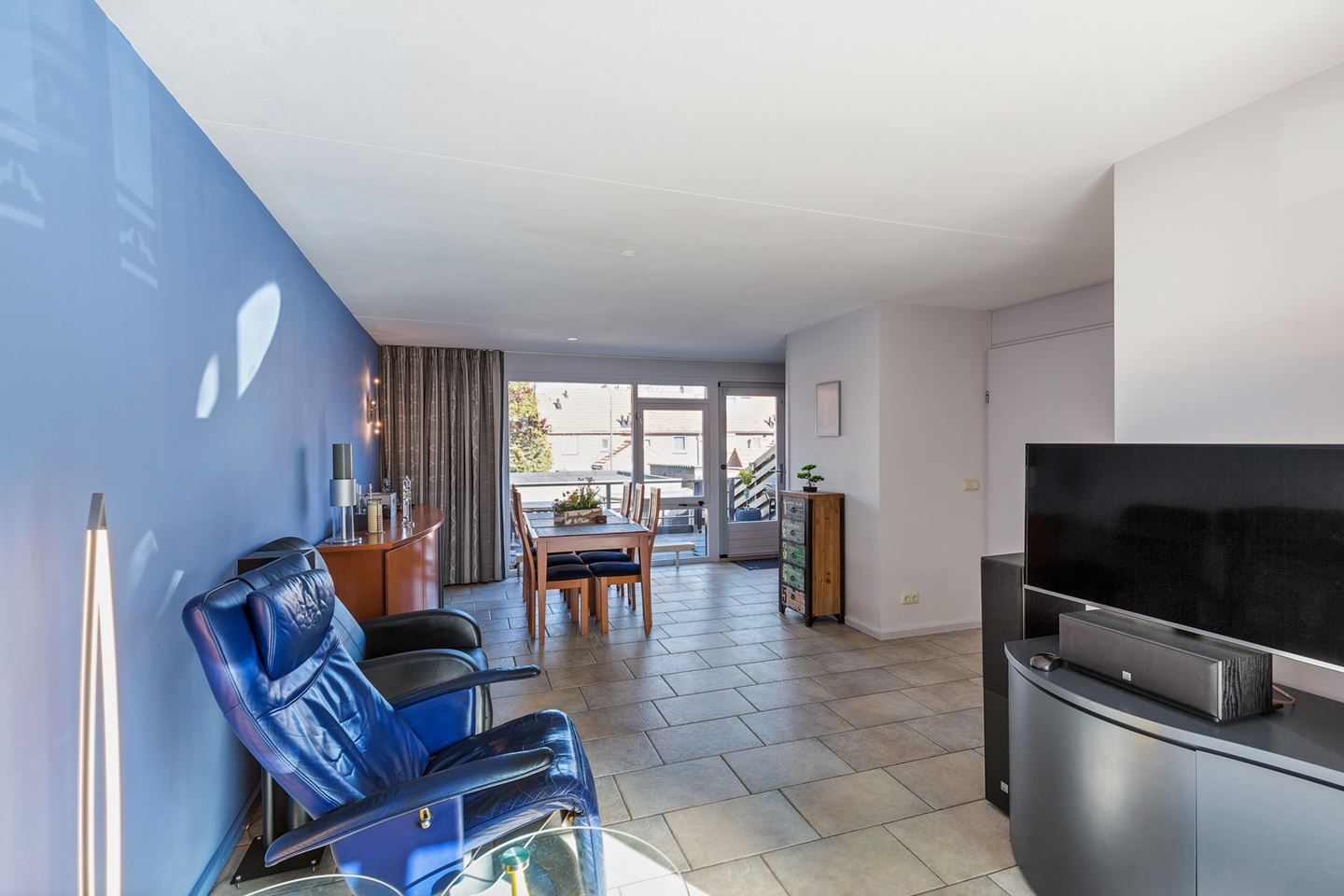 Vanuit de woonkamer is er een deur naar de achtergelegen tuin met 2 garages.