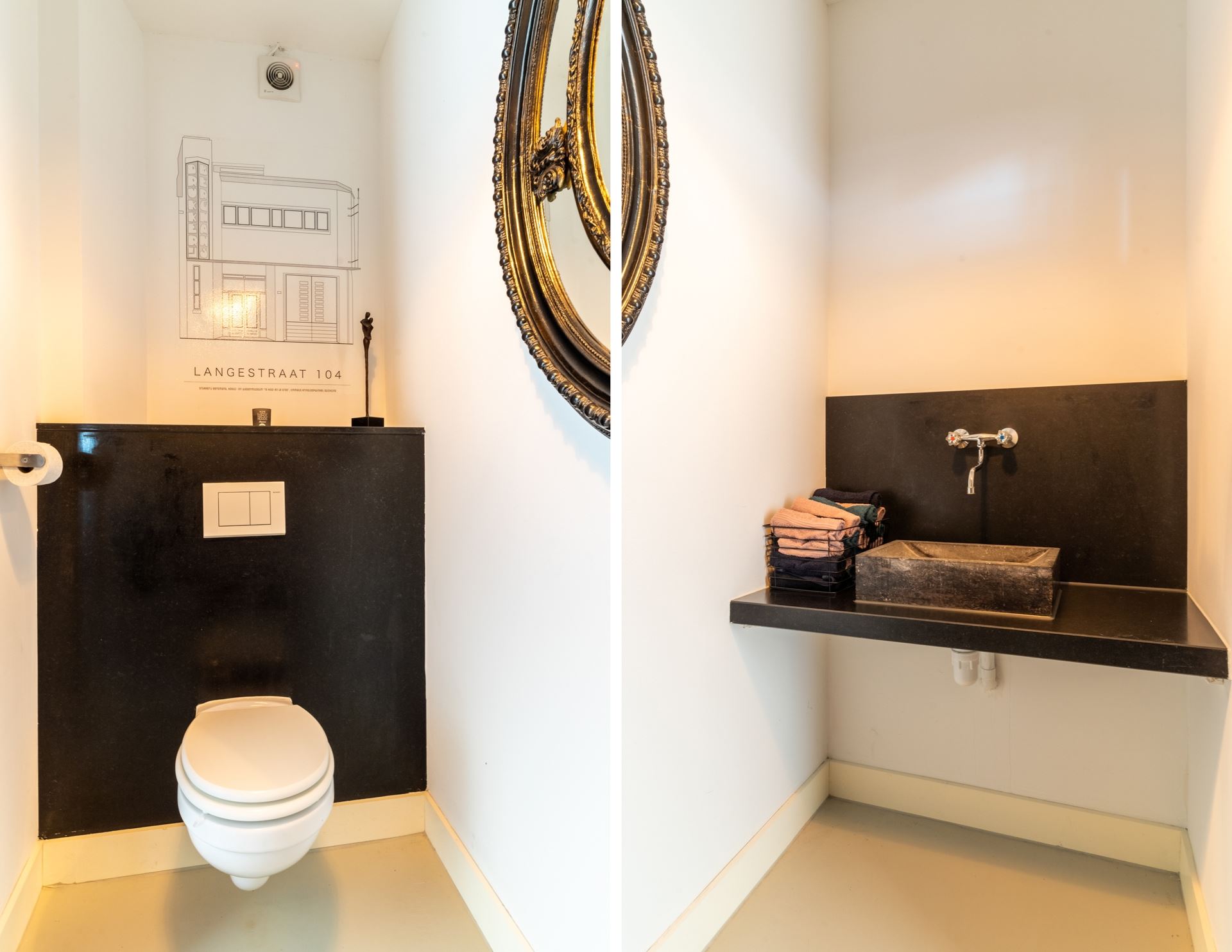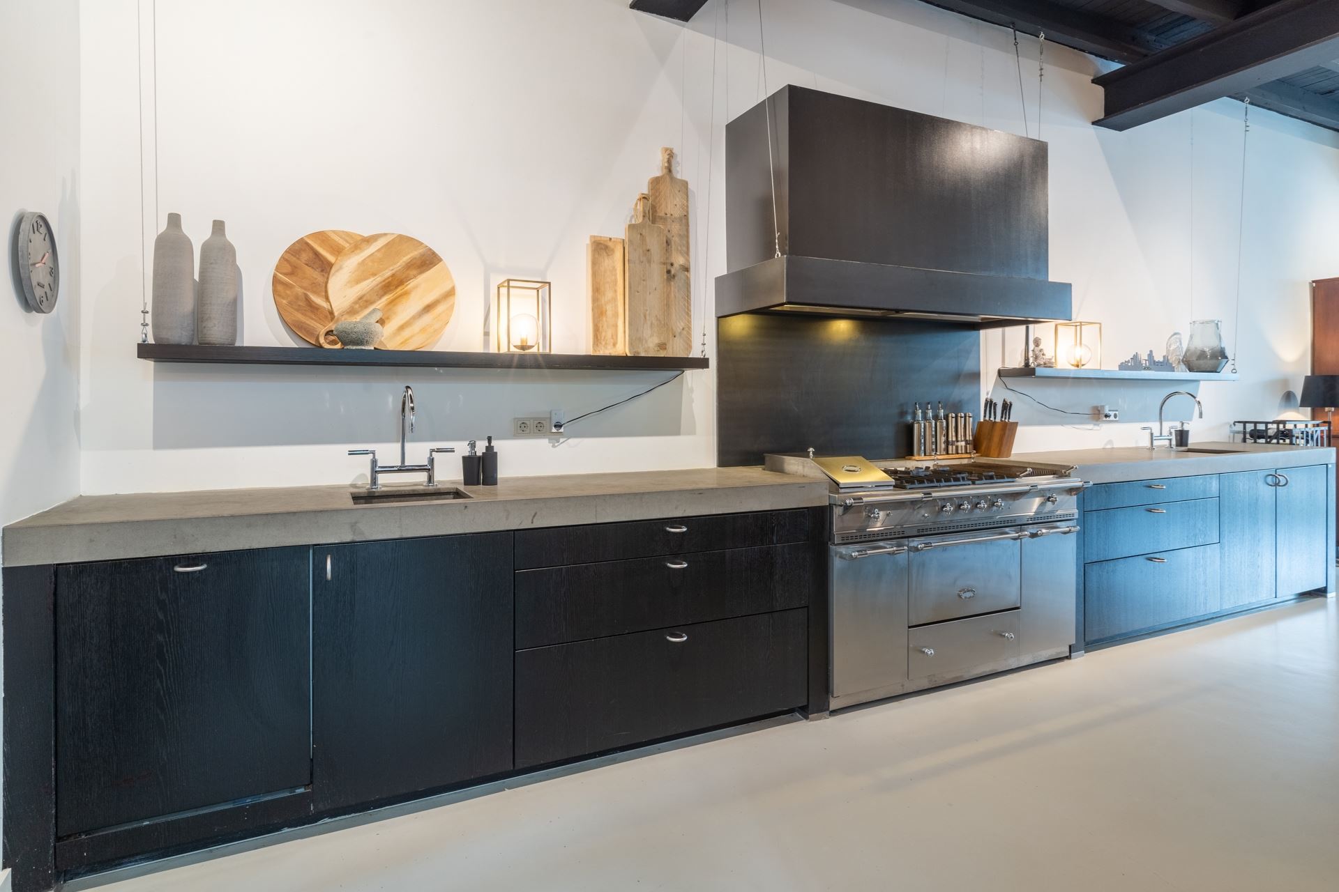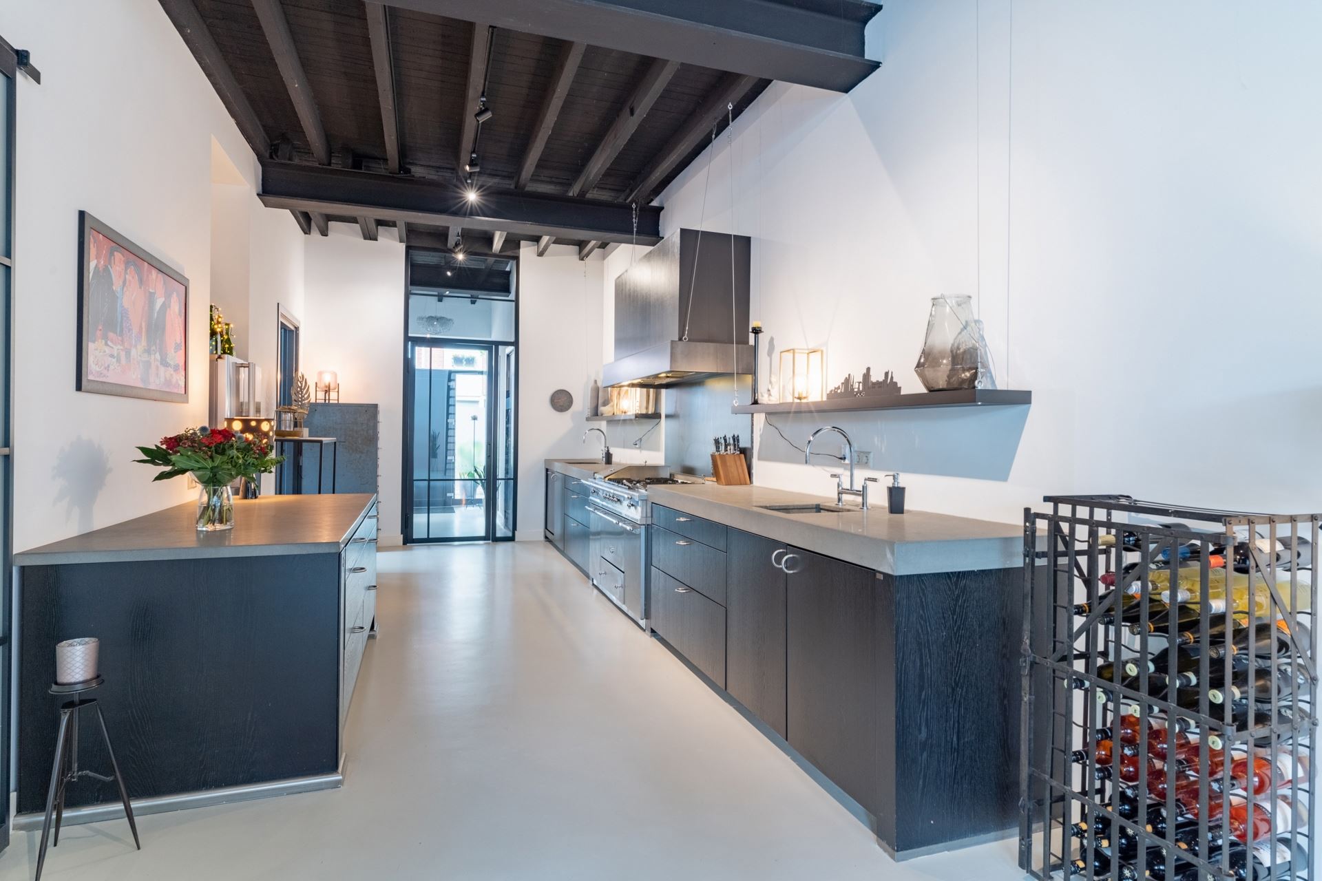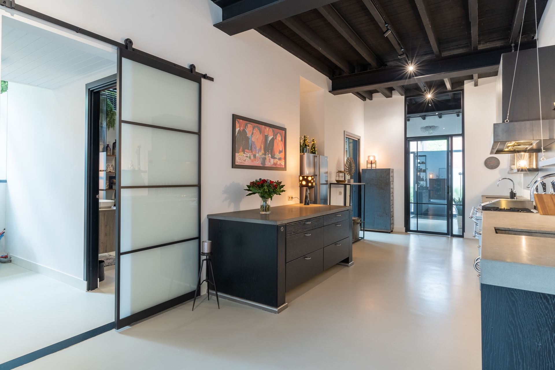 Overdekte entree met intercom, hal met toiletruimte v.v. wand closet met natuurstenen fontein op werkblad. Naastgelegen ruime werkkast. Doorloop naar de uitzinnige, geheel gestuukte open woonkeuken met een compleet Bax-keukenblok v.v. o.a. professioneel Lacanche kooktoestel, nis voor een grote Amerikaanse koelkast en combimagnetron.