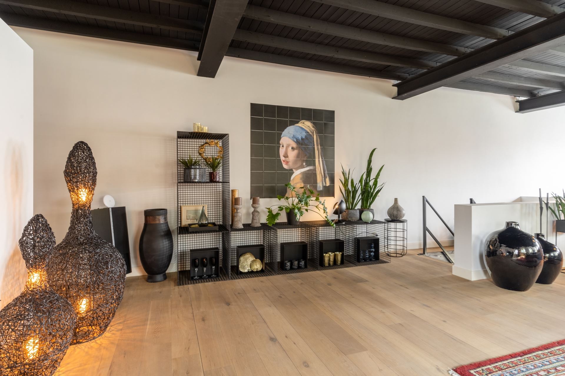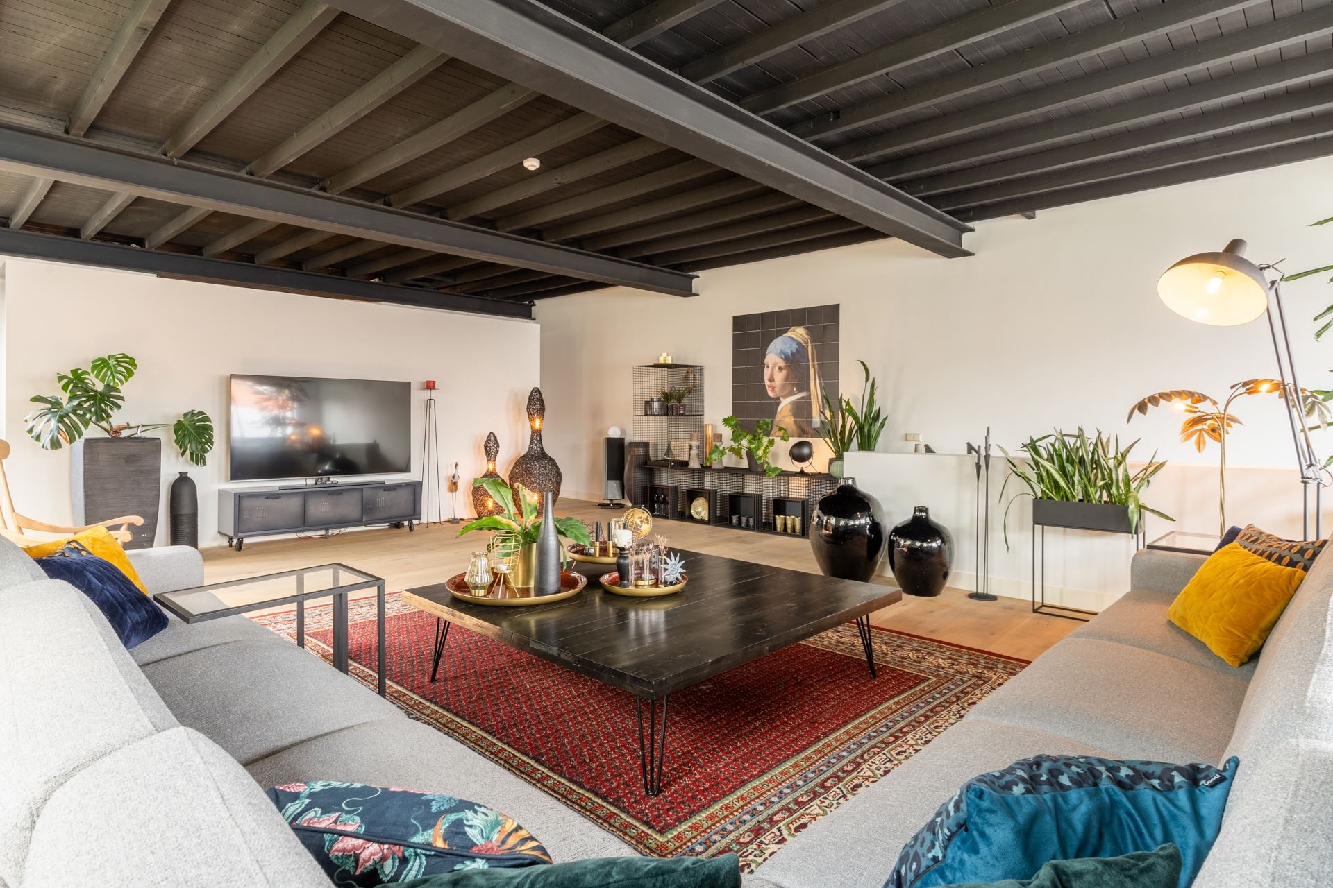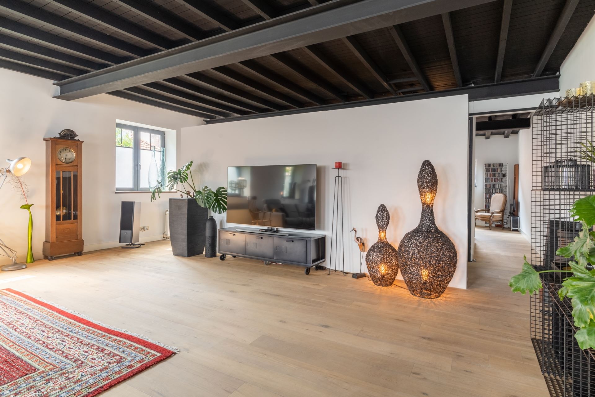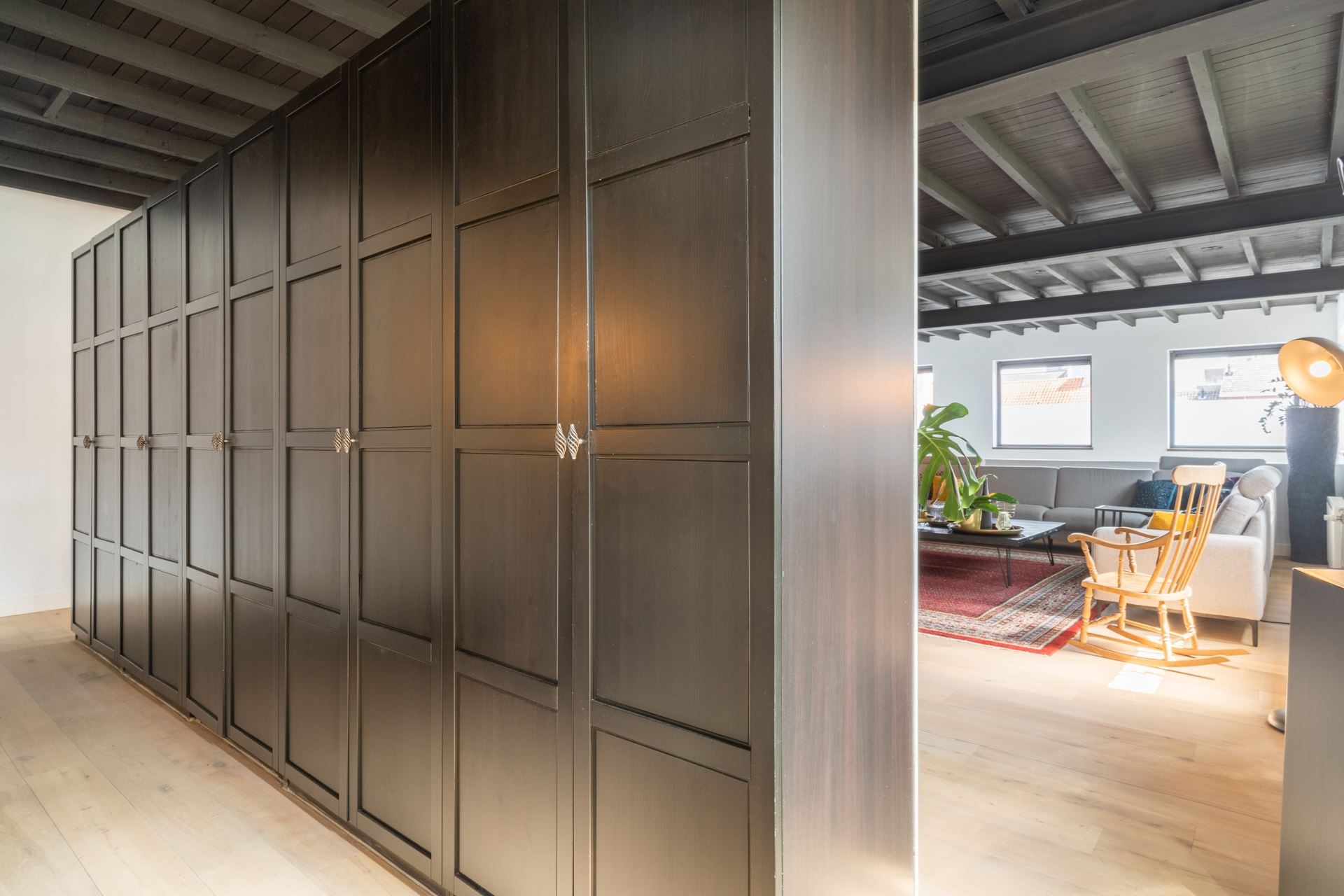 Middels de trap via de woonkeuken toegang tot de ruime woonkamer met aan de achterzijde de vide. Aan de andere zijde van de woonkamer een grote wand bestaande uit een kastenwand. Tegenover gelegen zijn de twee slaapkamers met daartussen de badkamer. De gehele eerste verdieping (m.u.v. de badkamer) is voorzien van een prachtige Chinees eiken plankenvloer, stukadoorswerk op de muren en de authentieke balkenplafond met de stalen spanten nog in het zicht, zeer fraai, donker afgewerkt.