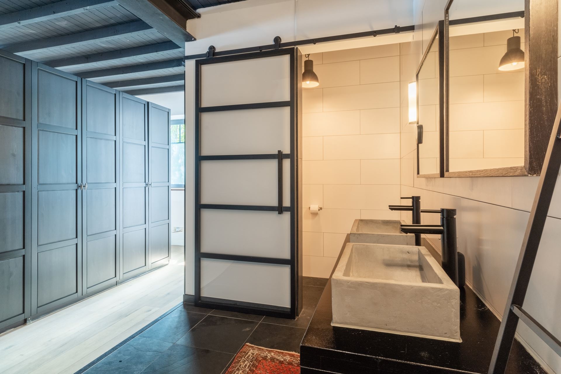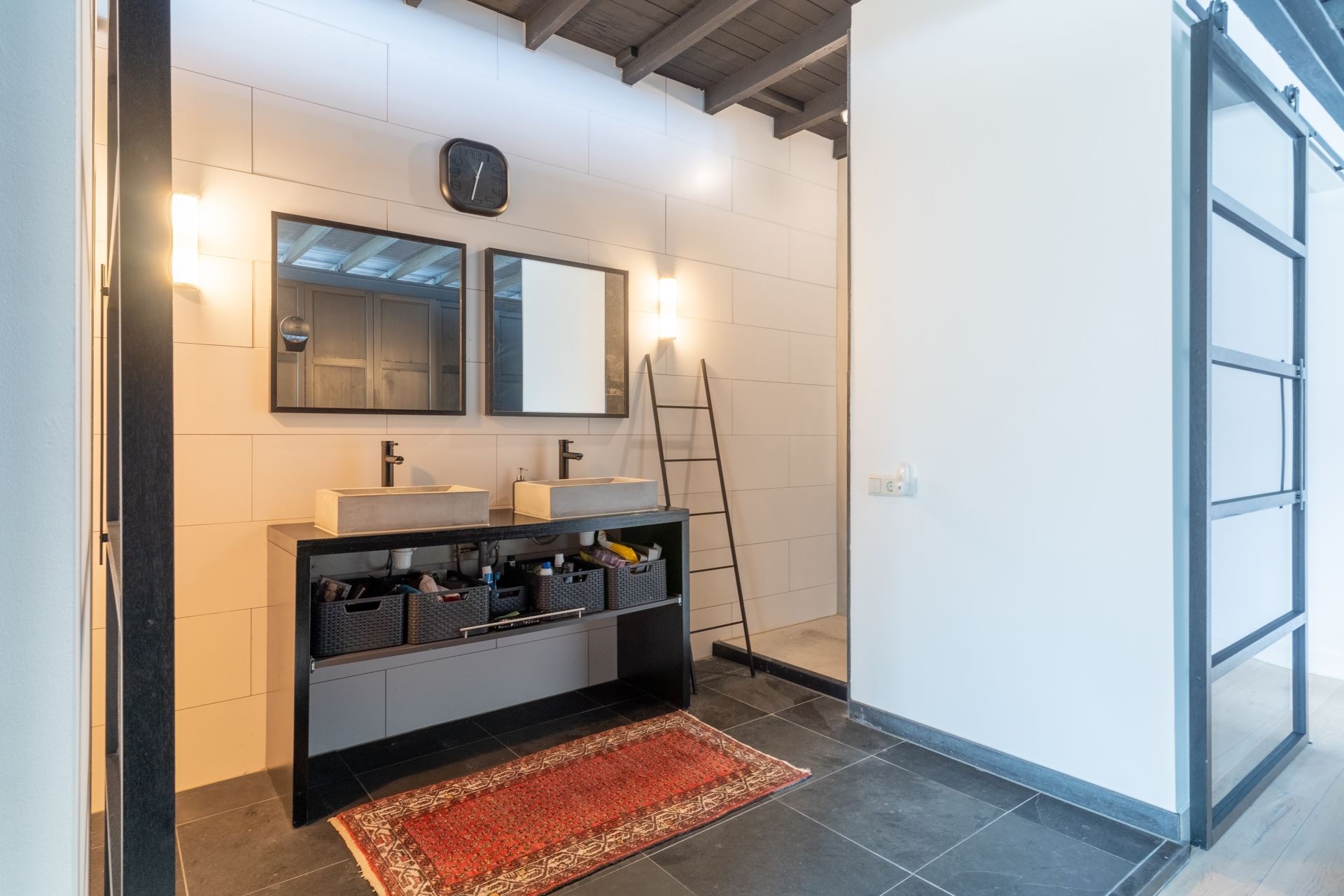 Deze is volledig betegeld en v.v. een dubbele natuurstenen wastafel, toilet en de inloopdouche.
