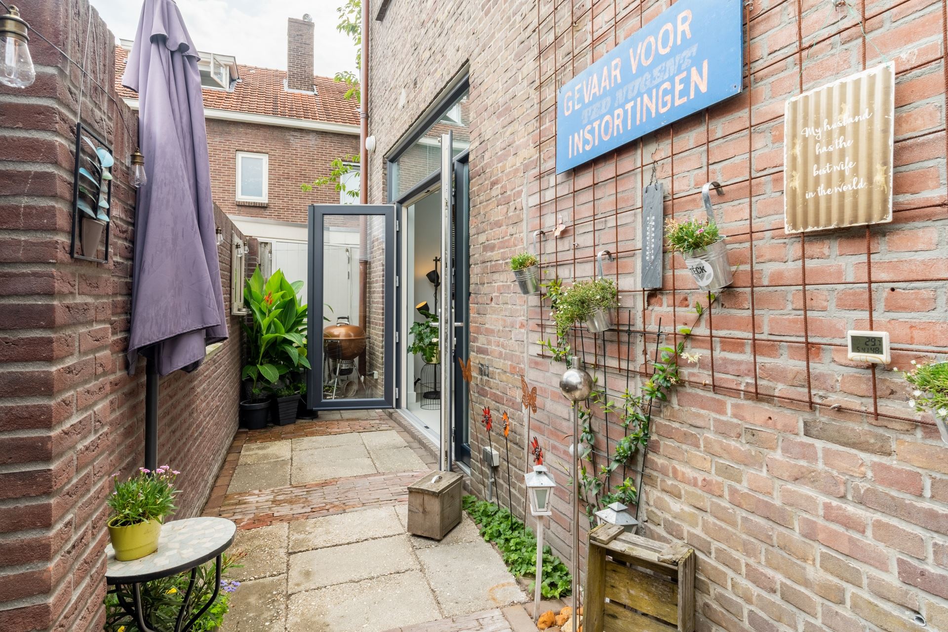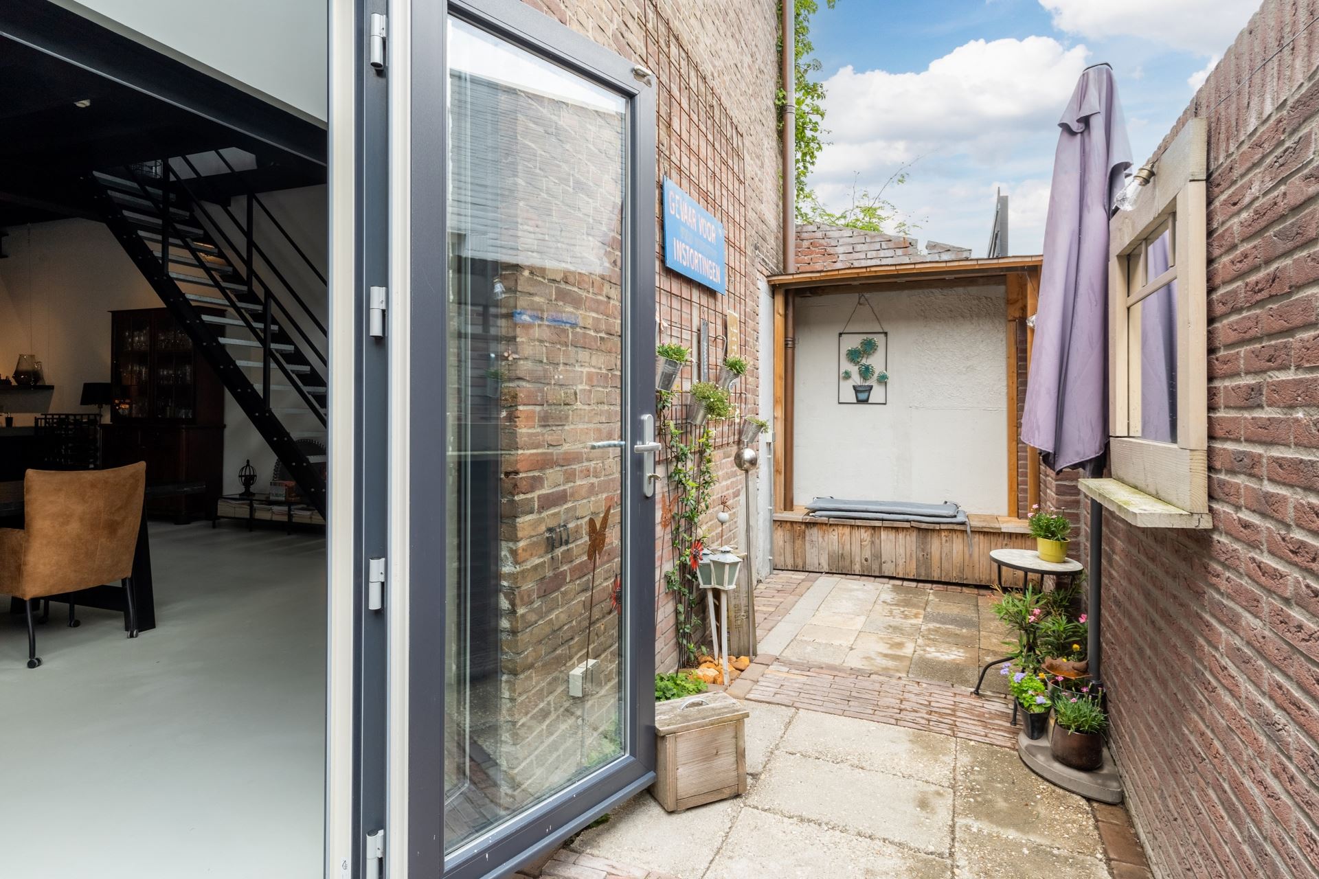 Middels openslaande tuindeuren, vanuit de woonkeuken, bereikbare plaats. De plaats is volledig bestraat en is een heerlijke toevoeging van de woonkeuken.
