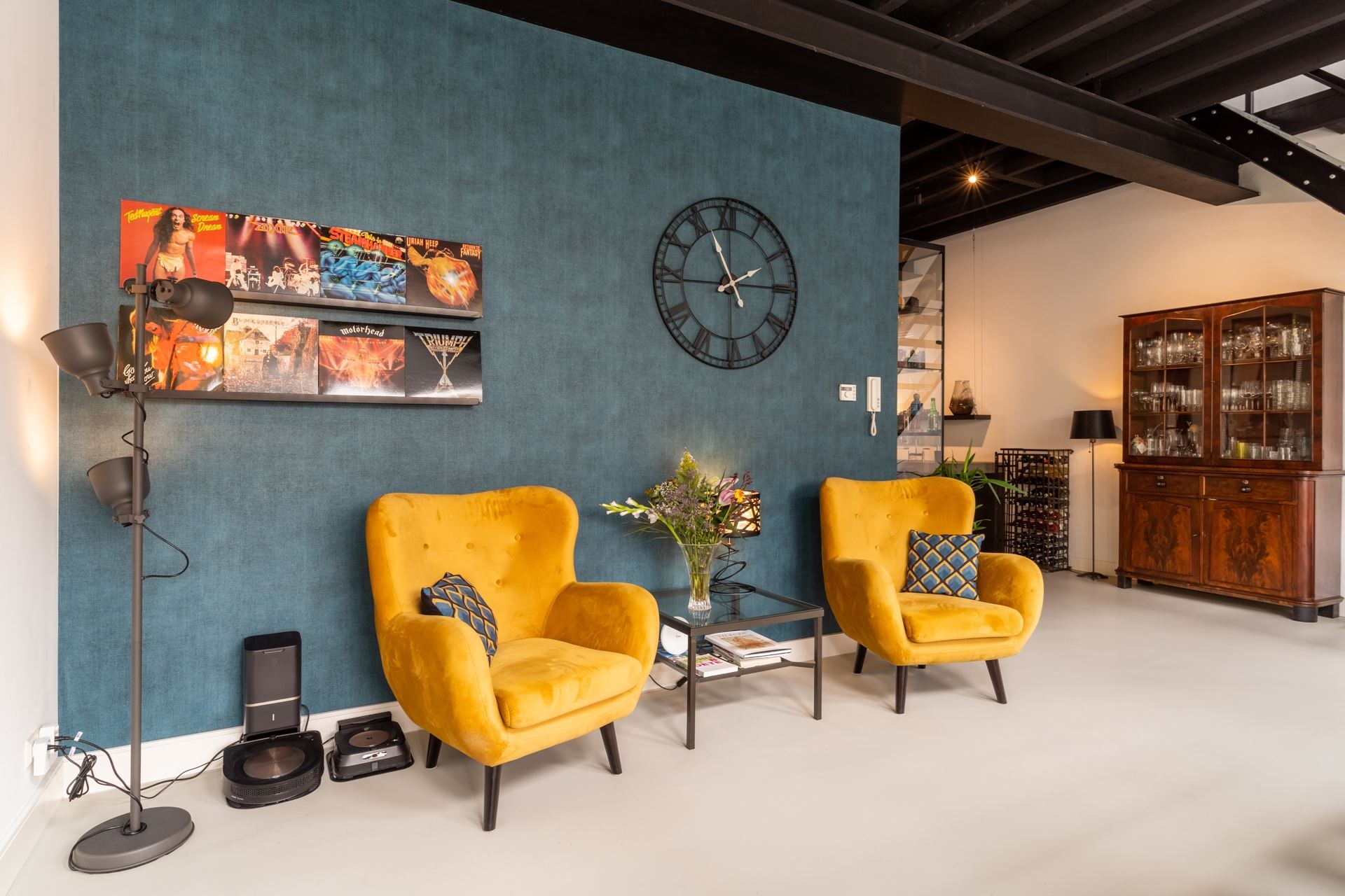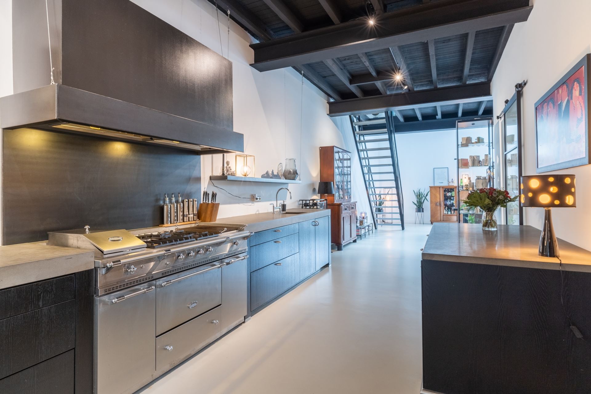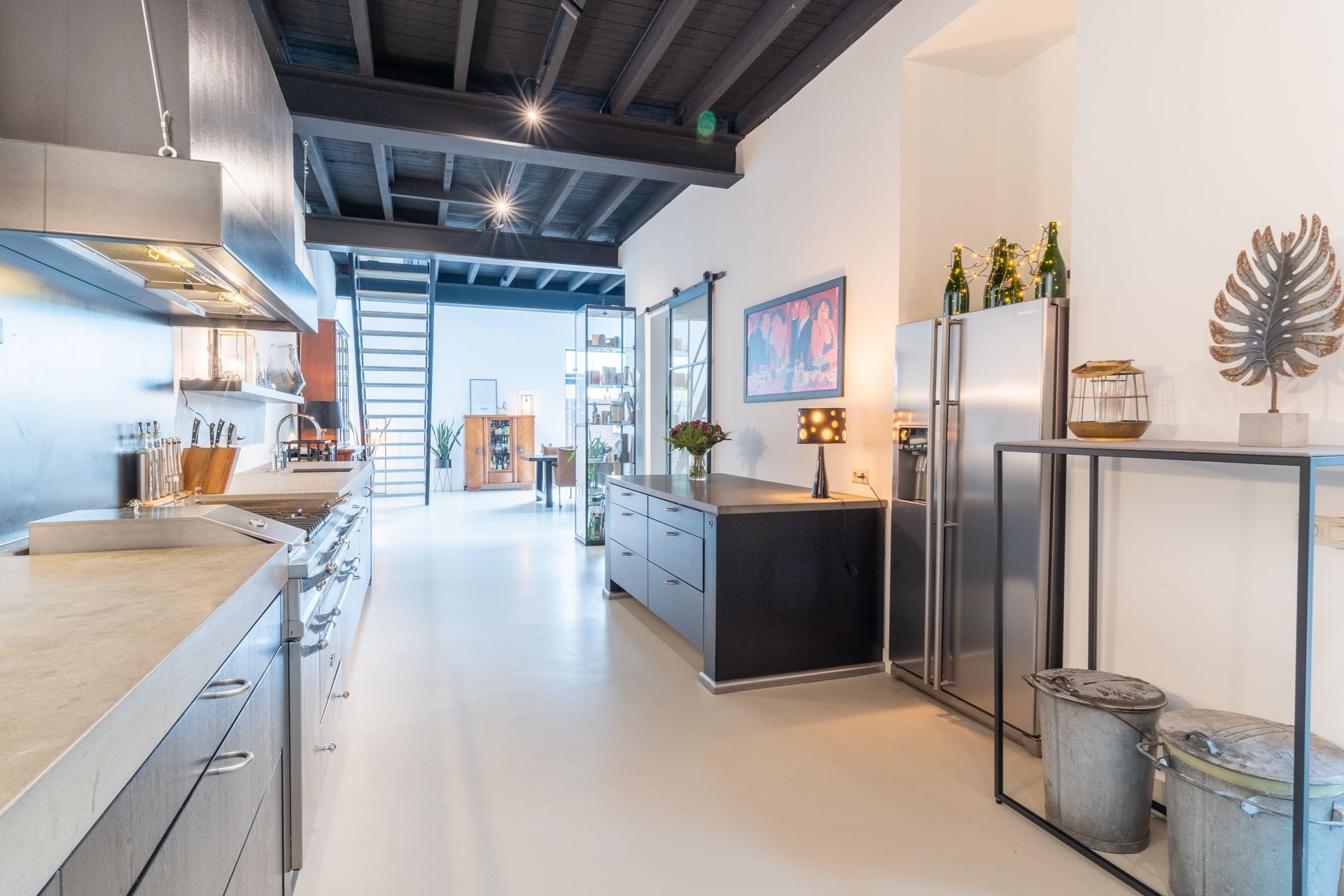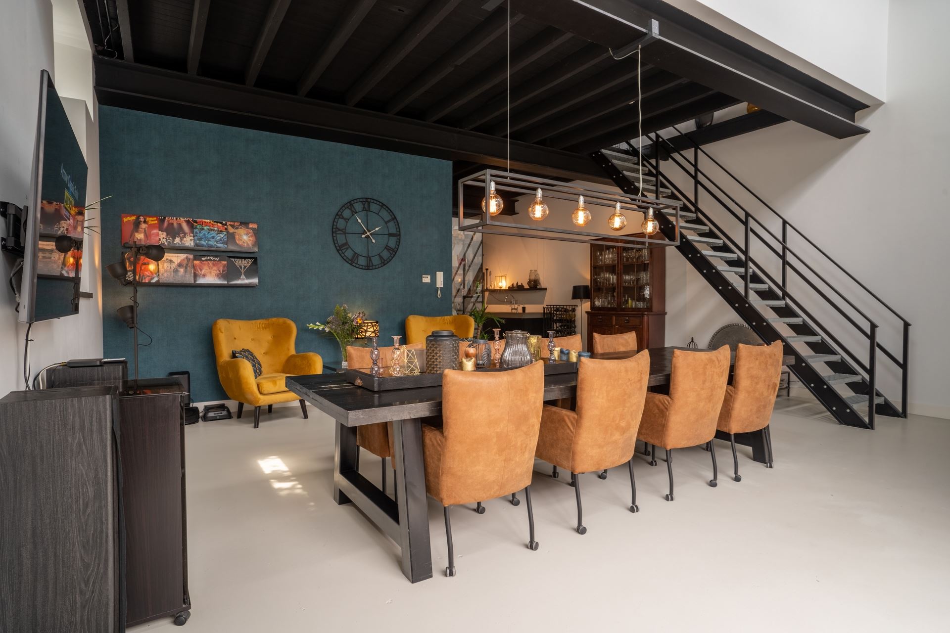 Het heerlijke eetgedeelte met robuuste stalen trap en openslaande tuindeuren naar de achtergelegen gezellige plaats. Vanuit de keuken de doorgang naar de volledig geïsoleerde garage, wasruimte voorzien van ketelopstelling, separate boiler en complete meterkast (twaalf groepen en drie aardlekschakelaars). Ideaal op de begane grond is de ruime slaapkamer met douche en wastafelmeubel. Natuurlijk is de begane grond voorzien van vloerverwarming en de betonvloer maakt het geheel helemaal af.