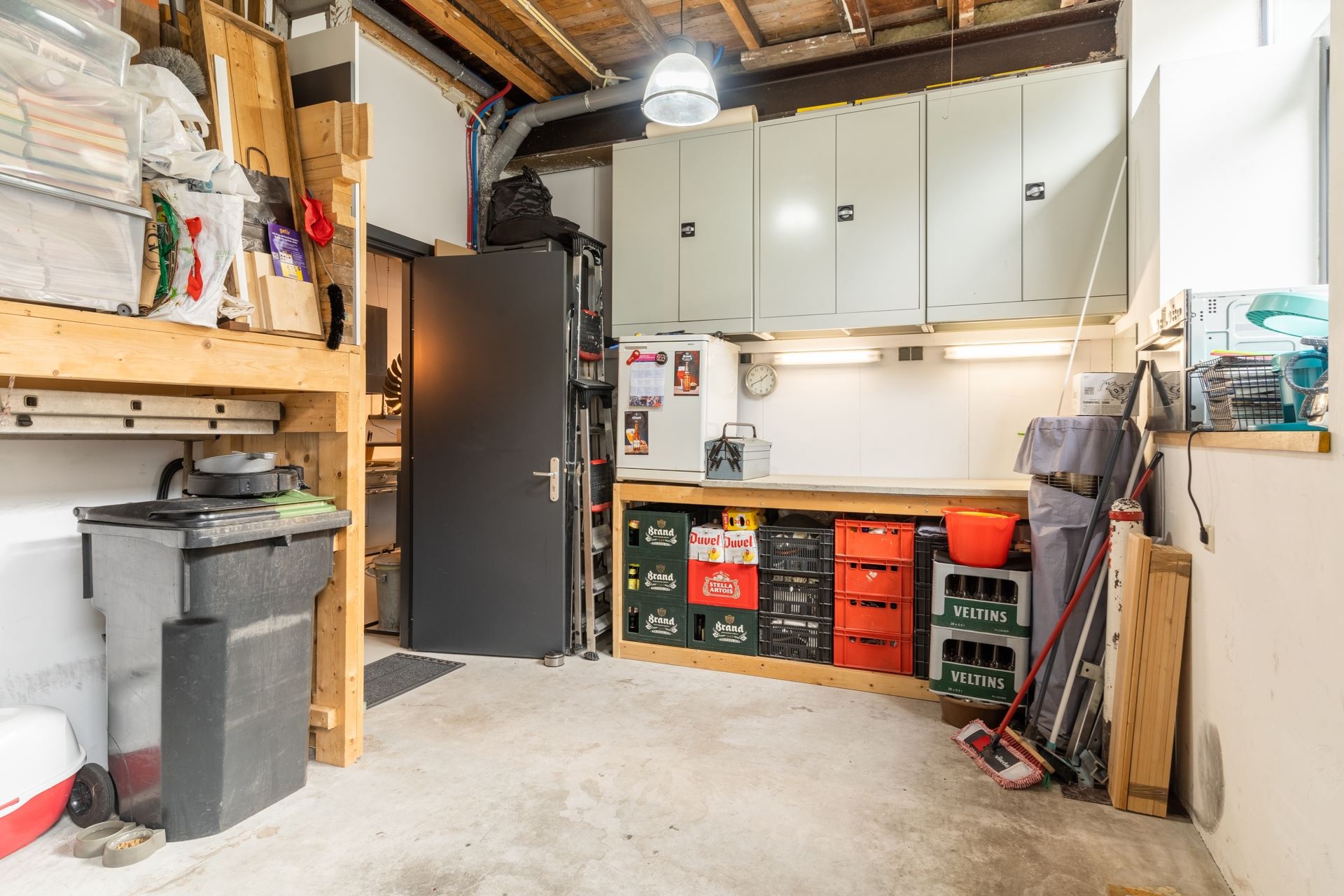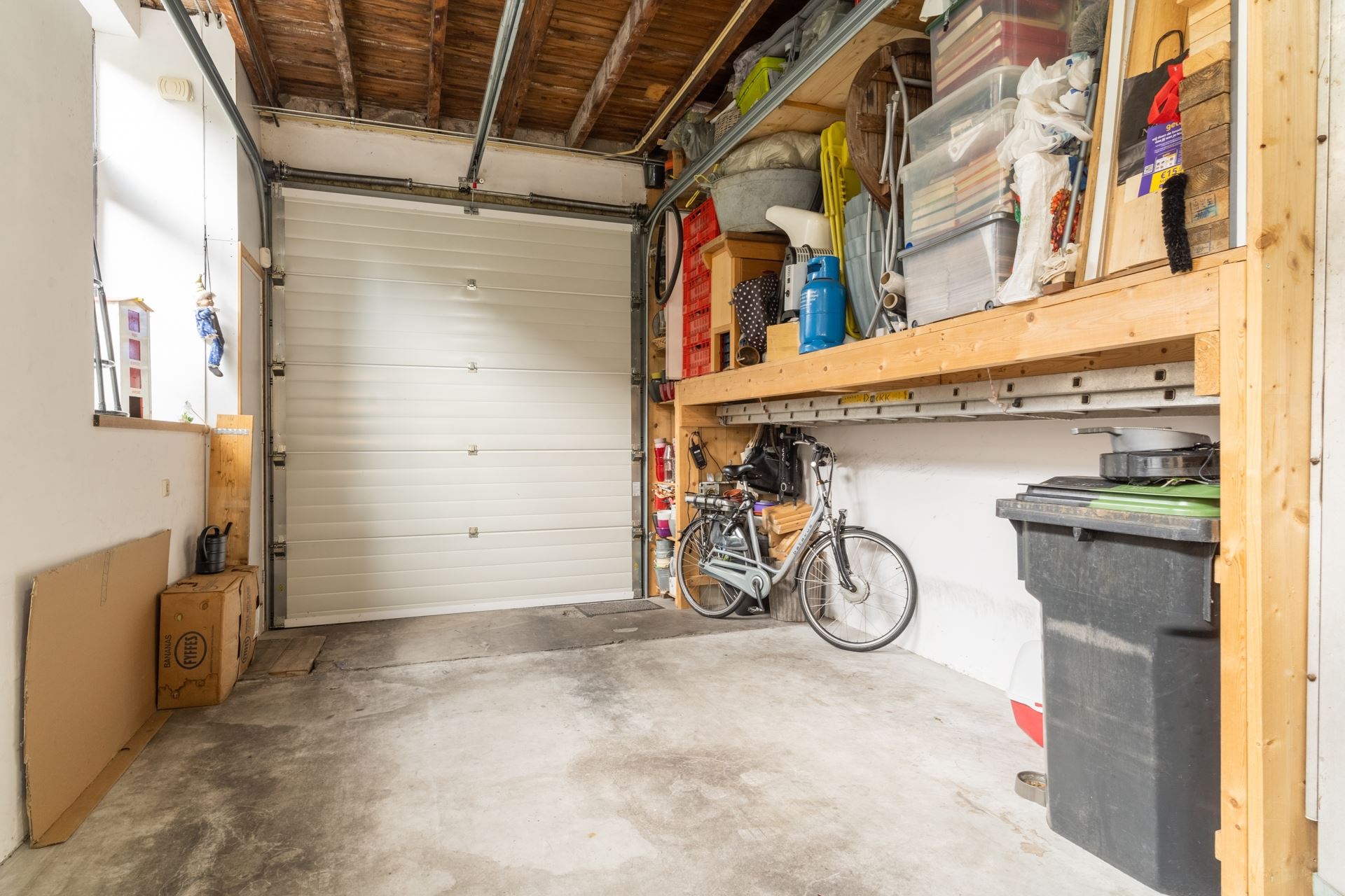 Zeer ruim (6.63x3.70) met elektrisch bedienbare roldeur. Plaats voor een grote auto en ruim genoeg om tevens dienst te doen als berging.