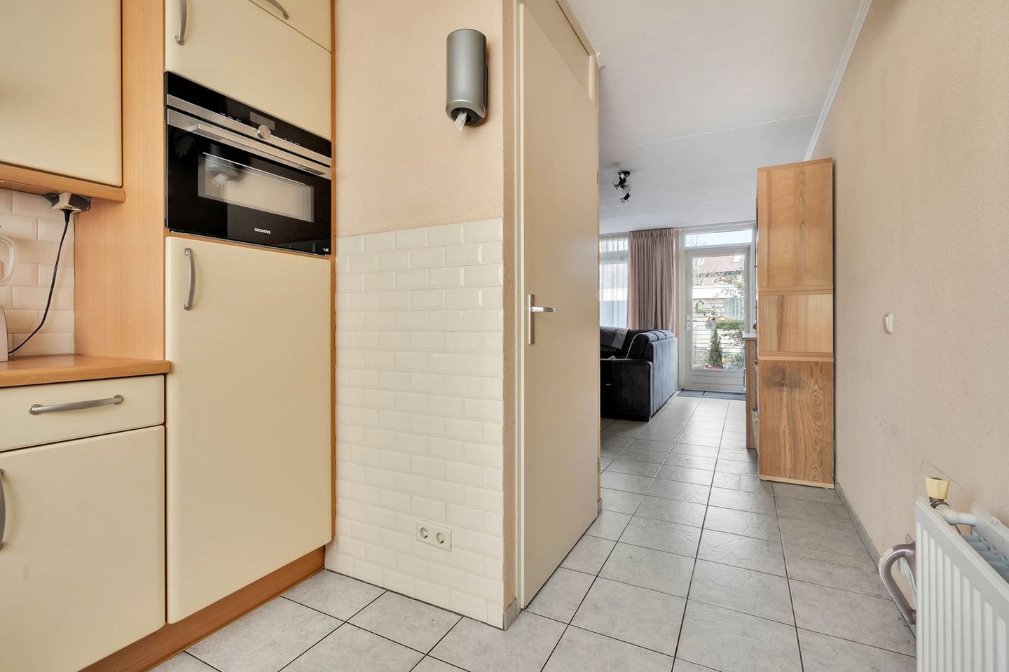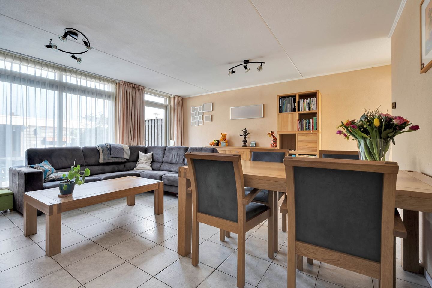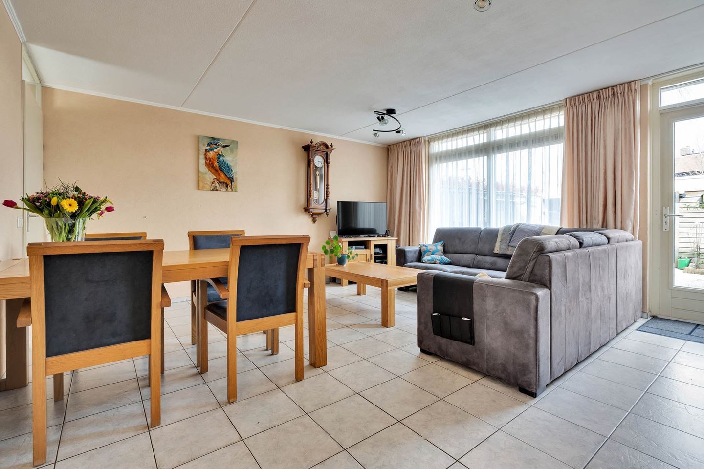 Vanuit de woonkamer is er een deur naar de achtergelegen tuin. De achterzijde van de woning is voorzien van een elektrisch zonnescherm.