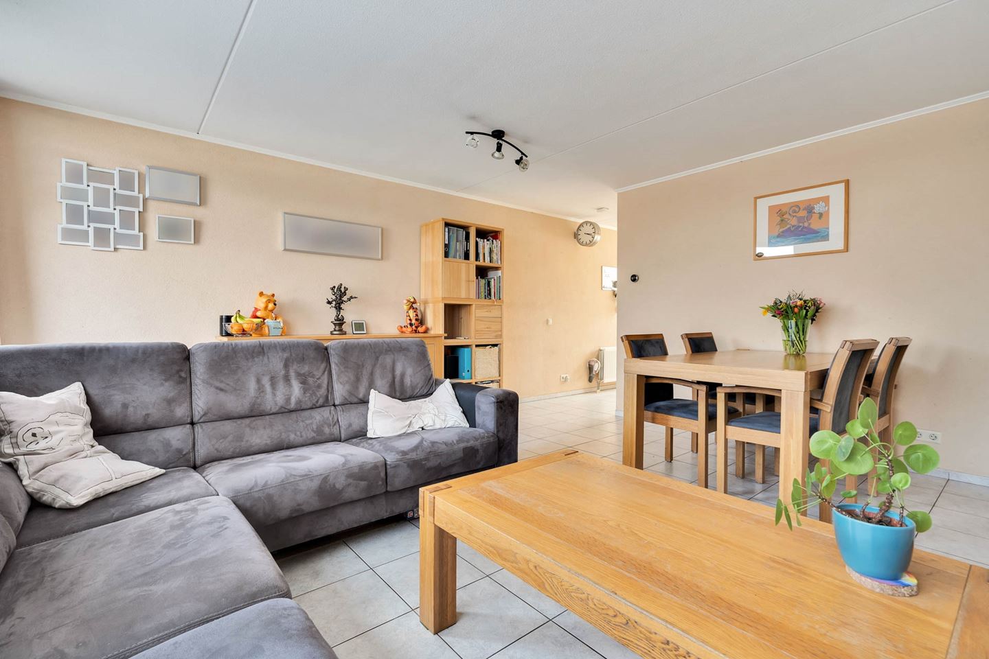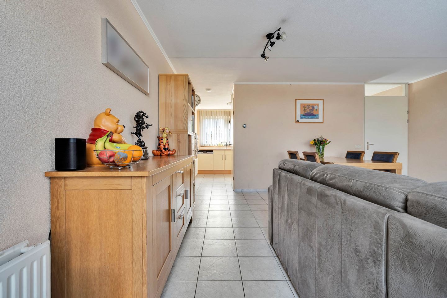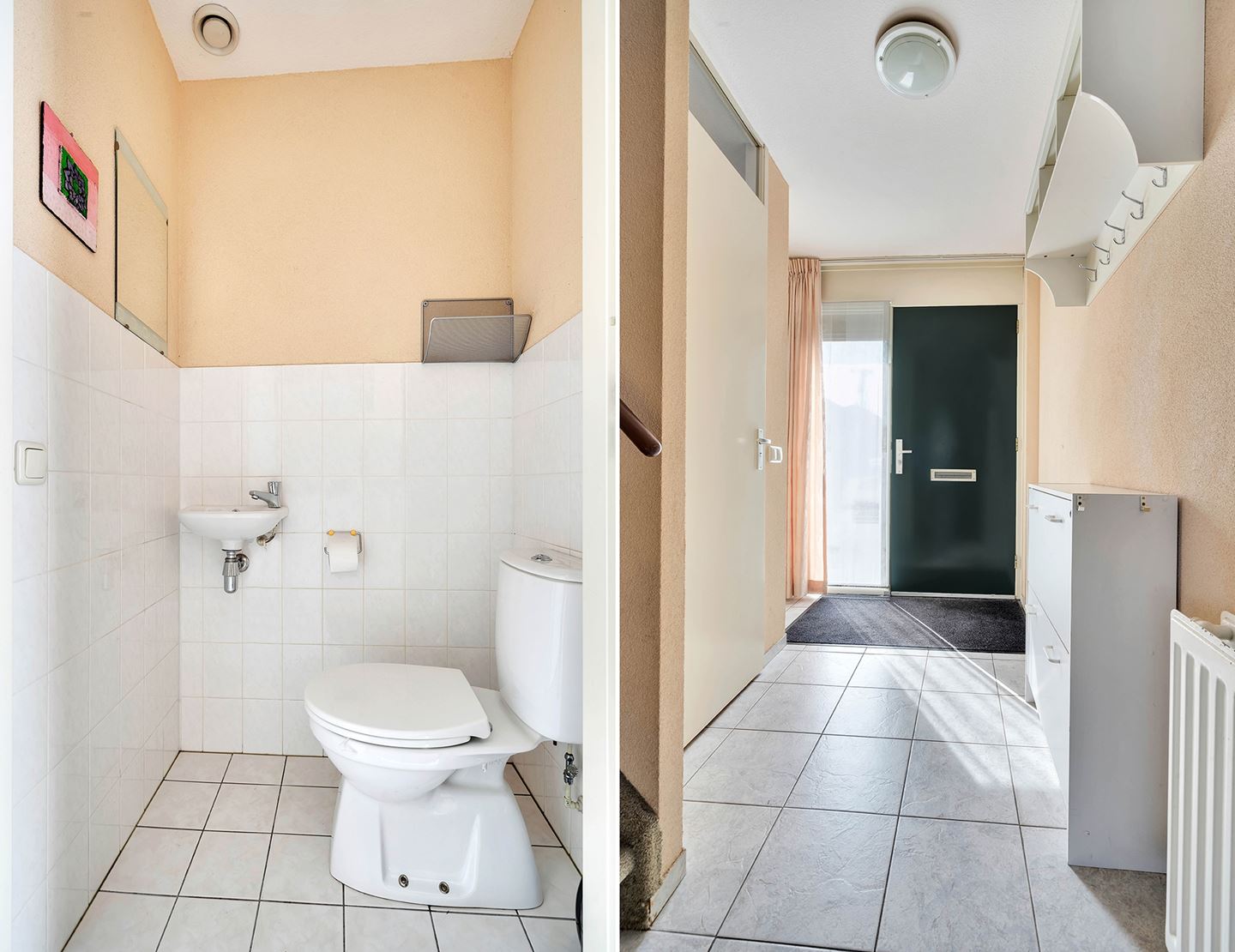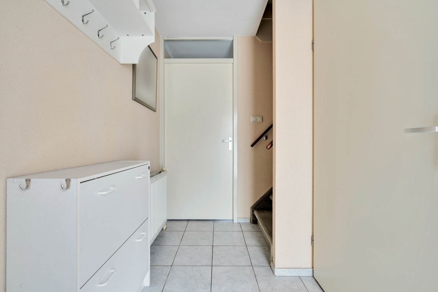 Hal met tegelvloer, meterkast, gedeeltelijk betegeld toilet met fonteintje en trapopgang. Ruime lichte woonkamer met tegelvloer en vaste kast.