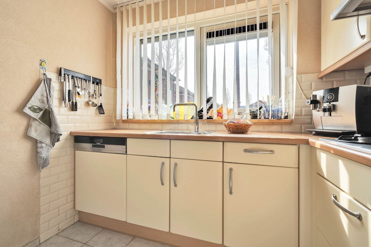 Vanuit de woonkamer is de open keuken te bereiken. Deze is voorzien van Siemens en Atag inbouwapparatuur waaronder gaskookplaat, koelkast, combimagnetron, vaatwasser en afzuigkap. De begane grond is voorzien van rolluiken, die via een afstandsbediening bediend kunnen worden.