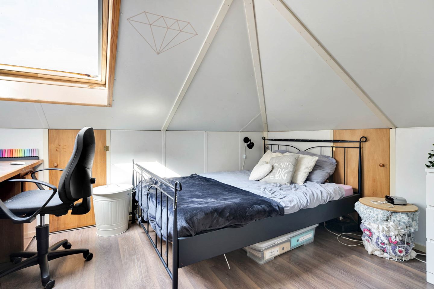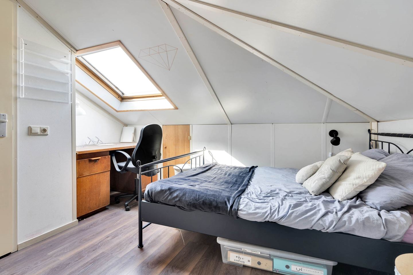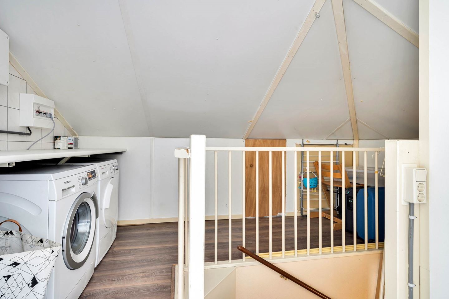 Via vaste trap bereikbare zolder voorzien van voorzolder met aansluiting wasmachine en droger. Tevens is een extra slaapkamer met velux dakraam gecreëerd. De zolder is rondom voorzien van schotten. Op het dak zijn 7 zonnepanelen geplaatst.