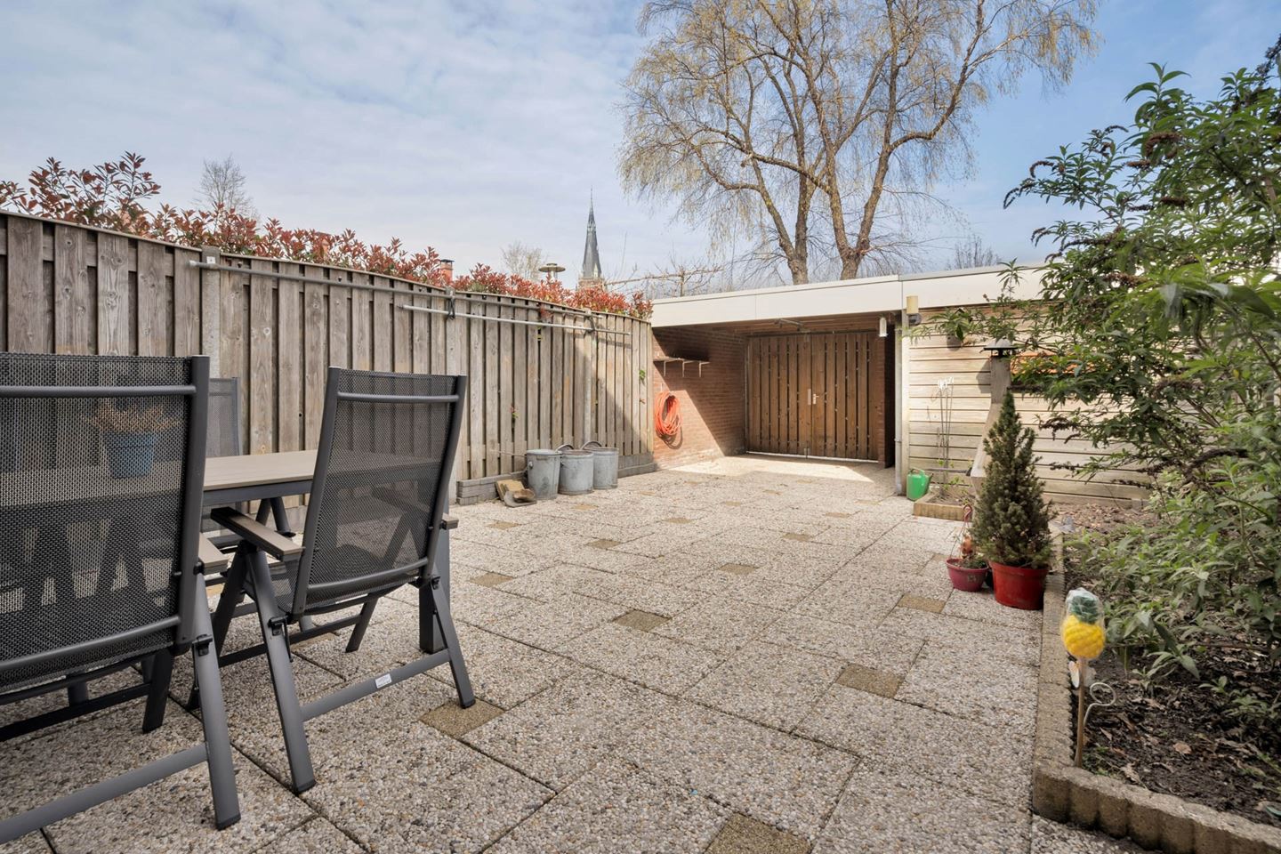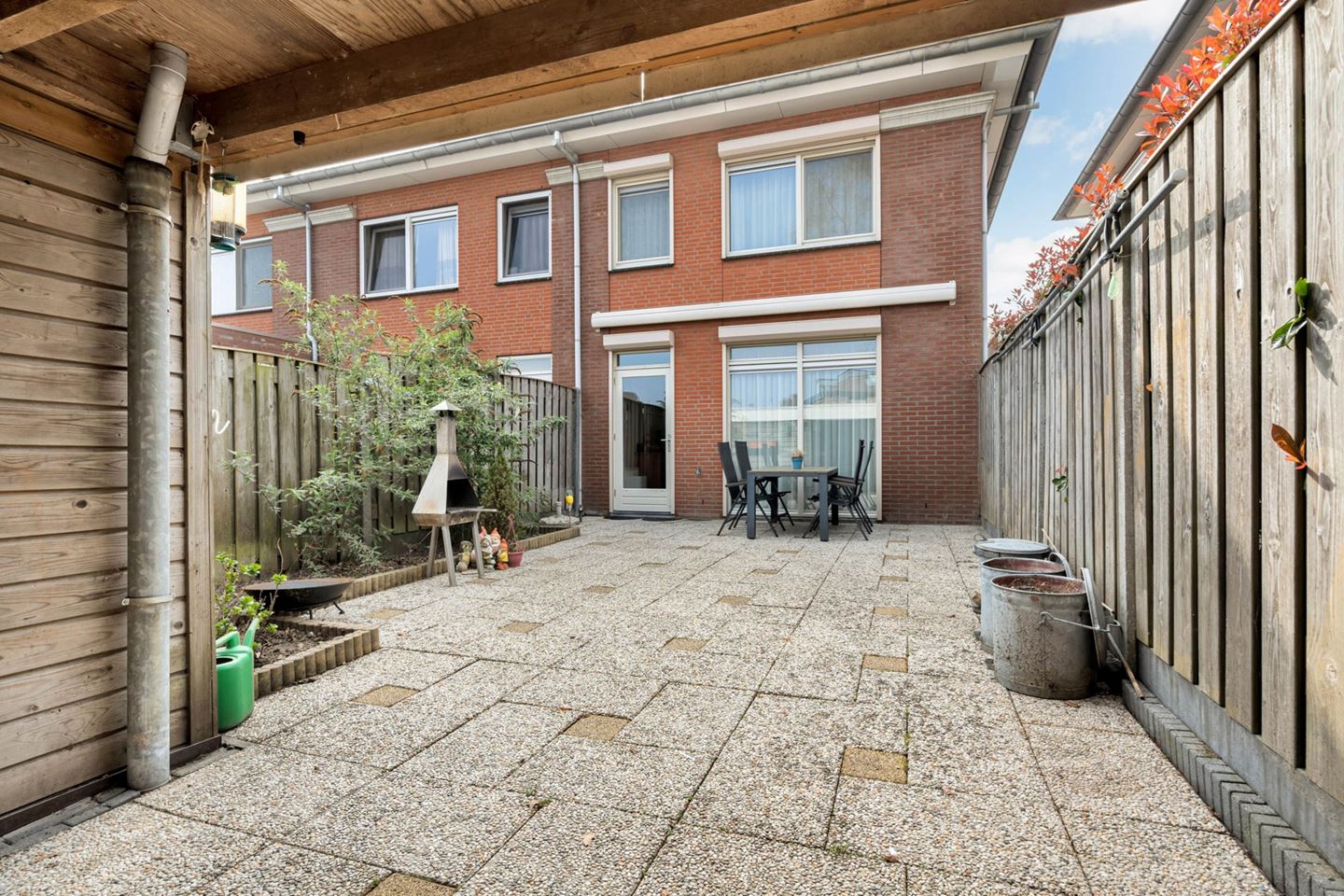 De achtertuin is grotendeels bestraat en is voorzien van elektra en een buitenkraan.