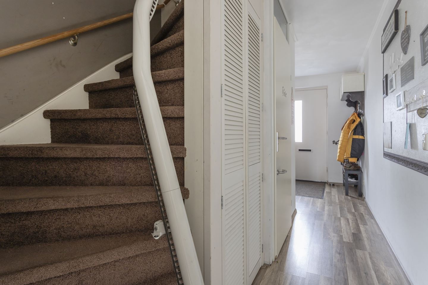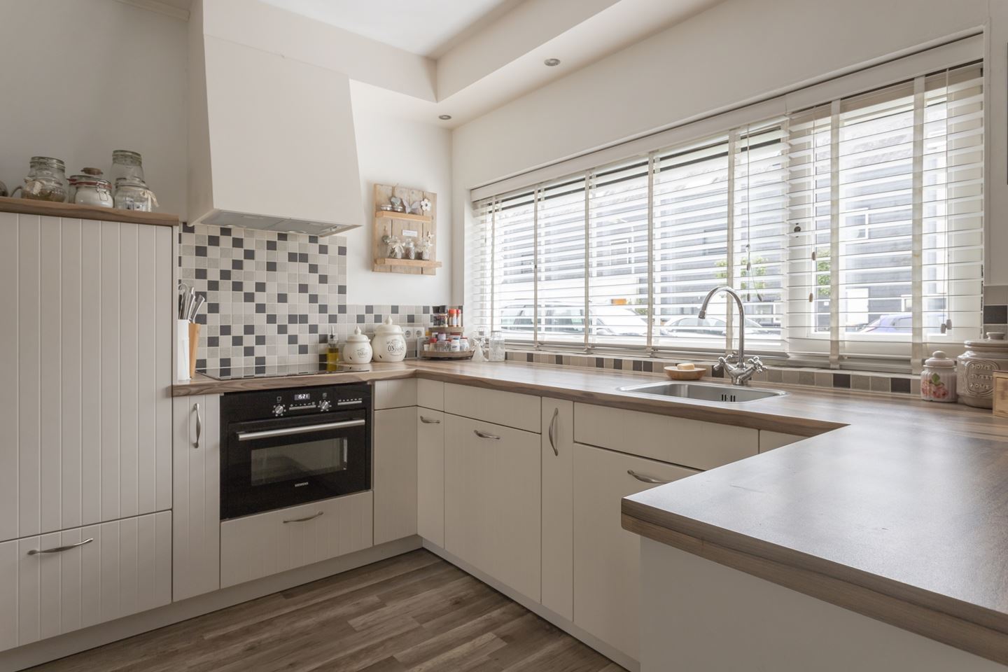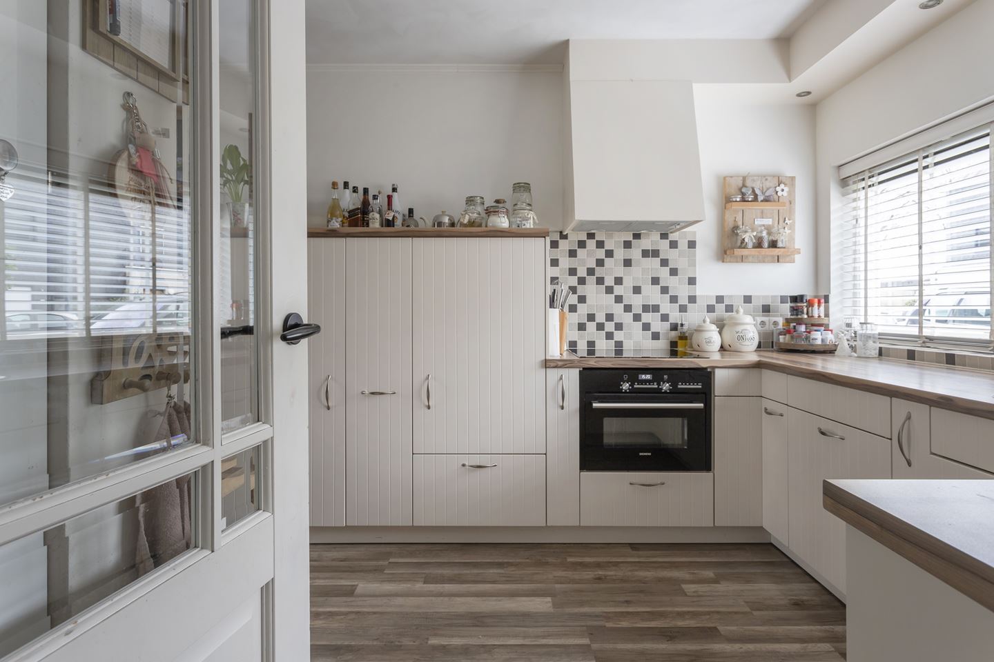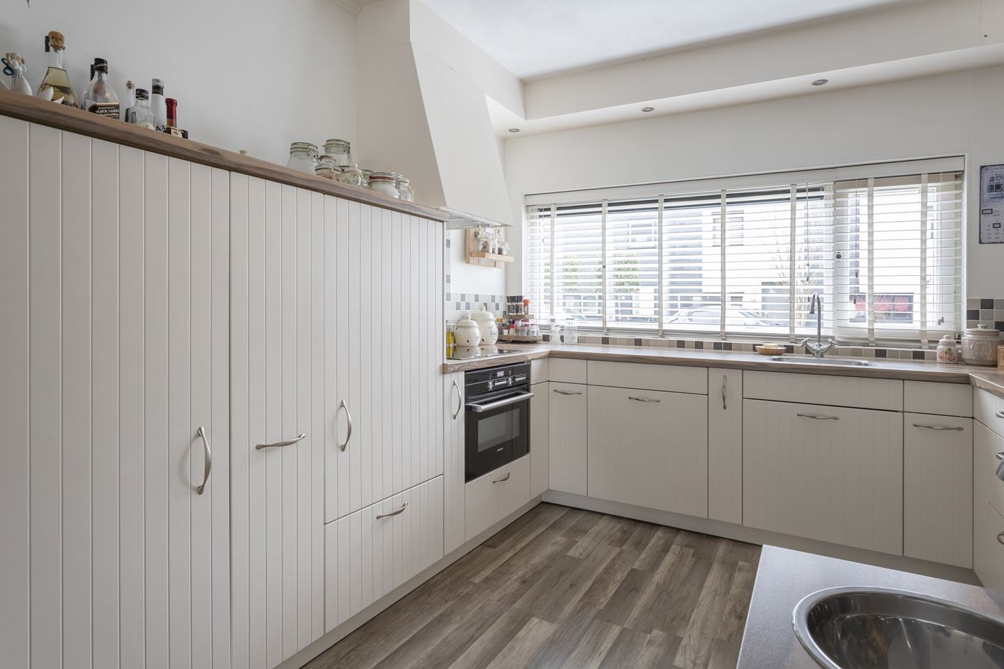 Gang/entree met meterkast, toiletruimte en bergkast. De speelse en tuingerichte woonkamer is sfeervol afgewerkt met een laminaat vloer en aan de voorkant een moderne keuken in U-opstelling. De keuken heeft de volgende kenmerken: Apothekerskast, 2 kruidenkasten, 4-pits inductie kookplaat, schouwafzuiging direct naar buiten, vaatwasser, koelkast en vrieskast apart en combi-oven. Alle apparatuur is van siemens. Vanuit de hal is de trapopgang naar de eerste verdieping bereikbaar.