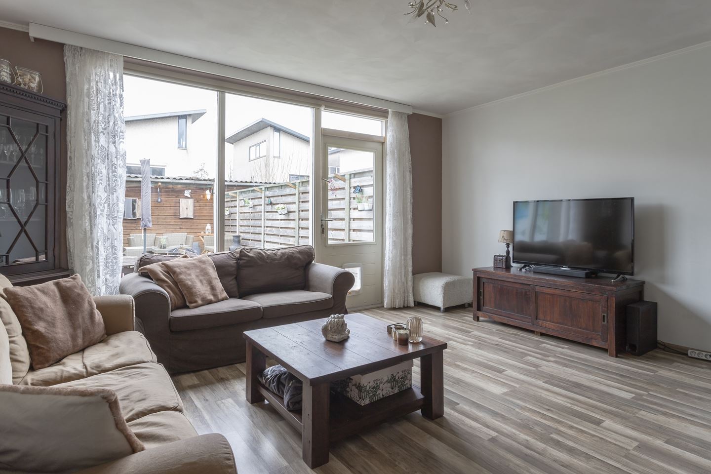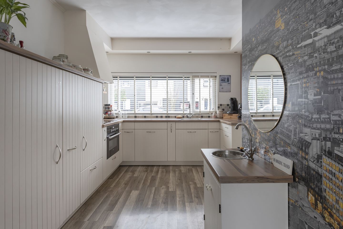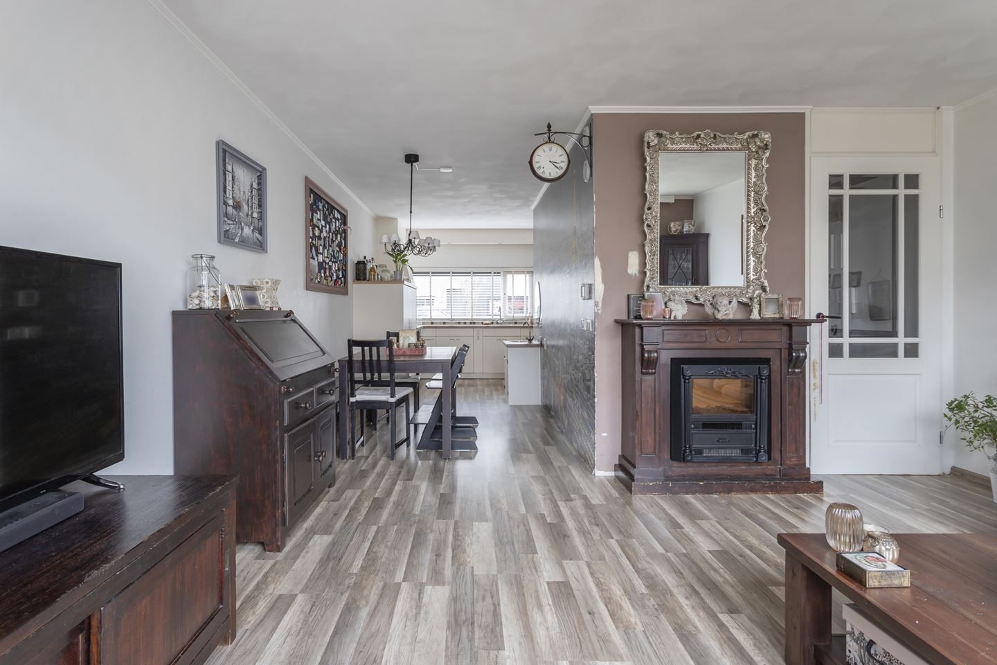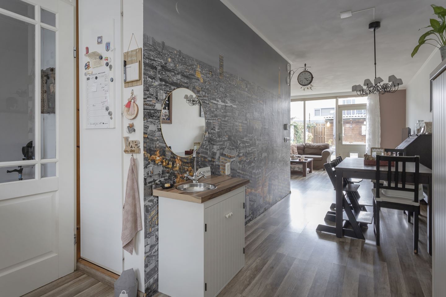Gang/entree met meterkast, toiletruimte en bergkast. De speelse en tuingerichte woonkamer is sfeervol afgewerkt met een laminaat vloer en aan de voorkant een moderne keuken in U-opstelling. De keuken heeft de volgende kenmerken: Apothekerskast, 2 kruidenkasten, 4-pits inductie kookplaat, schouwafzuiging direct naar buiten, vaatwasser, koelkast en vrieskast apart en combi-oven. Alle apparatuur is van siemens. Vanuit de hal is de trapopgang naar de eerste verdieping bereikbaar.