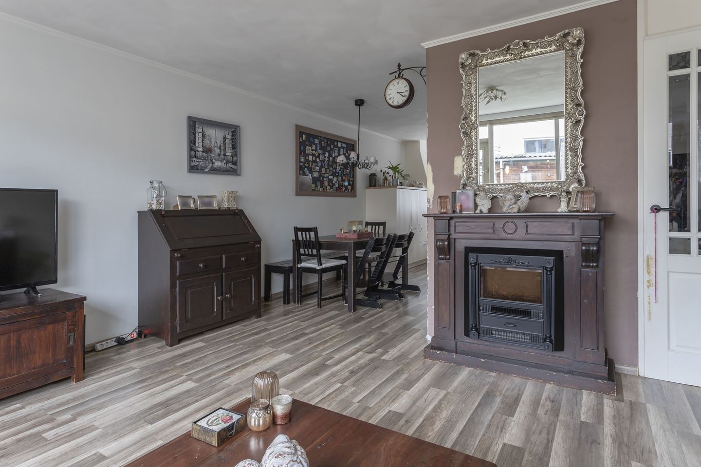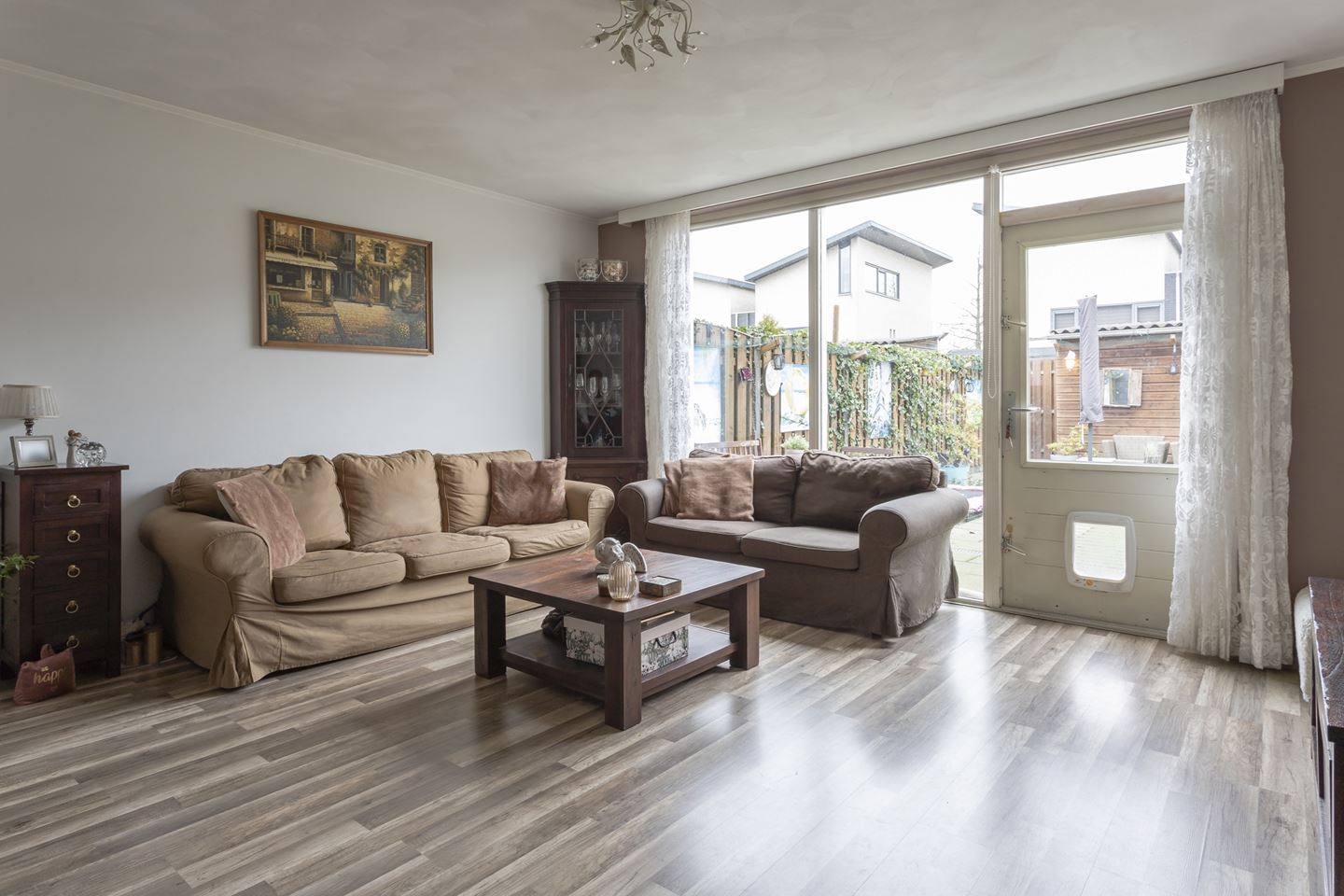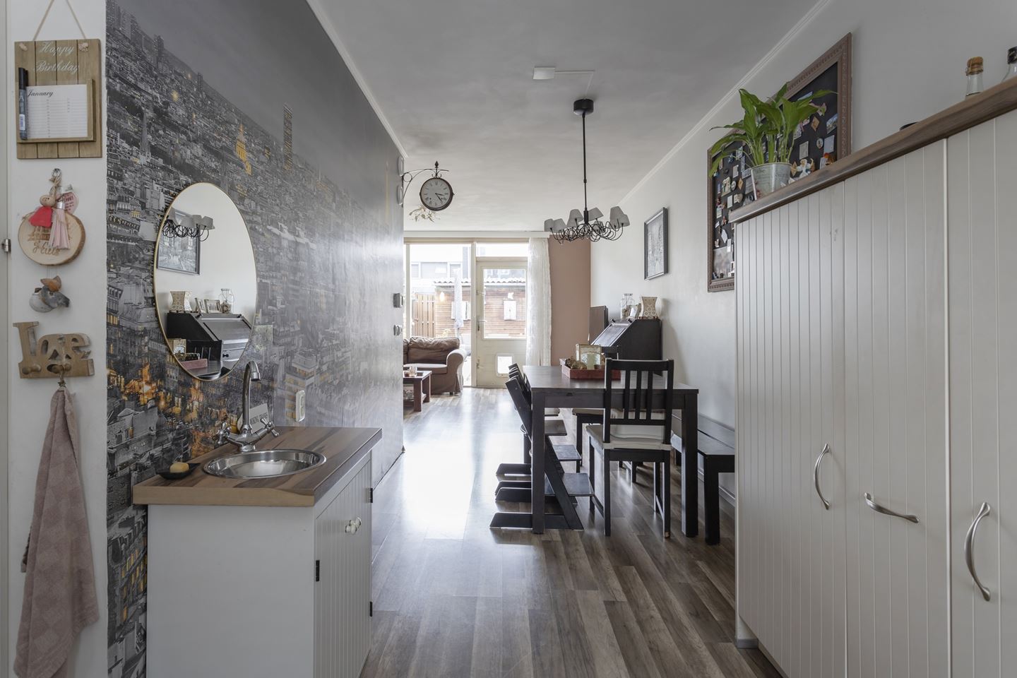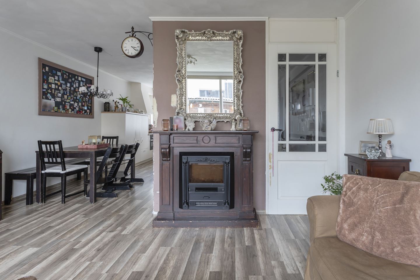 Gang/entree met meterkast, toiletruimte en bergkast. De speelse en tuingerichte woonkamer is sfeervol afgewerkt met een laminaat vloer en aan de voorkant een moderne keuken in U-opstelling. De keuken heeft de volgende kenmerken: Apothekerskast, 2 kruidenkasten, 4-pits inductie kookplaat, schouwafzuiging direct naar buiten, vaatwasser, koelkast en vrieskast apart en combi-oven. Alle apparatuur is van siemens. Vanuit de hal is de trapopgang naar de eerste verdieping bereikbaar.