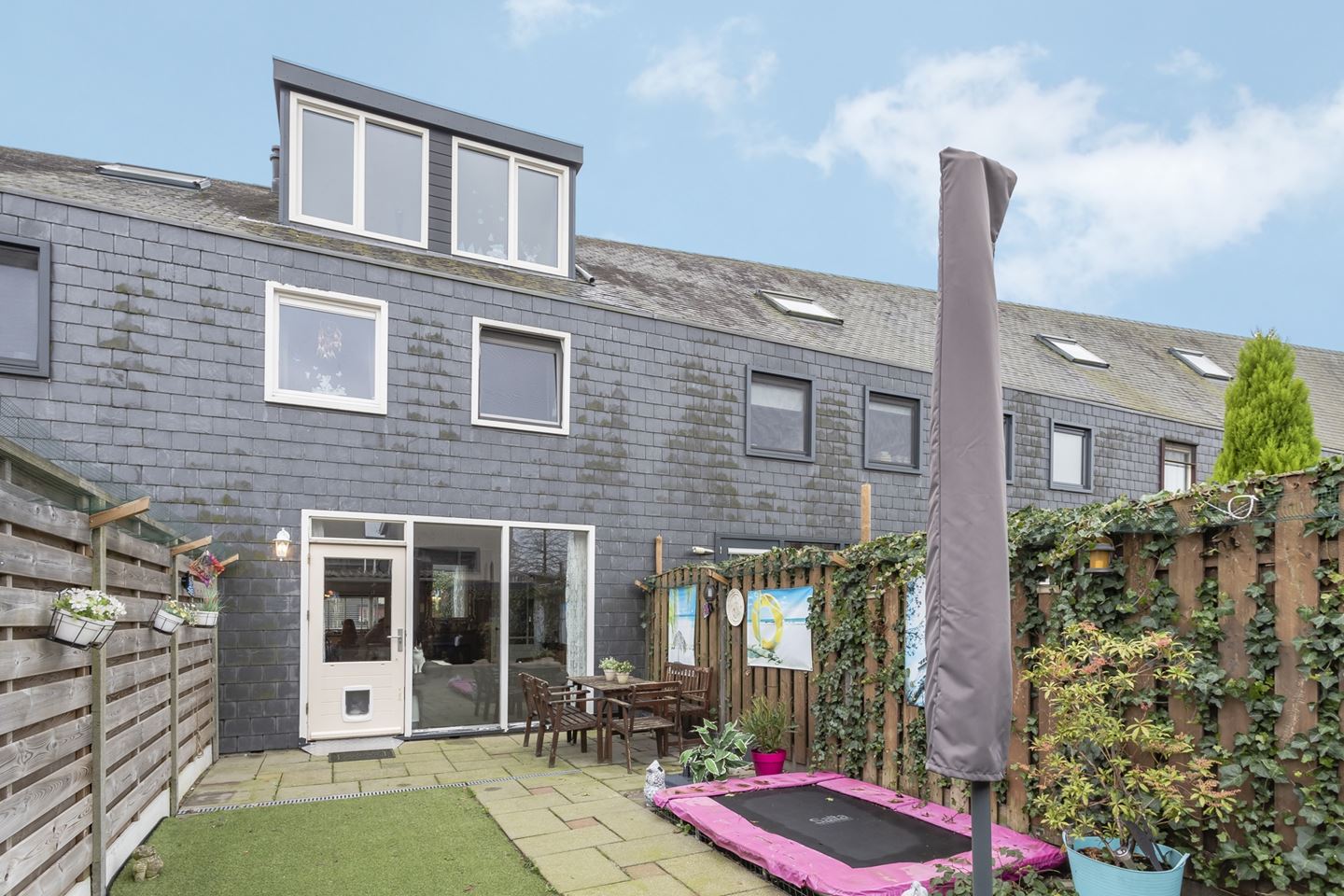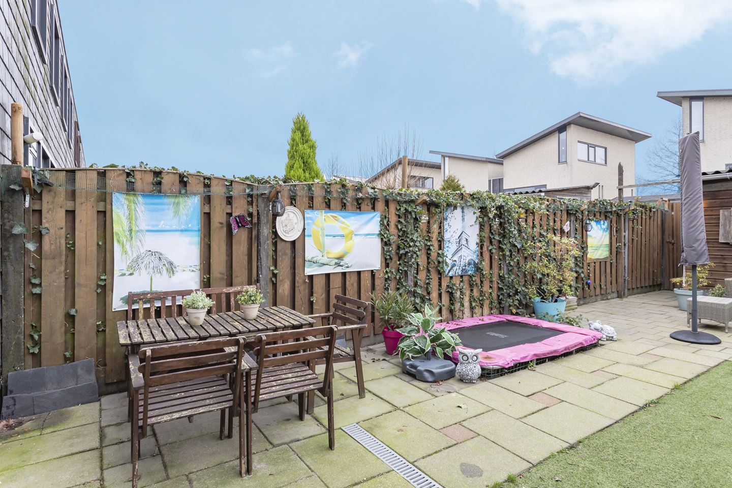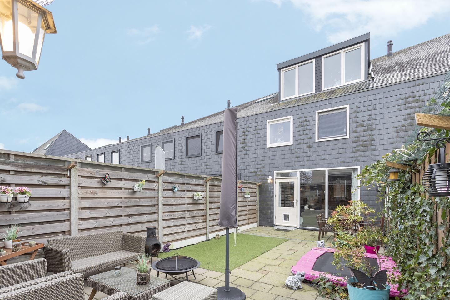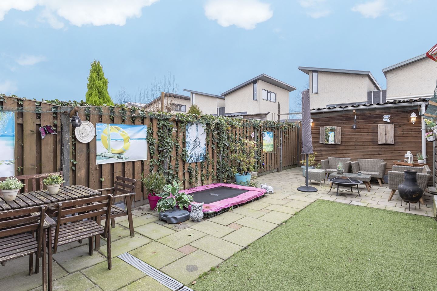 Voortuin is voorzien van kunstgras. Achtertuin met sierbestrating, kunstgras, houten schutting en vrijstaande houten berging, welke is voorzien van een achterom en elektra.