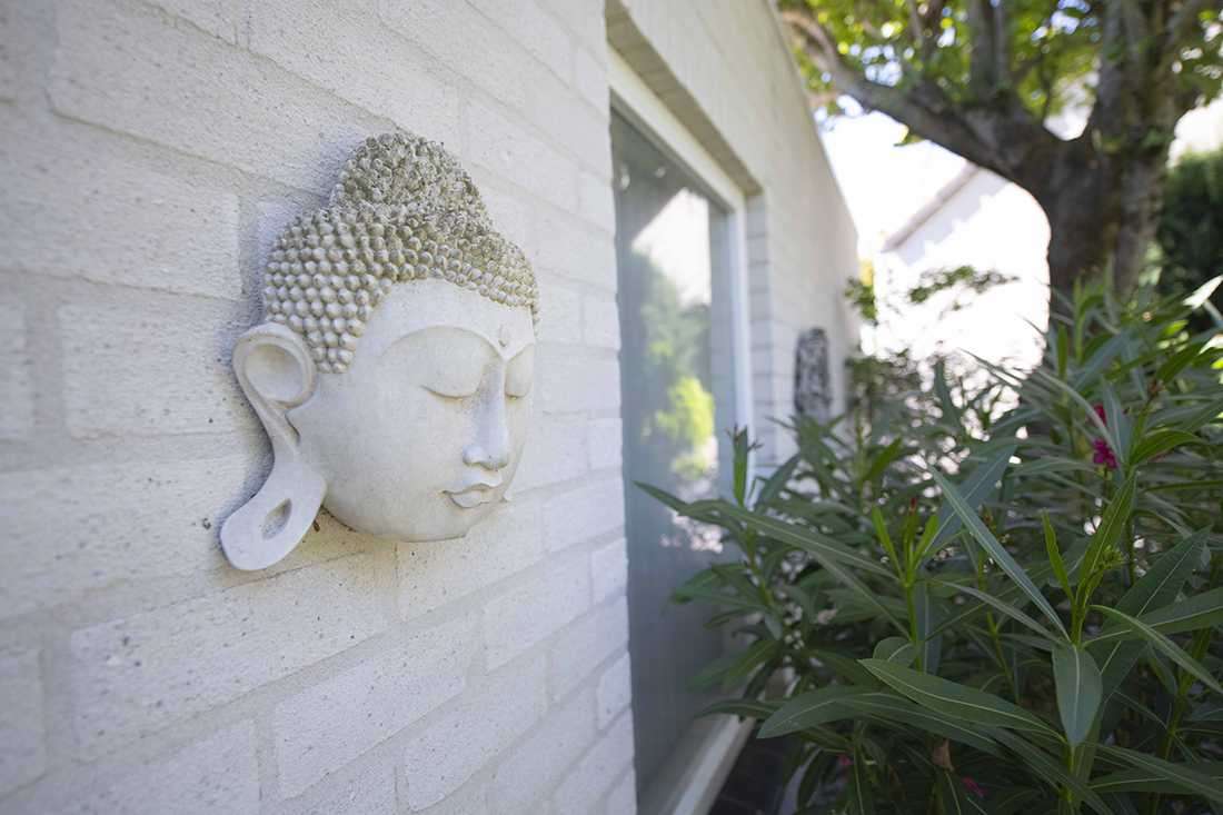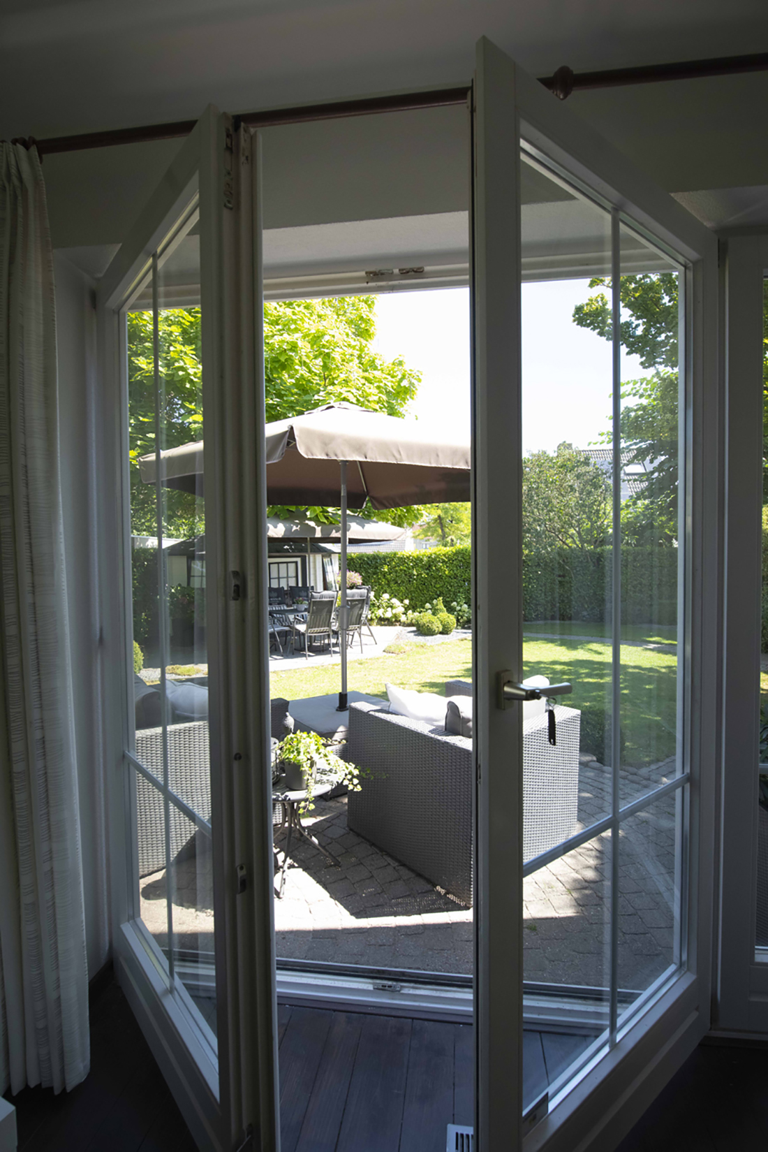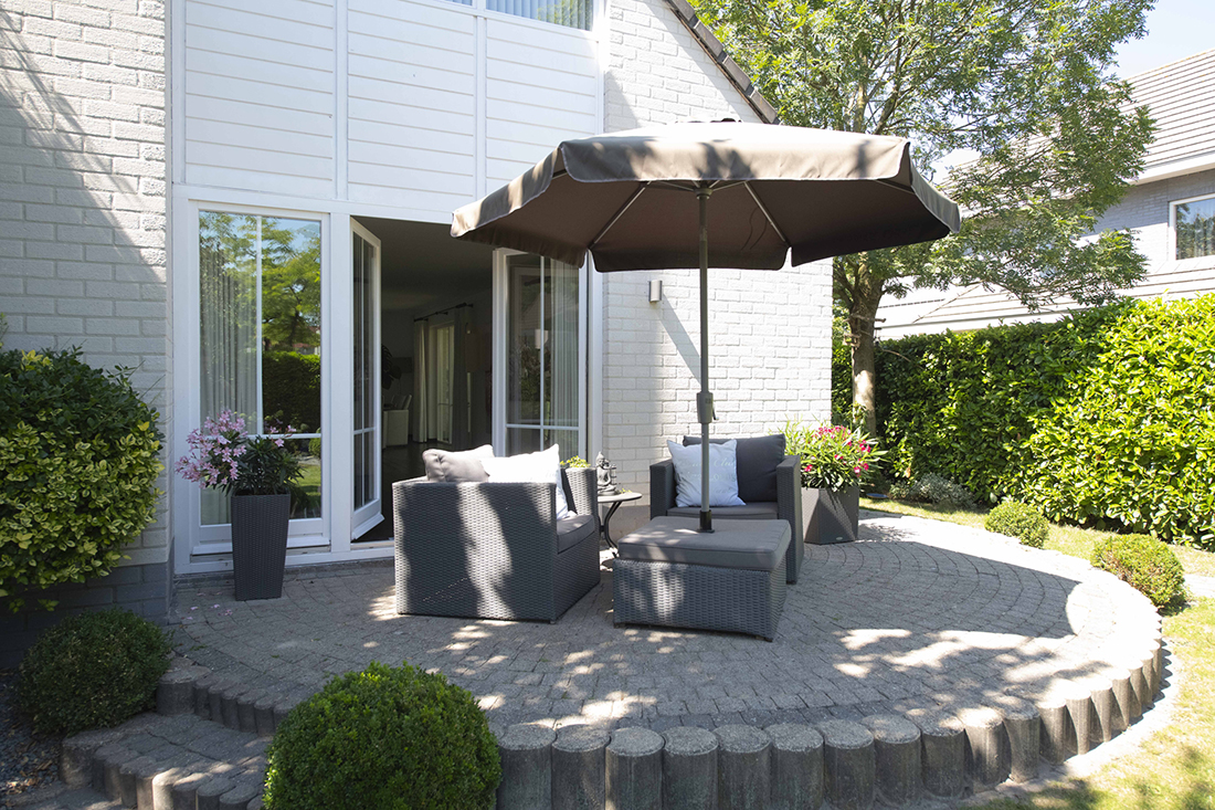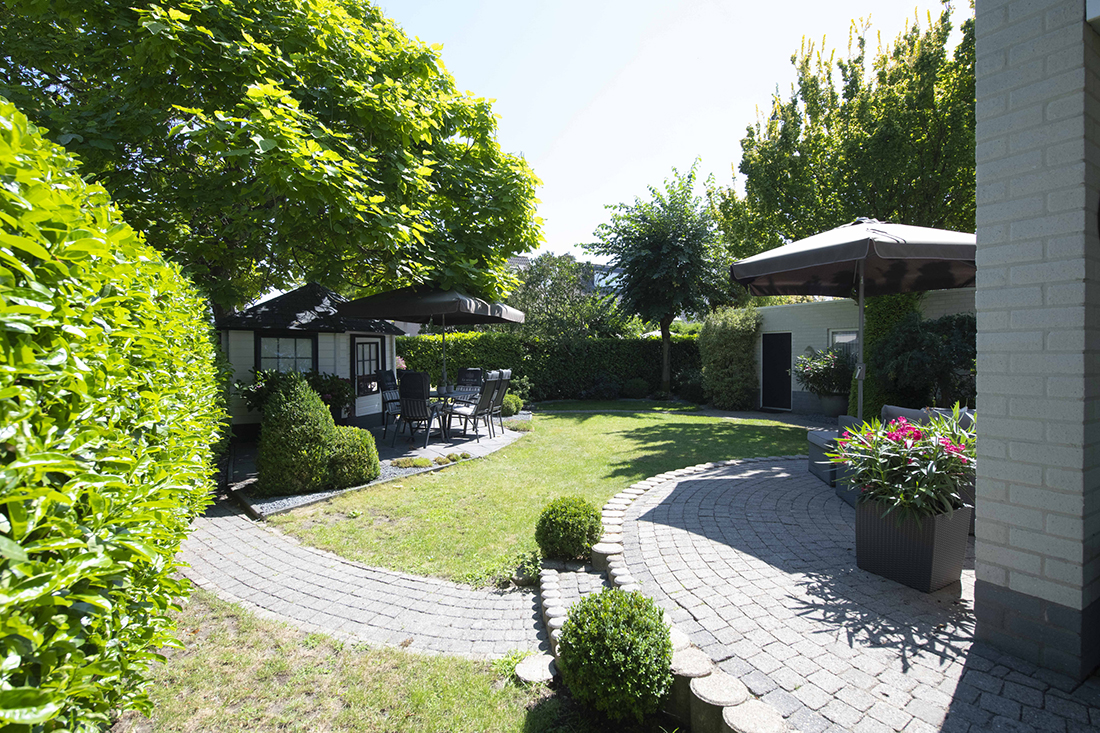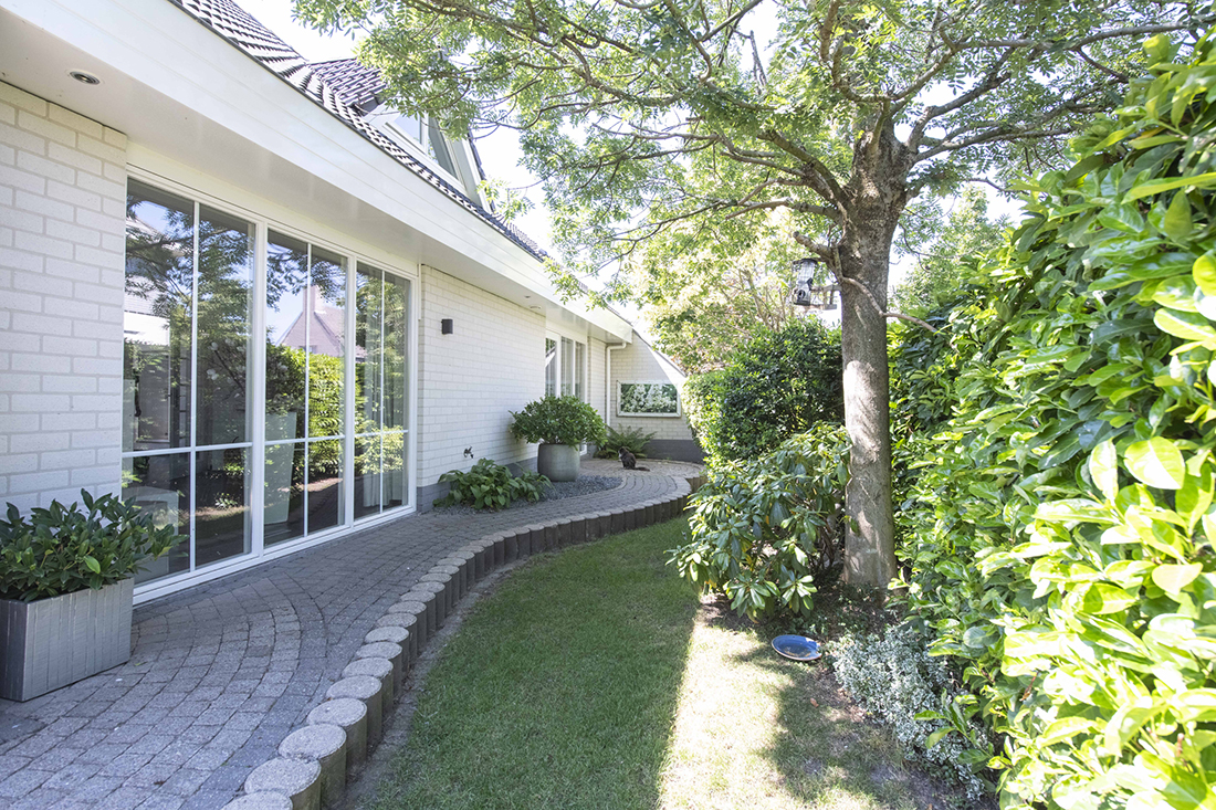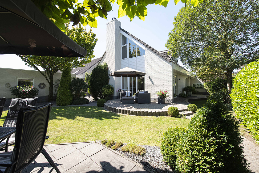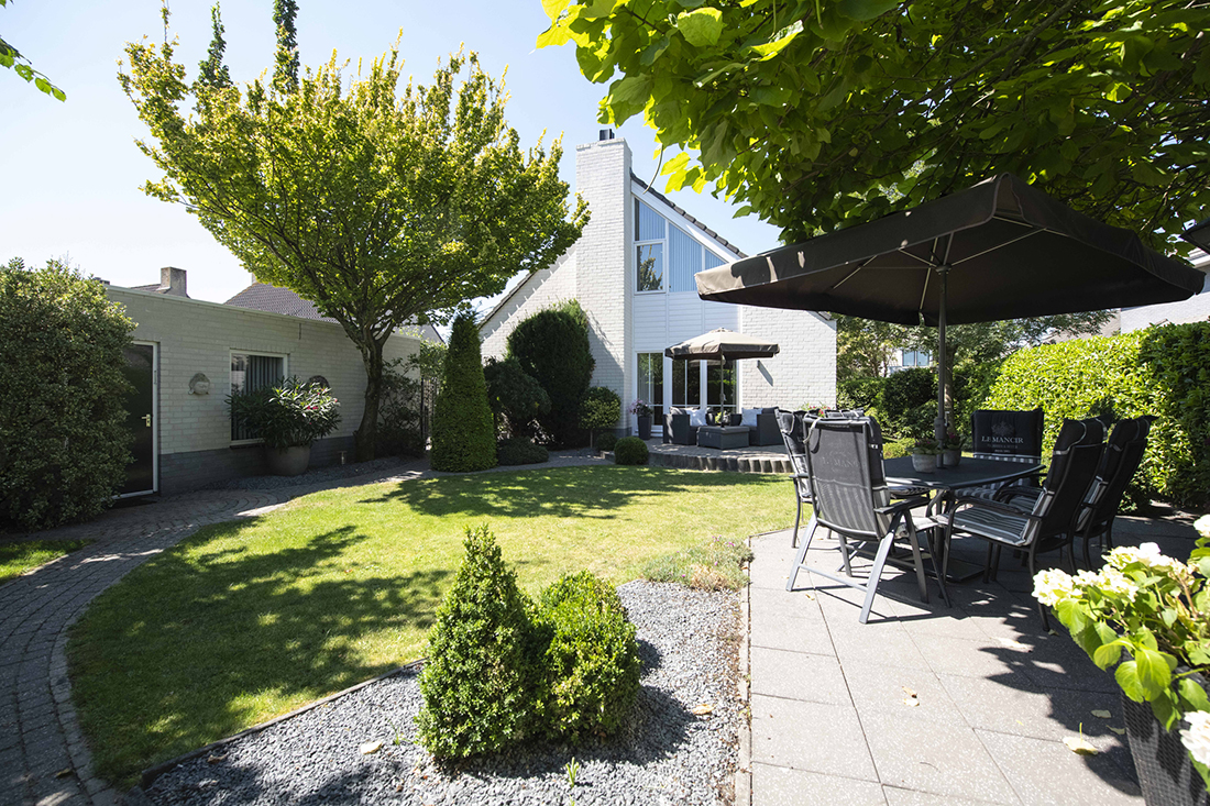 Vanuit de woonkamer is er toegang tot de heerlijke achtertuin. Deze is geheel rondom de woning gelegen. Er zijn 2 terrassen, gazon, mooie beplanting, prachtige bomen en een houten tuinhuis. Een tuin die sfeer en rust uitstraalt zonder achterburen.