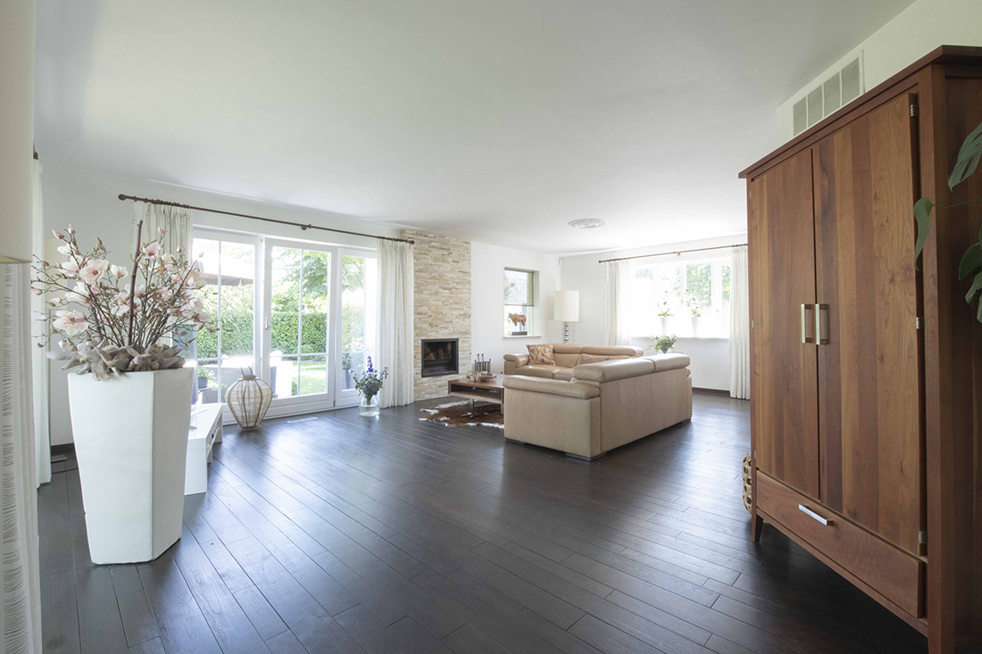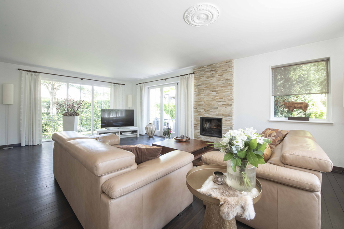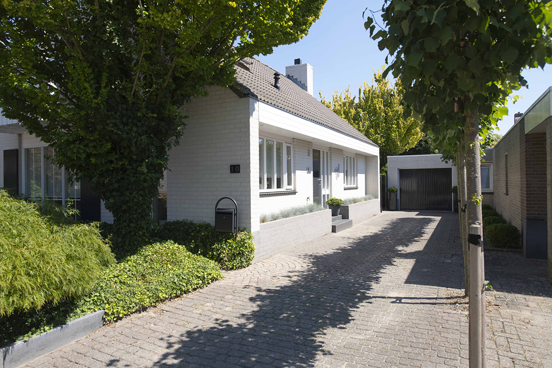 De voortuin is fraai aangelegd en er is een ruime oprit naar de garage. Op de oprit kunnen zeker 3 auto’s. Als we de woning binnen treden dan staan we direct in de hal met open trap. Vanuit de hal zijn de toiletruimte, de meterkast, en de woonkamer bereikbaar. De woonkamer is heel sfeervol, mede door de open haard en heeft bijzonder veel leefruimte. De woonkamer is voorzien van een houten vloer. De woning is mede ontworpen door een architect wat zeker zichtbaar is aan de indeling. De muur bij de eethoek is schuin en komt uit op de keuken. De keuken is ruim en licht van kleur met koken schuin in de hoek. De inrichting bestaat uit een inductie kookplaat, RVS afzuigkap, combi-oven, koelkast en een kunststof aanrechtblad. Vanuit de keuken is de bijkeuken bereikbaar. Hier zijn de aansluitingen voor vaatwasser, wasmachine en droger aanwezig. De stenen garage staat los van het huis en is verdiept, dus veel berg- of parkeerruimte.
